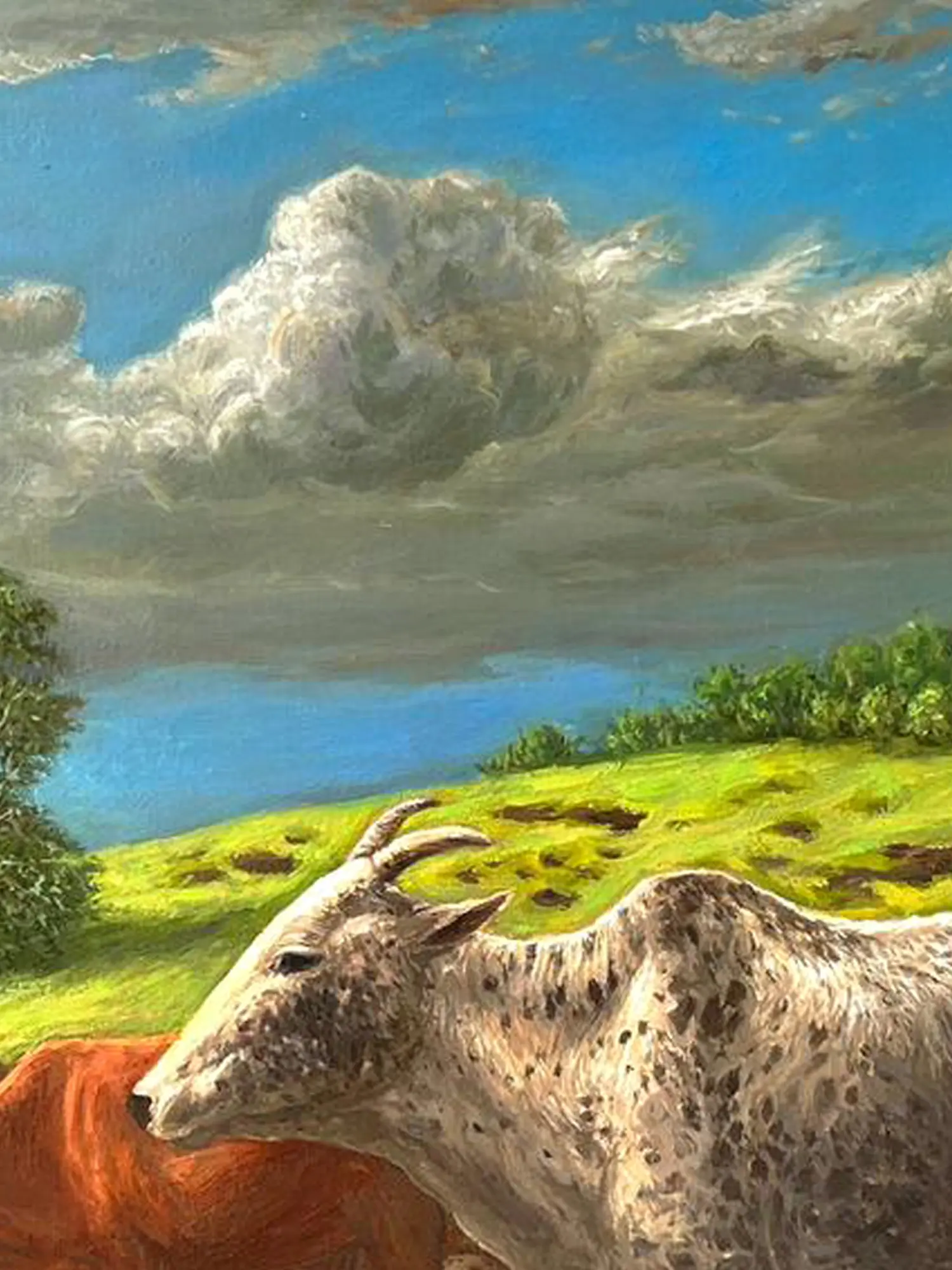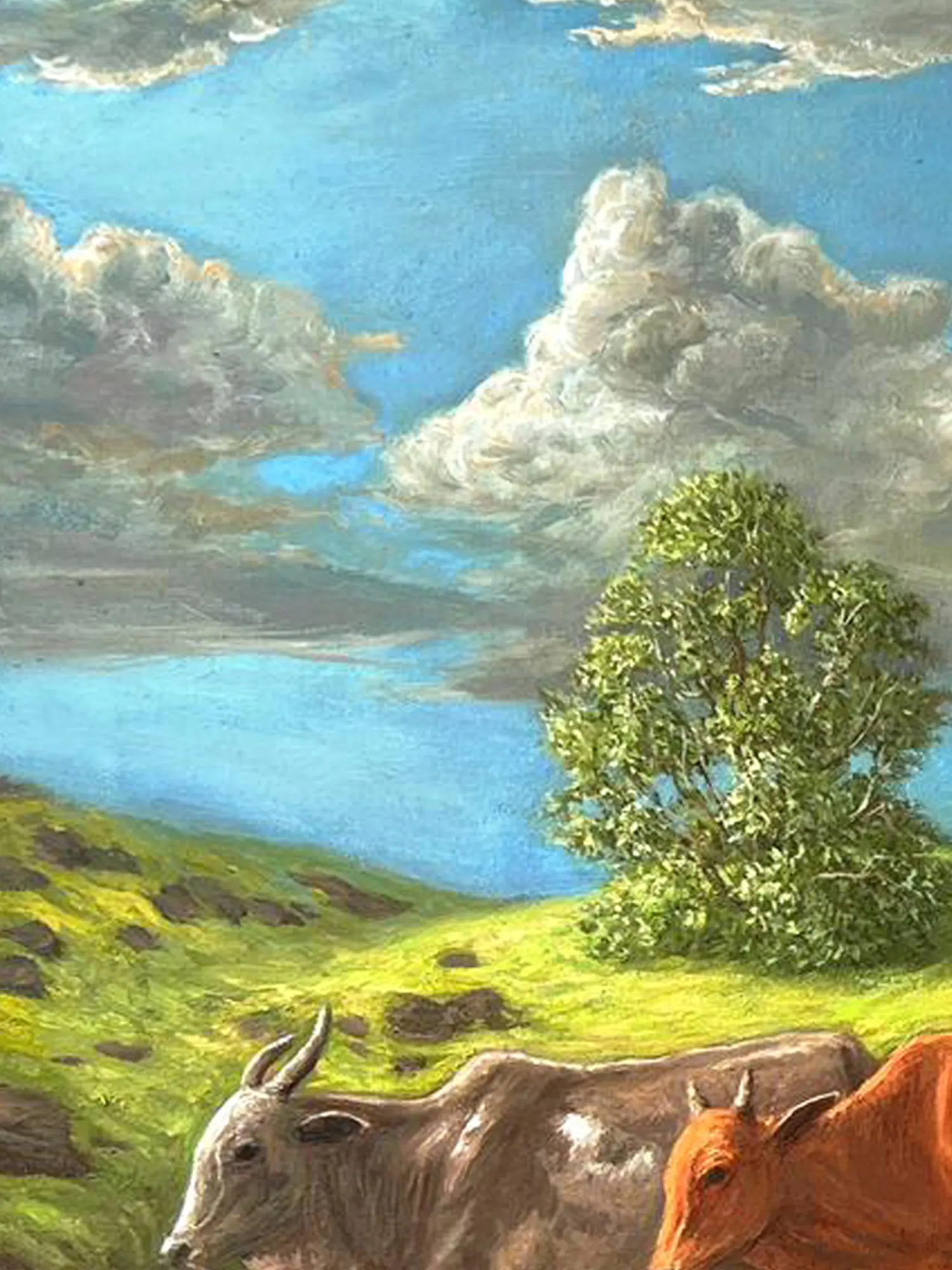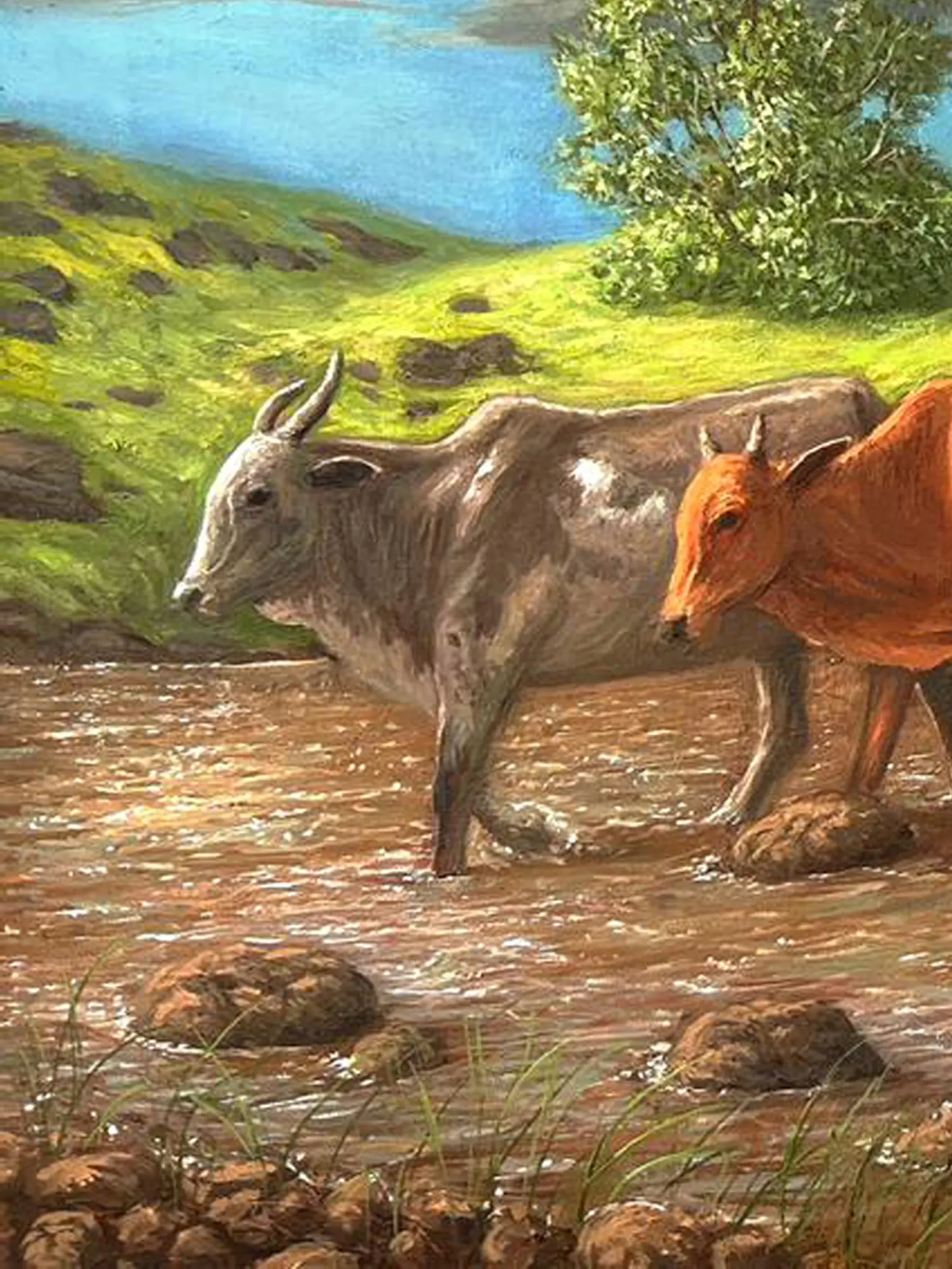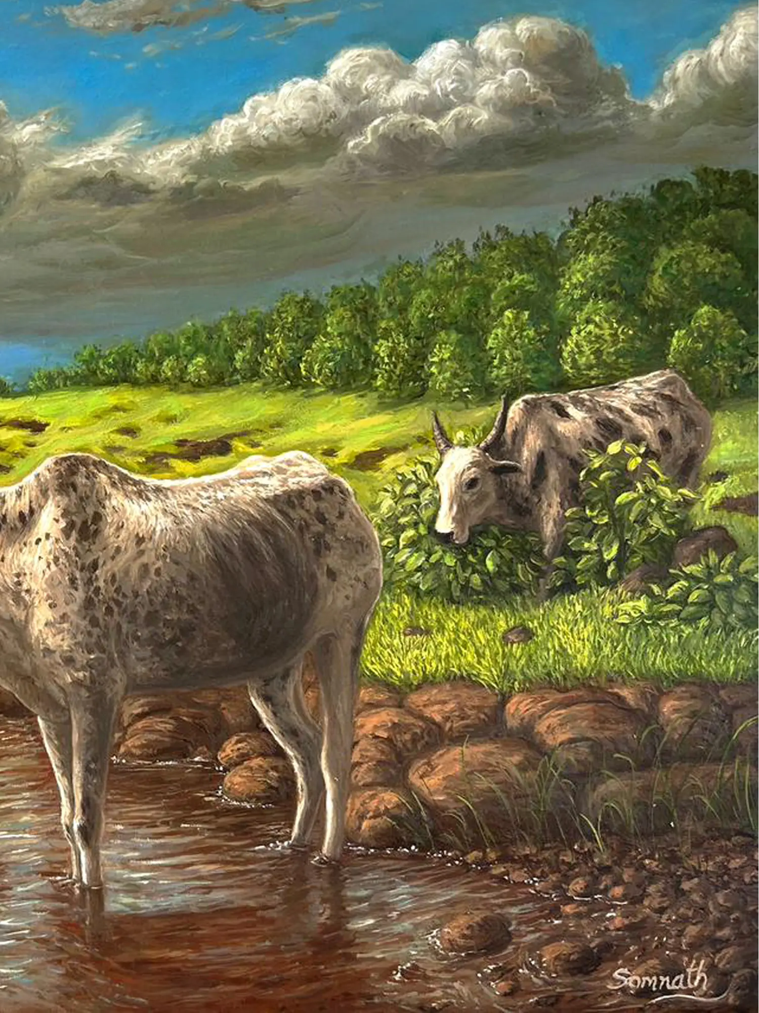 This artwork resonates with the deep connection to the earth and its creatures, often celebrated in Indian rural traditions and art. The cattle, central to many cultures for their livelihood and symbolism, are depicted here with dignity and grace. Their presence evokes a sense of continuity and the cycles of life, deeply rooted in the spirit of the land.