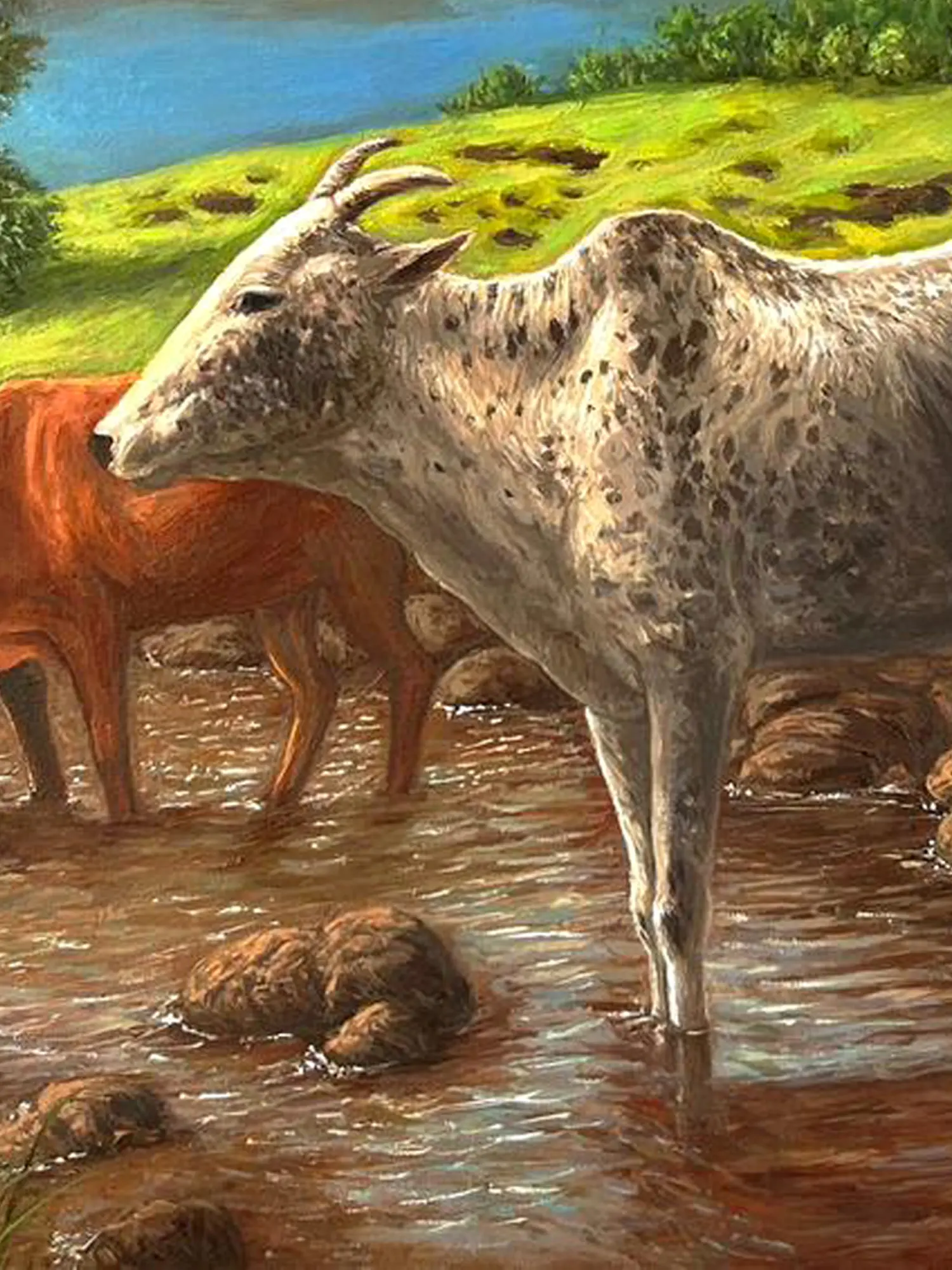 The composition, spanning 17.70 inches in height and 26.40 inches in width, draws you into a landscape that feels both familiar and timeless. Observe the lifelike rendering of the cattle as they stand in the flowing water, their coats textured and their forms sturdy. The verdant rolling hills and dramatic sky provide a breathtaking backdrop, emphasizing the vastness and beauty of their world.