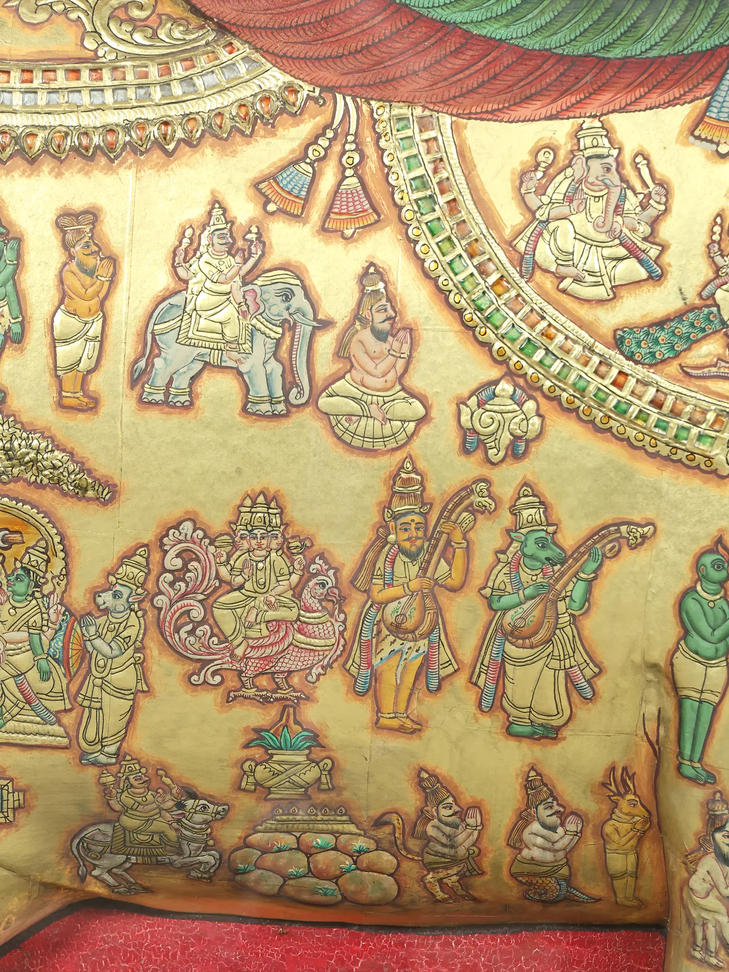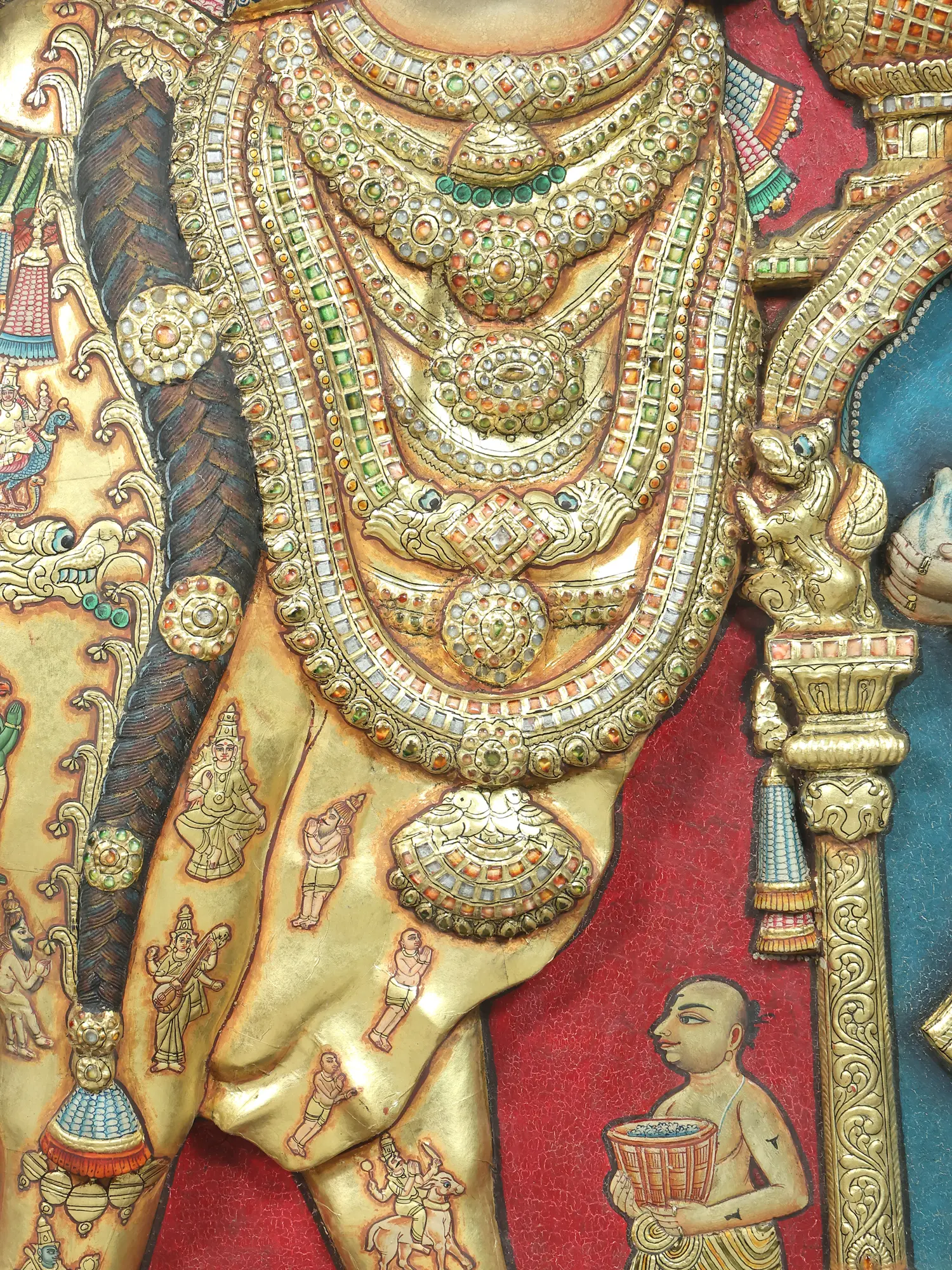 Crafted using age-old Tanjore techniques, this piece is a symphony of meticulous handwork and precious materials. Master artisans have painstakingly applied traditional natural colors, enriched with the unparalleled luster of 24 Karat gold leaf. The three-dimensional embossing creates a depth and tactile quality that truly elevates it beyond a mere painting, inviting you to appreciate the dedication poured into every raised line and textured surface.