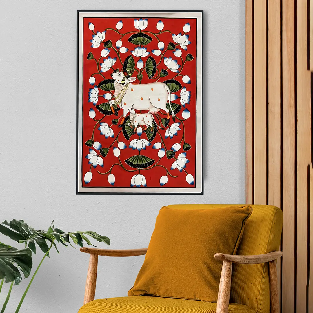 Kamdhenu - The Holy Cow | Cloth Canvas With Natural Pigments | By Ekta Jain | With Frame