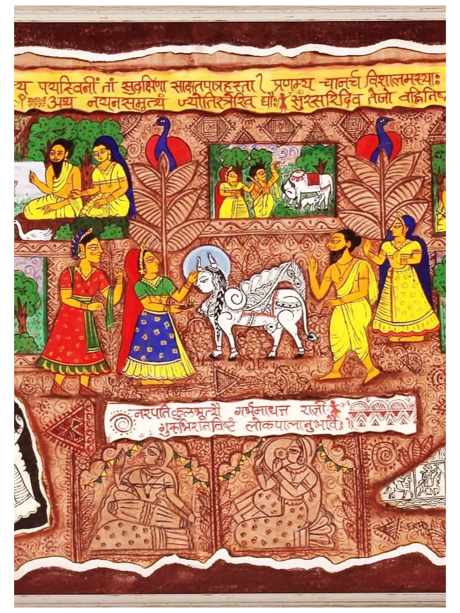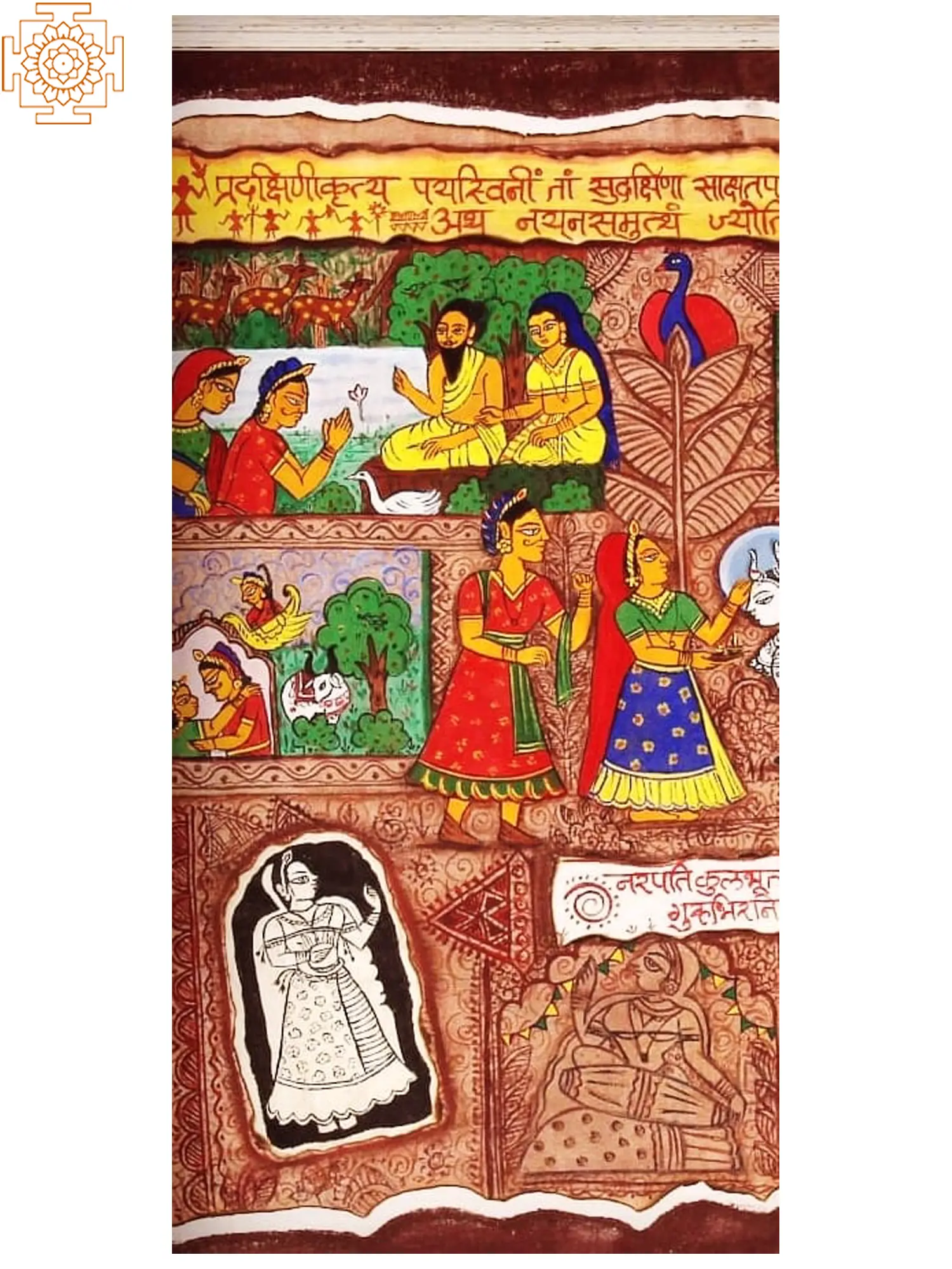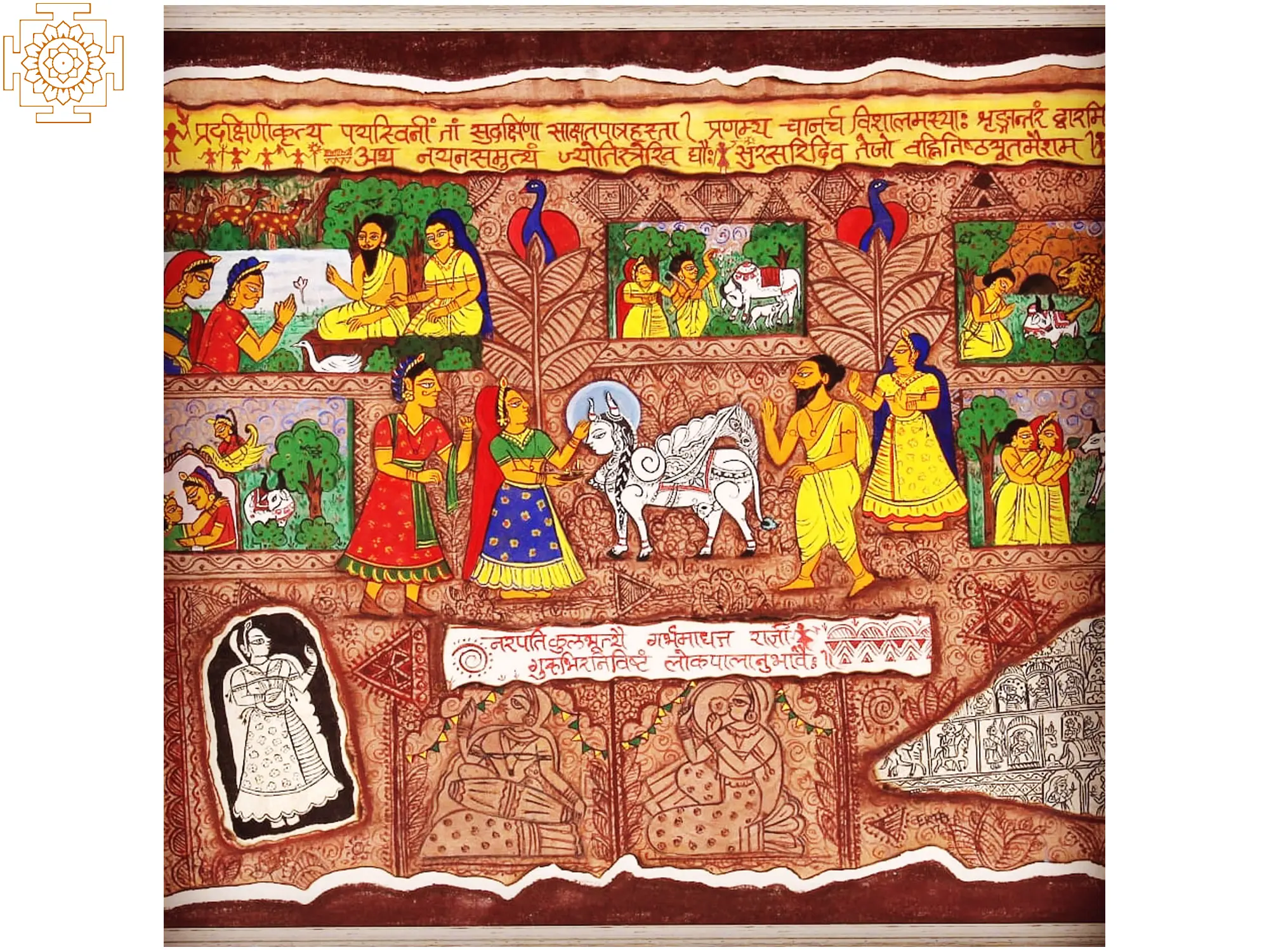 The composition unfolds in a series of vignettes, each rendered with exquisite detail. You'll observe the graceful depiction of figures, the symbolic representation of sacred animals, and the textural interplay of the canvas itself. The inclusion of traditional script adds an authentic layer, enhancing the visual narrative. This expansive artwork, measuring approximately 26.70 inches in height by 31.80 inches in width, offers a generous canvas for its compelling story.
