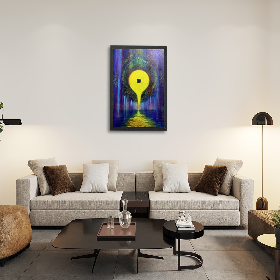 Kishore Kawad's "Kasturi Tilak" is more than just a painting; it's a journey into the heart of ancient symbolism and vibrant artistry. The piece, rendered in acrylic on canvas, measures 31 inches in height and 22 inches in width, making it a striking focal point for any space. The central image, a luminous yellow teardrop shape reminiscent of a peacock's eye, is immediately captivating. This is not just any peacock feather; the peacock, in many cultures, is a symbol of immortality, royalty, and spiritual awakening. Its iridescent plumage is often associated with the celestial, reflecting the divine light and the mysteries of the universe. The artist skillfully captures the mesmerizing quality of the peacock feather, translating its ethereal beauty into a dynamic visual experience.