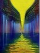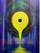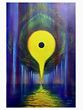 The surrounding deep blues and purples, punctuated by streaks of vibrant green, create a sense of depth and movement. These colors, rich in symbolic meaning across cultures, add to the painting's ethereal quality. Blue often represents the vastness of the cosmos, the spiritual realm, and the infinite possibilities of life. Purple, a regal hue, adds a touch of majesty and mystery. The artist's masterful use of color guides the viewer's eye down a path of light, leading towards a seemingly peaceful shore. The path itself mirrors the journey of spiritual awakening – a pilgrimage towards enlightenment, guided by the radiant light of self-discovery. The implied figure standing at the end of the path suggests that the goal of this journey is the integration of the divine within the self. The painting's vibrancy and the artist’s skillful manipulation of light and shadow encourage the viewer to actively engage with the artwork.