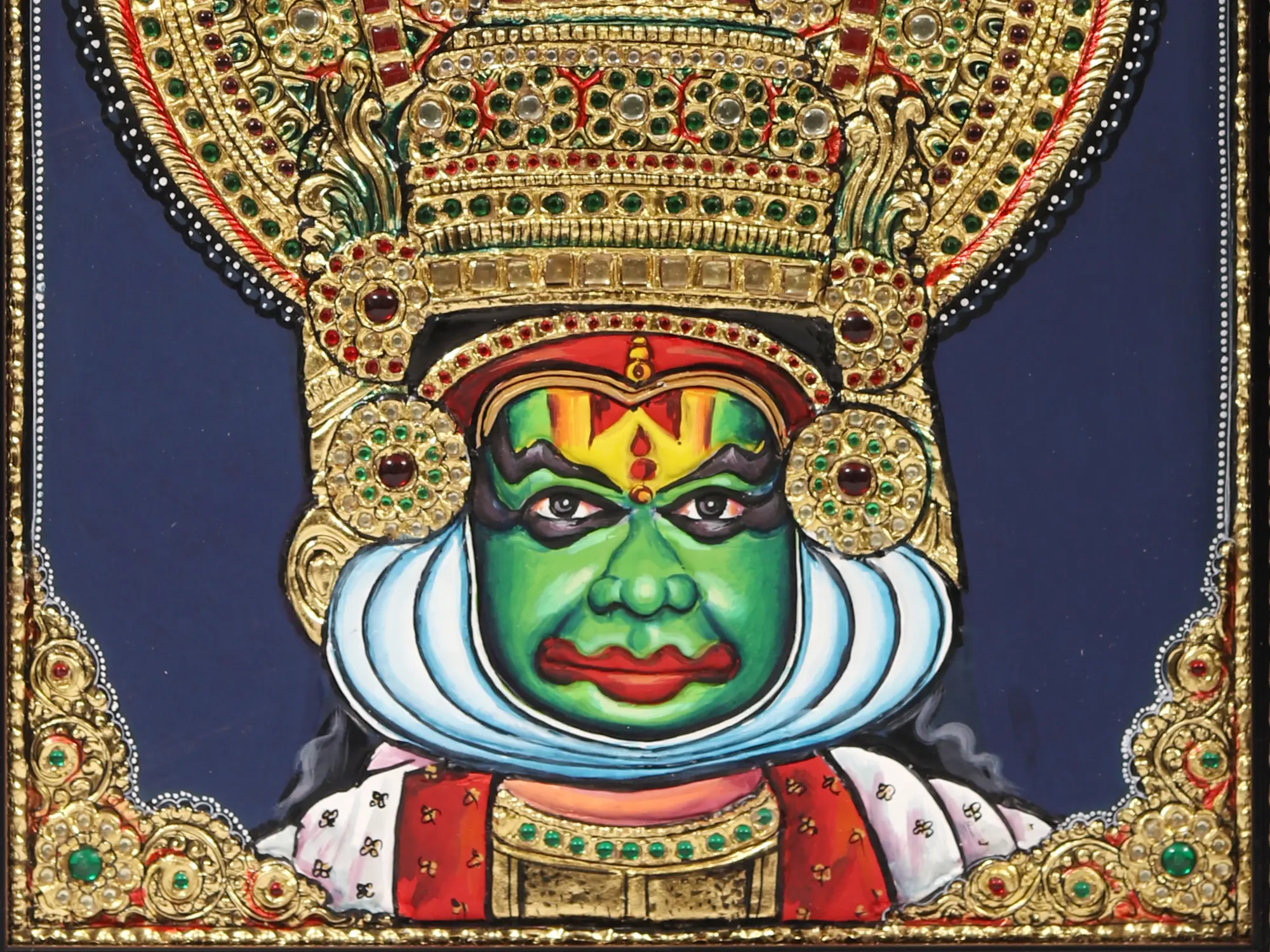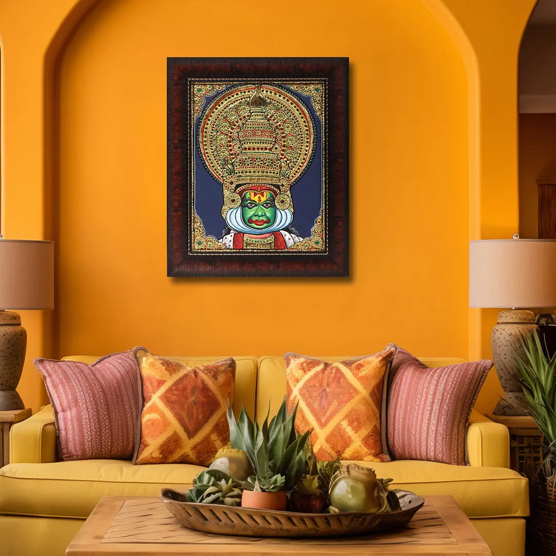 As presented in this Tanjore Kathakali Face, every stroke and colour choice tell a story, inviting you to delve into the depths of human emotions and experiences - cast with additional gold gild. It's a testament to the power of art to convey the profound without words, a reminder of the universality of human expression.