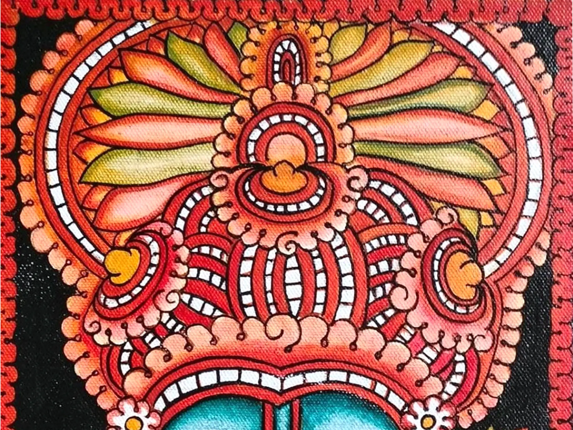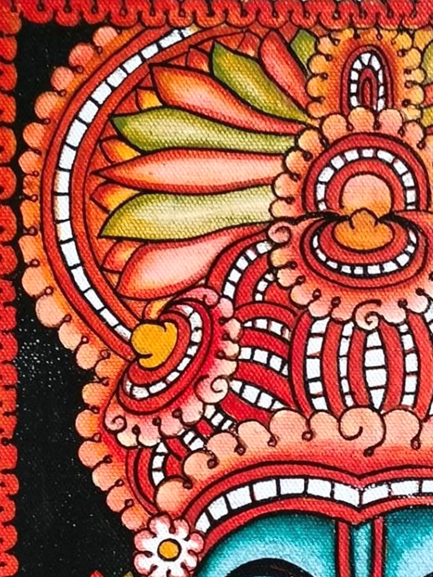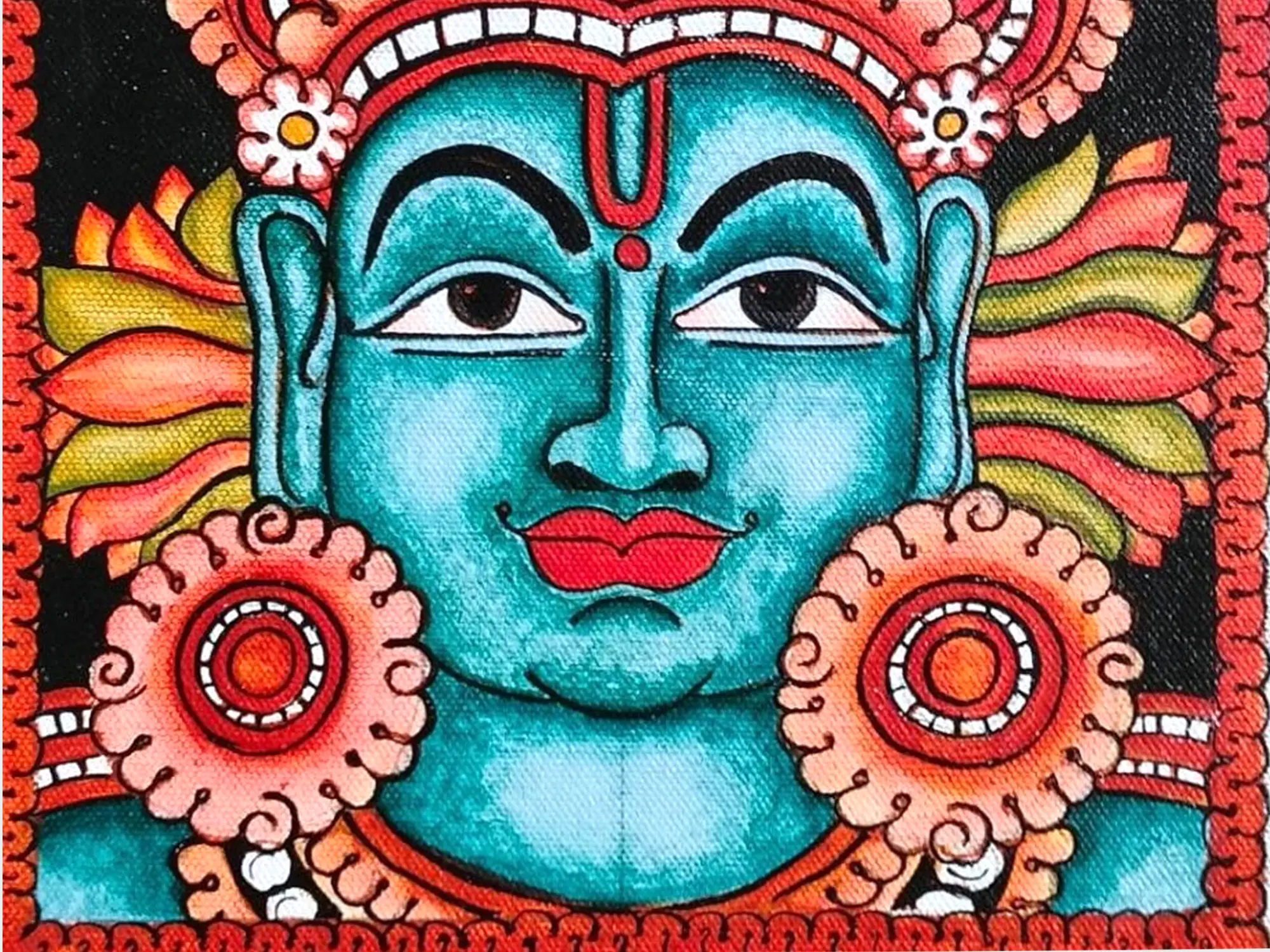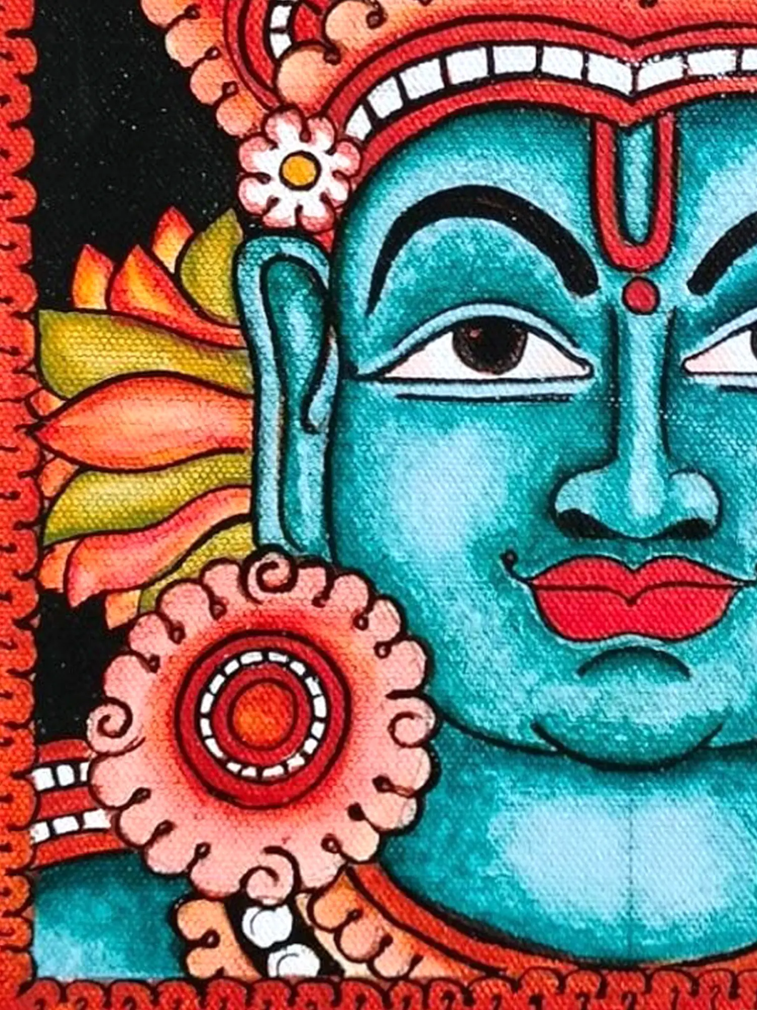 This Kerala Mural Krishna Face is an Acrylic on Canvas by Rojalee Panda is made in the lines of the traditional Kerala Mural painting style. Here the face of Lord Krishna is presented all bright and divine. Kerala Mural painting is deeply rooted in the rich cultural tapestry of Kerala. This traditional art form, with its origins in temples, reflects the state's vibrant mythology, religious diversity, and historical narratives.