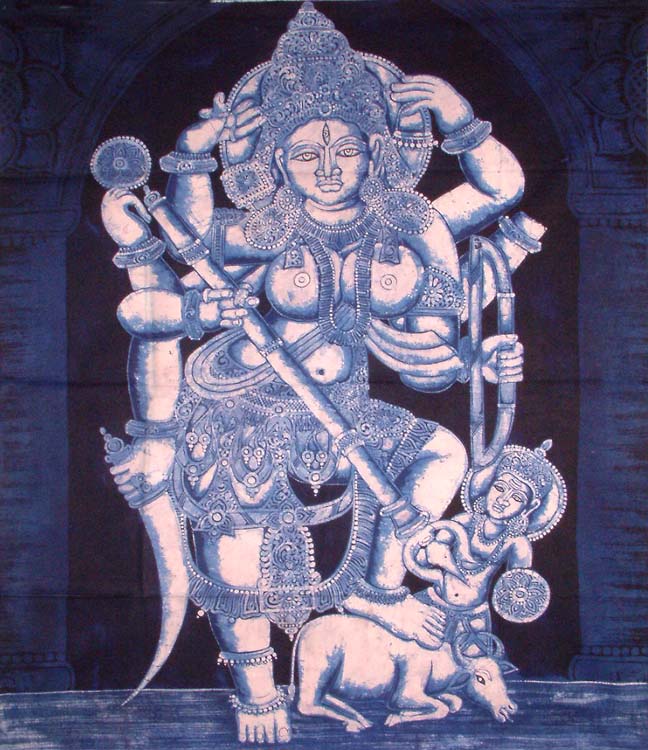 The creator of this batik work takes the assistance of colour blue to depict a tale where the goddess decapitates the buffalo and the demon Mahisa emerges in human form from the buffalo's neck and attacks her. Durga appears here sans the fierce lion she is usually depicted with. She is shown with many arms, each of which wields a weapon. She wears a crown with a halo behind and ornaments to beautify every part of her body. The feminine attributes of the goddess are prominent - against the backdrop of multiple limbs. Her posture suggests power as she places one foot over the buffalo as Mahisasura escapes from it. She holds the trident in her left hand and forcefully pierces the demon as soon as it emerges from the animal.