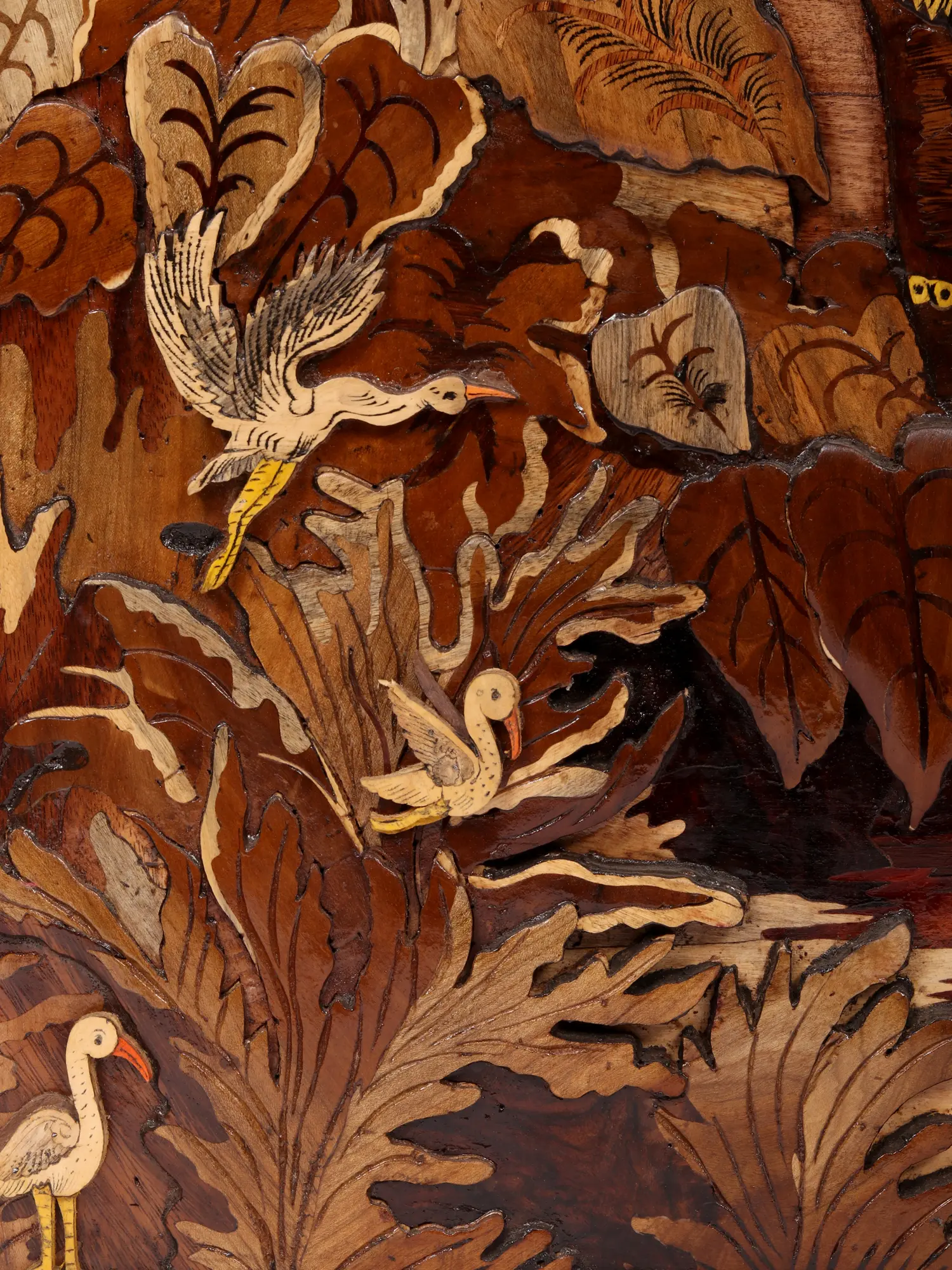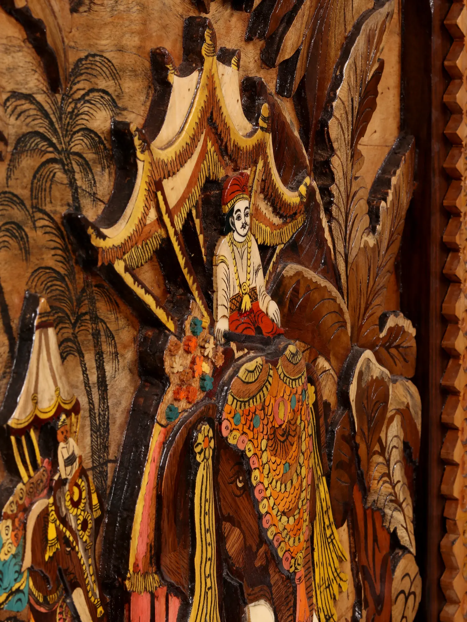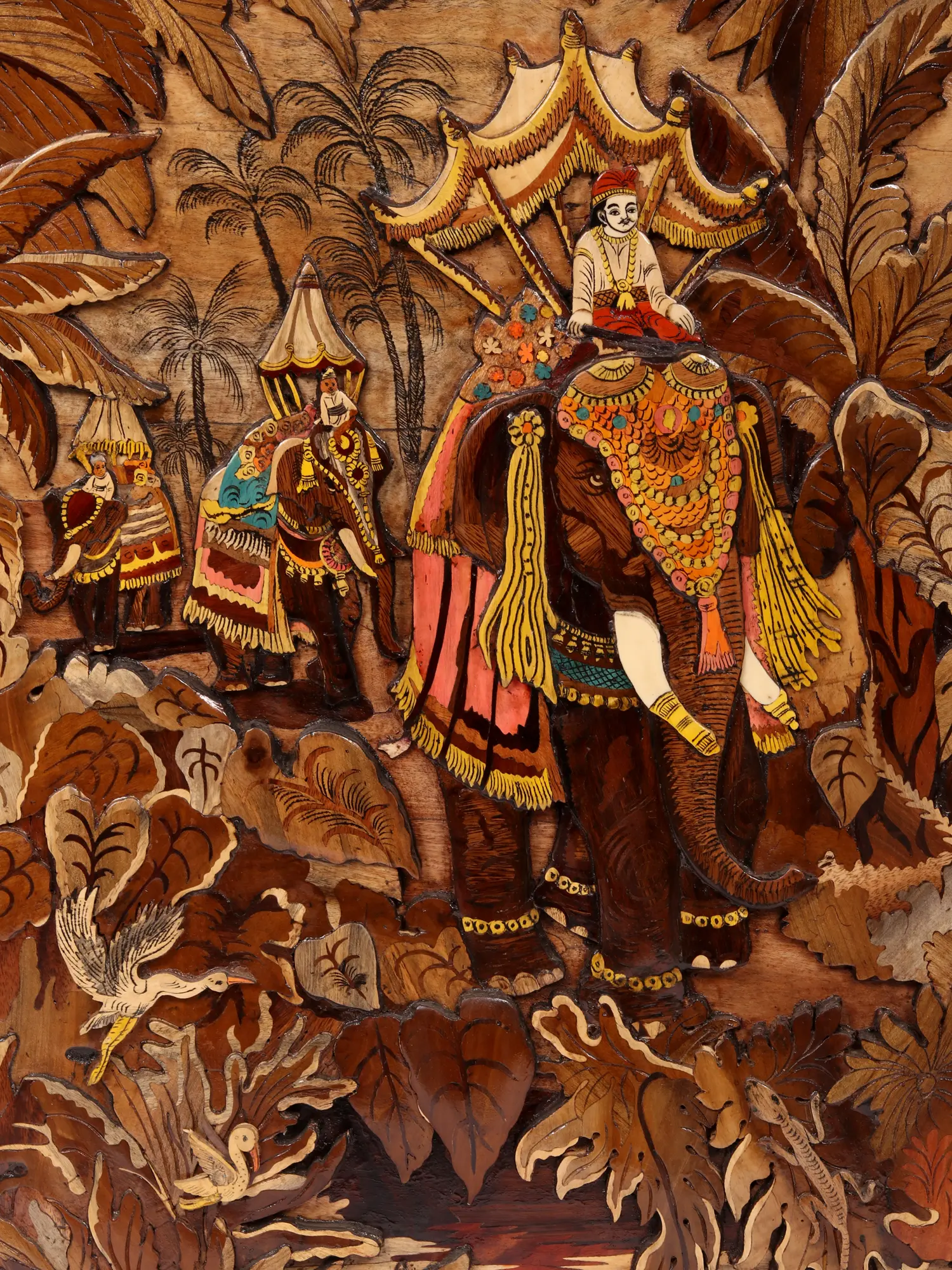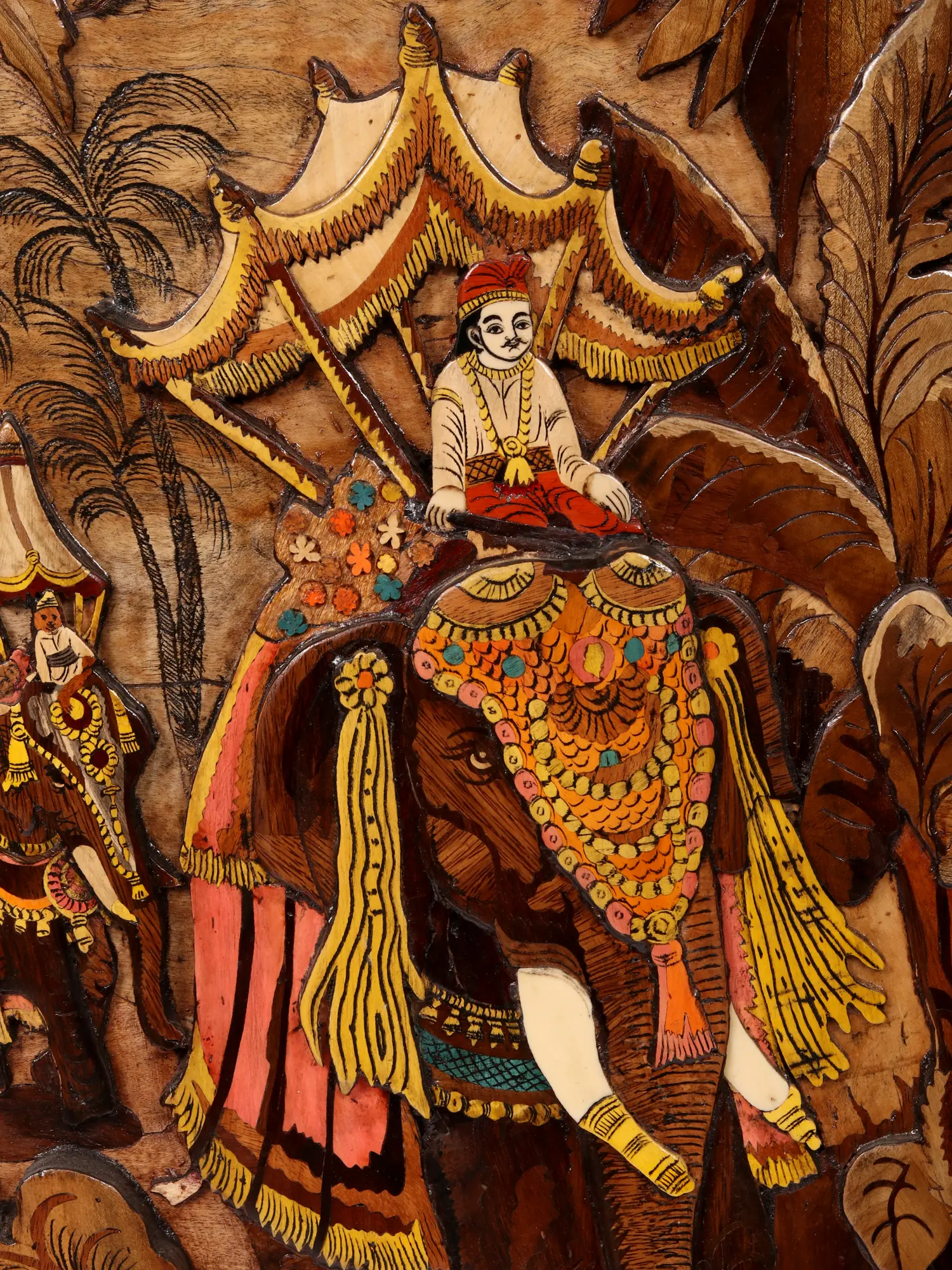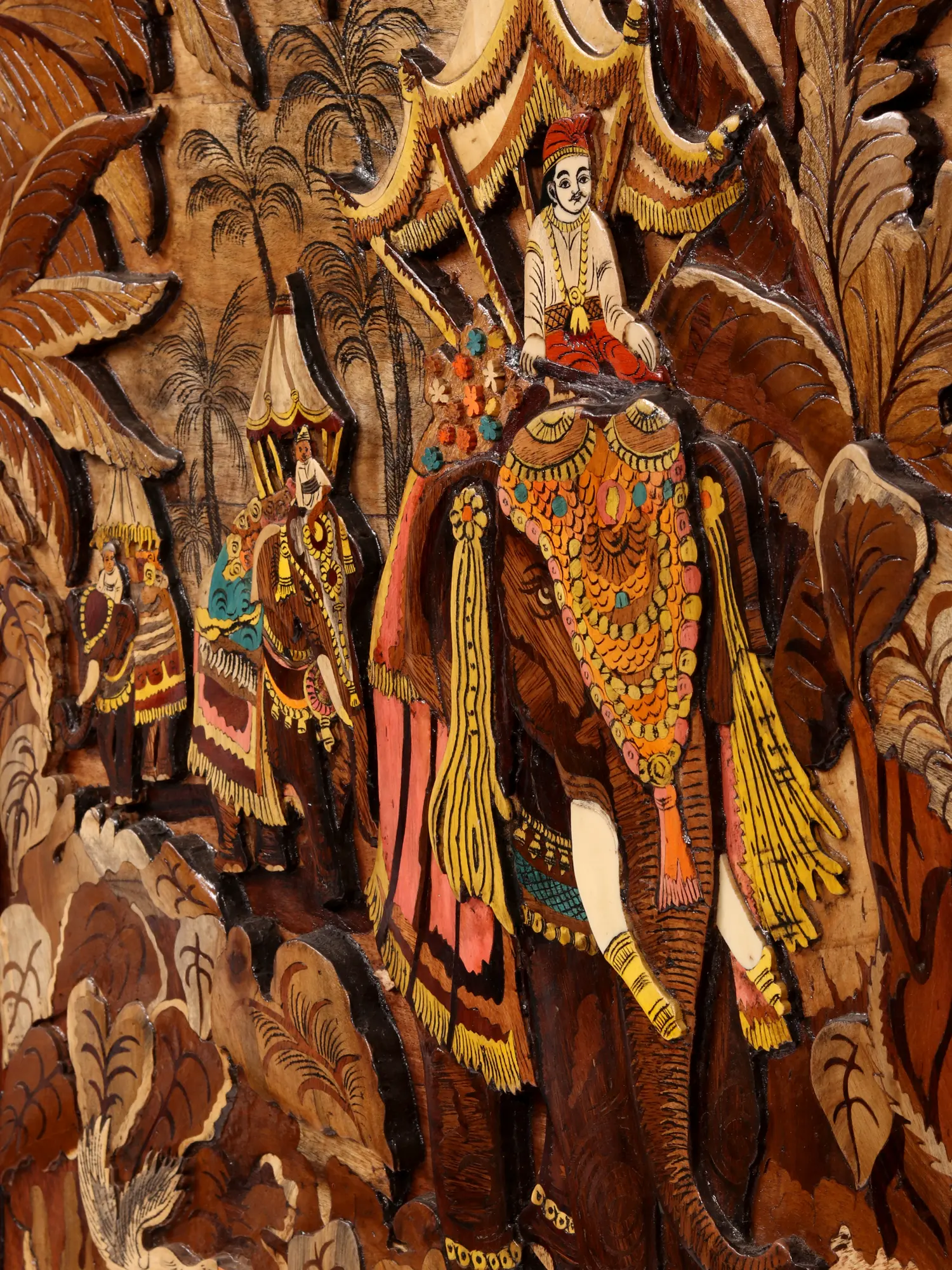 The three-dimensional nature of this wood panel adds a captivating depth, bringing the scene vibrantly to life. The majestic elephant, adorned with decorative trappings, commands attention, its form rendered with remarkable detail. Surrounding foliage, depicted with leaves and palm fronds, creates a lush, immersive environment. A distinguished figure sits atop the elephant, sheltered by an ornate canopy, while other attendants flank the procession, adding to the narrative richness. The overall composition, measuring 36 inches in height and 24 inches in width with a depth of 2.5 inches, is a harmonious blend of intricate carving and masterful inlay work.
