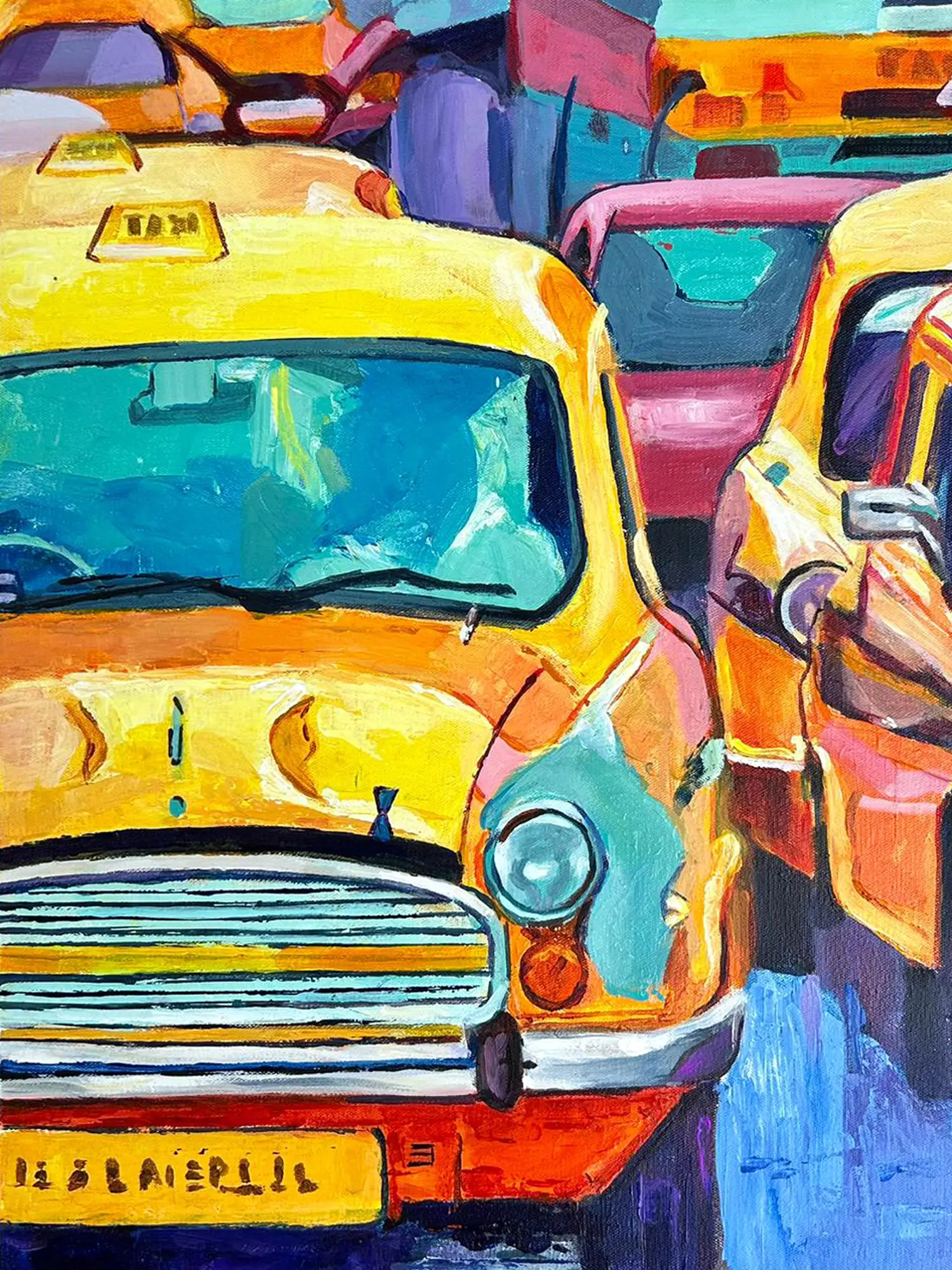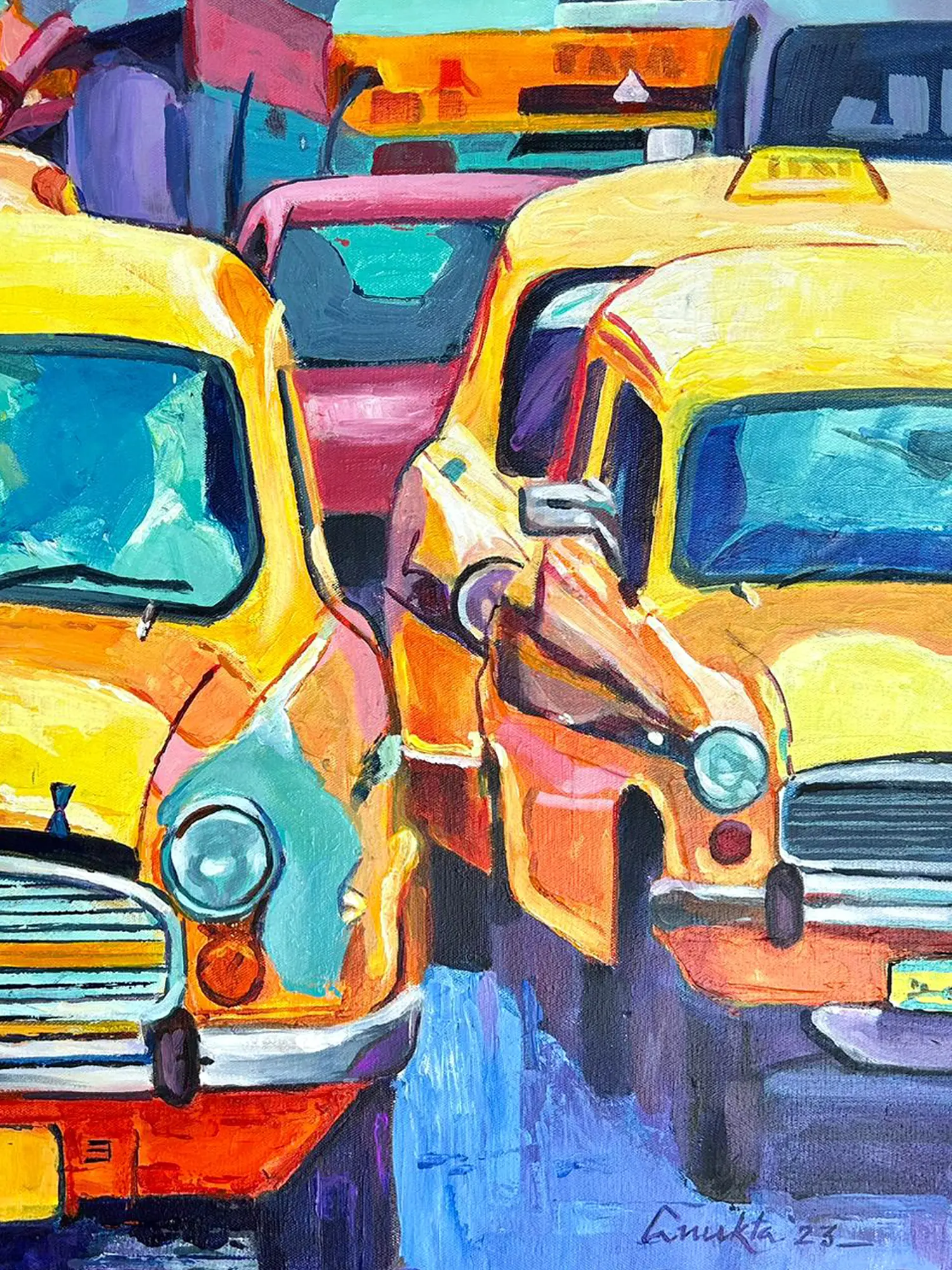 This evocative piece draws inspiration from the unforgettable charm and relentless spirit of Kolkata, India. The familiar yellow taxis, instantly recognizable symbols of the city, become more than mere vehicles; they are characters in a vibrant urban ballet. You can almost feel the humid air, hear the symphony of horns, and sense the stories unfolding behind each windshield.