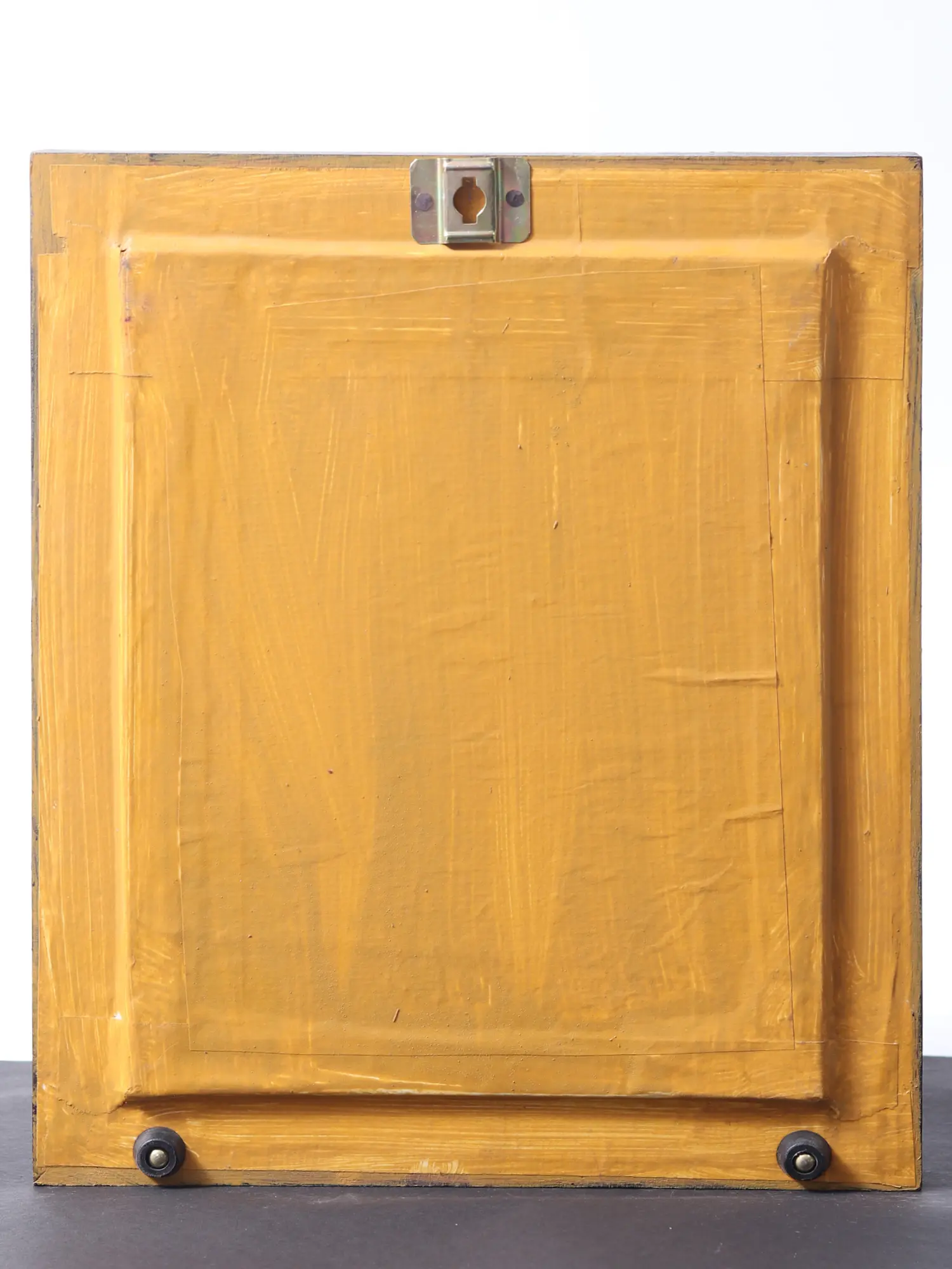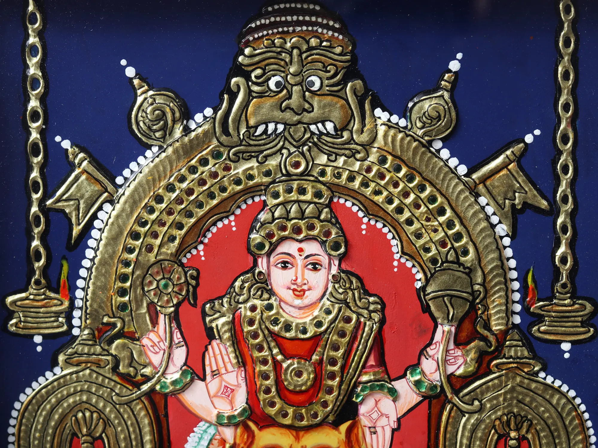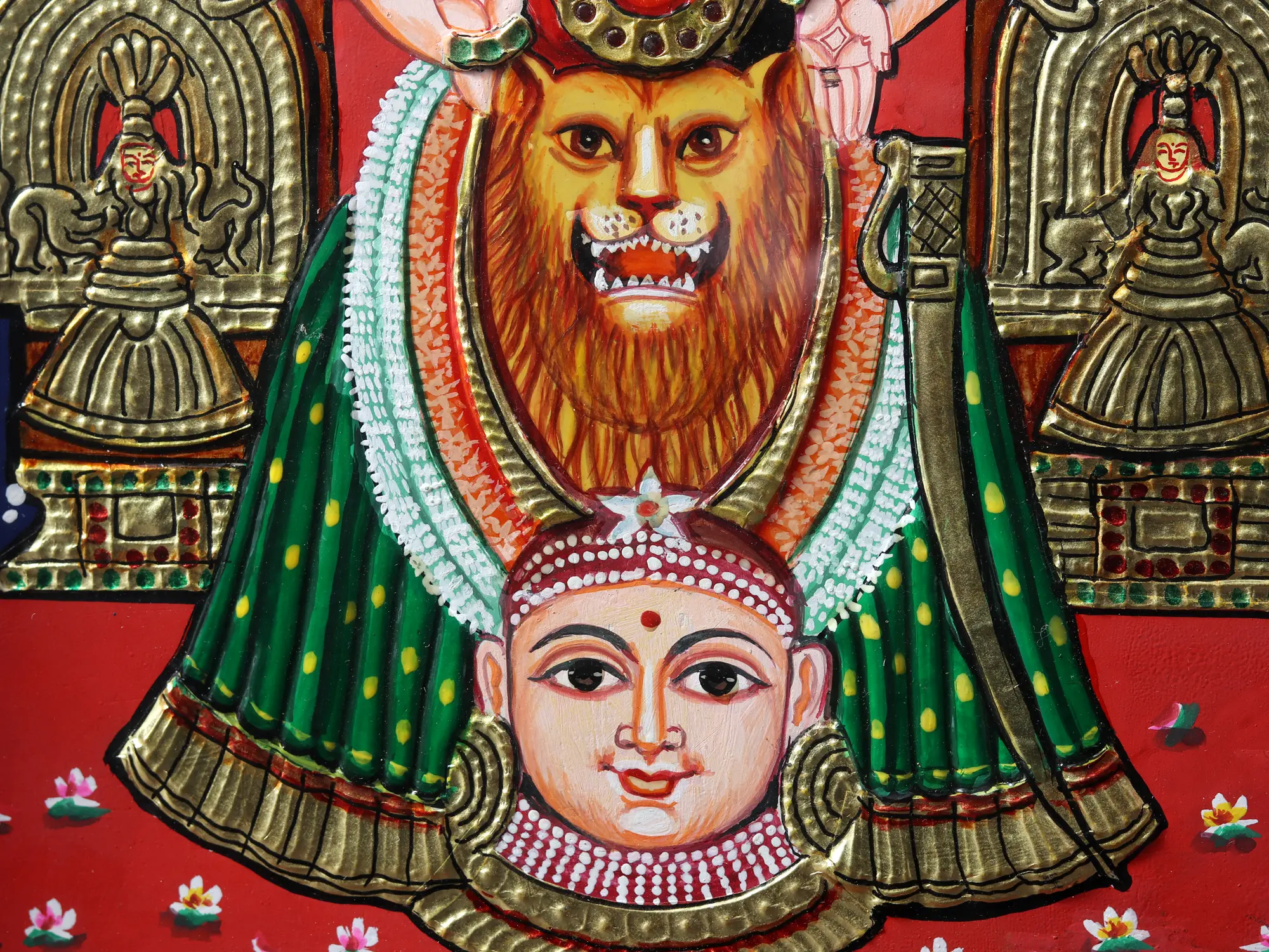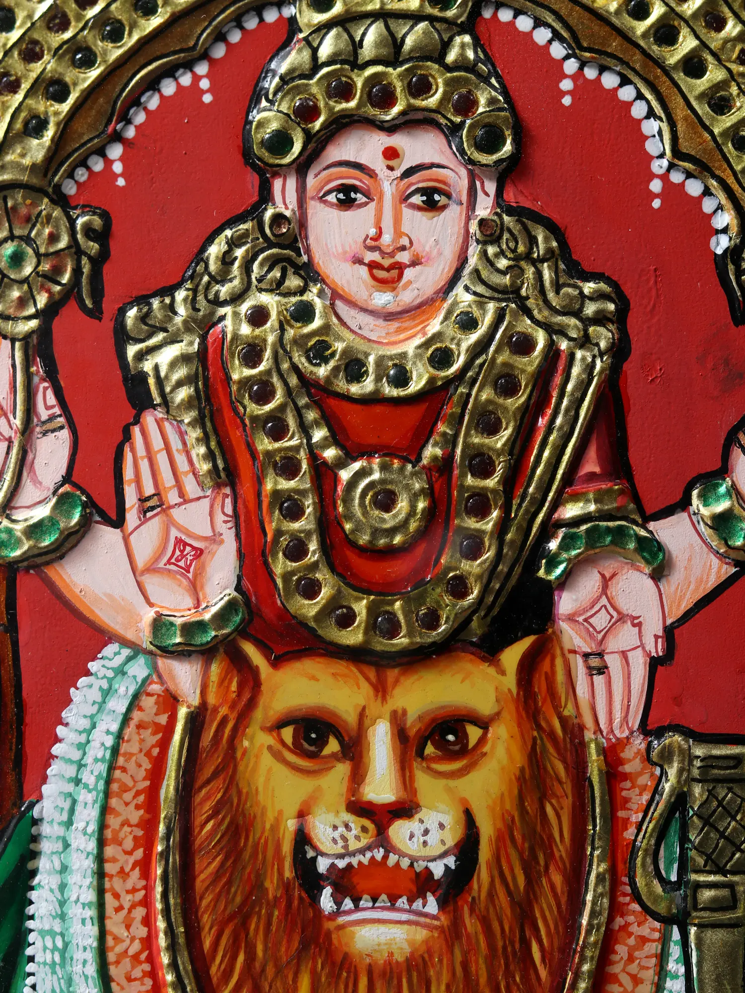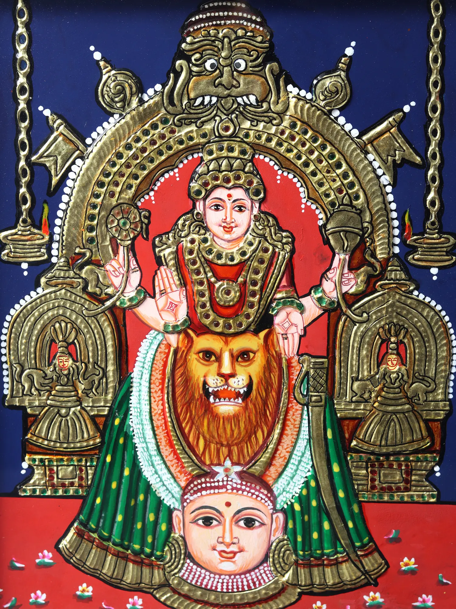 The Queen, mother-goddess Devi Mookambika of Kollur sits on her ornate Prabhamandala-like throne in divine grace. Chaturbhujadharini and a celebrated manifestation of Adi-Parashakti, as per the Skanda Purana, Devi Mookambika originates from the union of Linga and Yoni. On whom the devatas called upon to slay Kamasura - a fierce Simha sits at her feet. She holds a Chakra and Shanka as she grants her devotees in Abhaya and Varada. Keeping a sword to her side, she’s the goddess of three lokas in realization - brought to you in this Tanjore mural, framed in Teakwood.