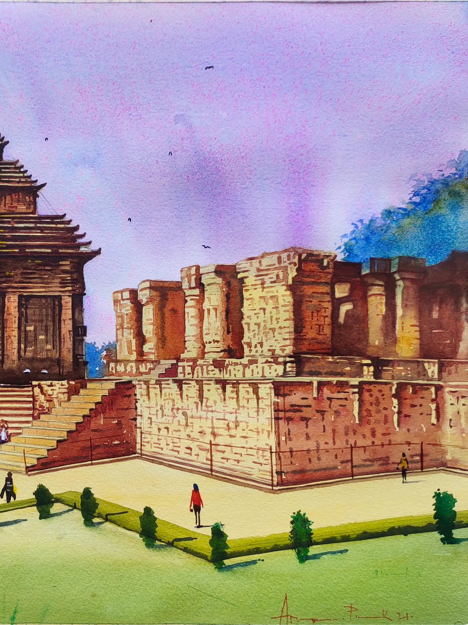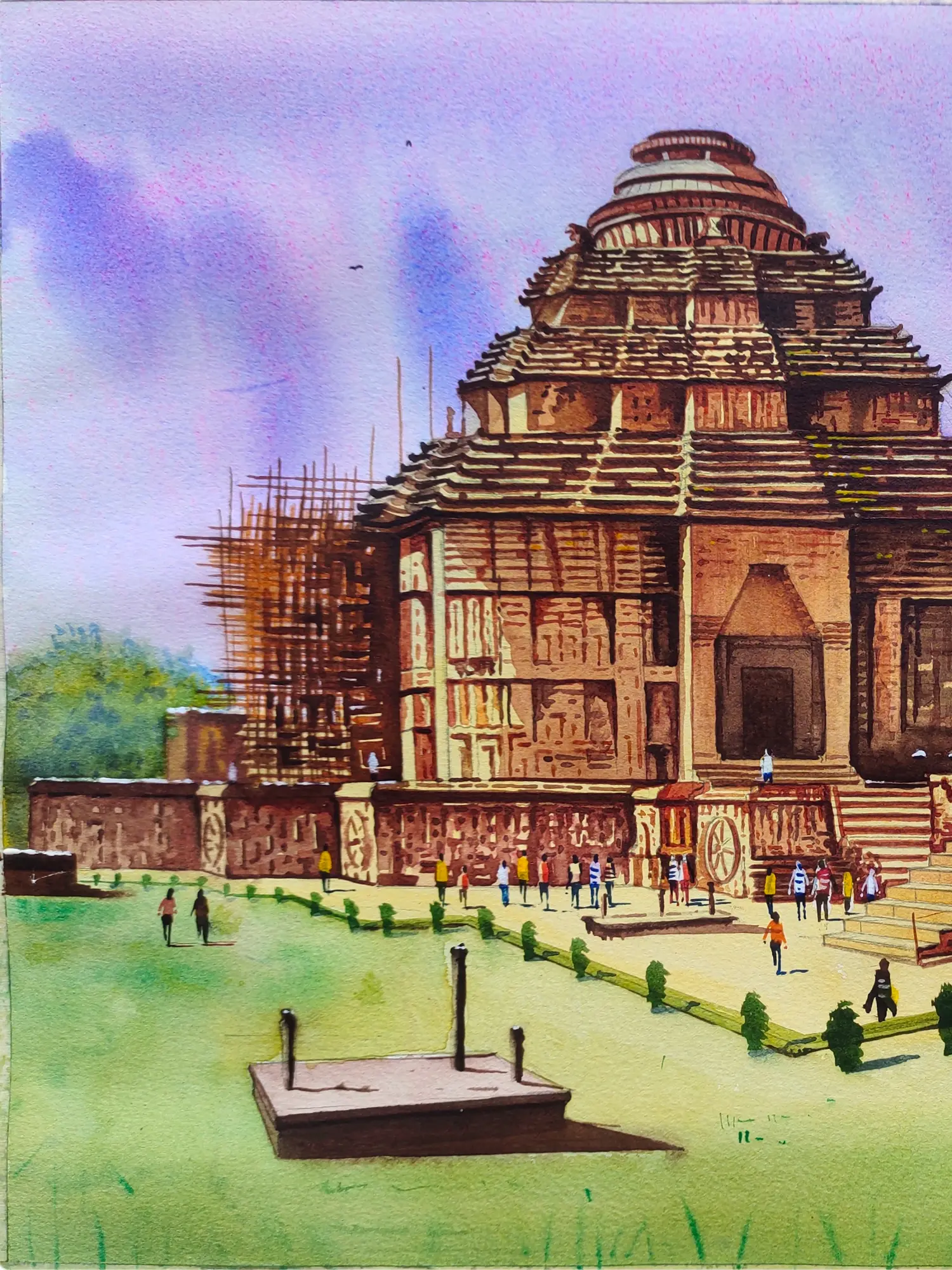 The watercolour painting of the Konark Sun Temple captures the architectural grandeur and spiritual mystique of Odisha's historic monument. Against ancient lore, the temple's intricate carvings and majestic spires stand as a testament to India's rich cultural heritage and artistic legacy. Through its evocative imagery and serene ambiance, the painting invites viewers to embark on a journey through time, where history and spirituality converge in harmonious splendour.