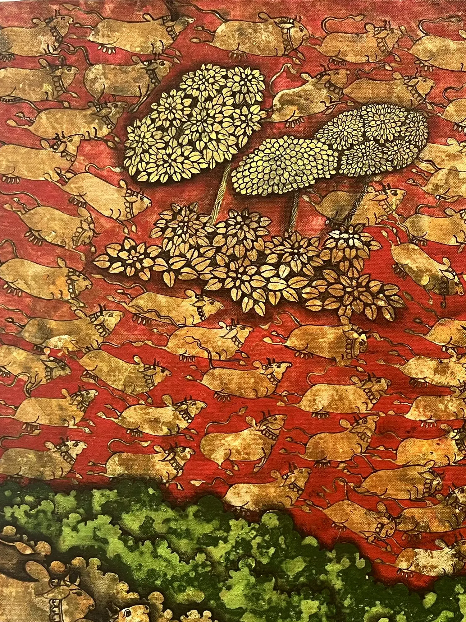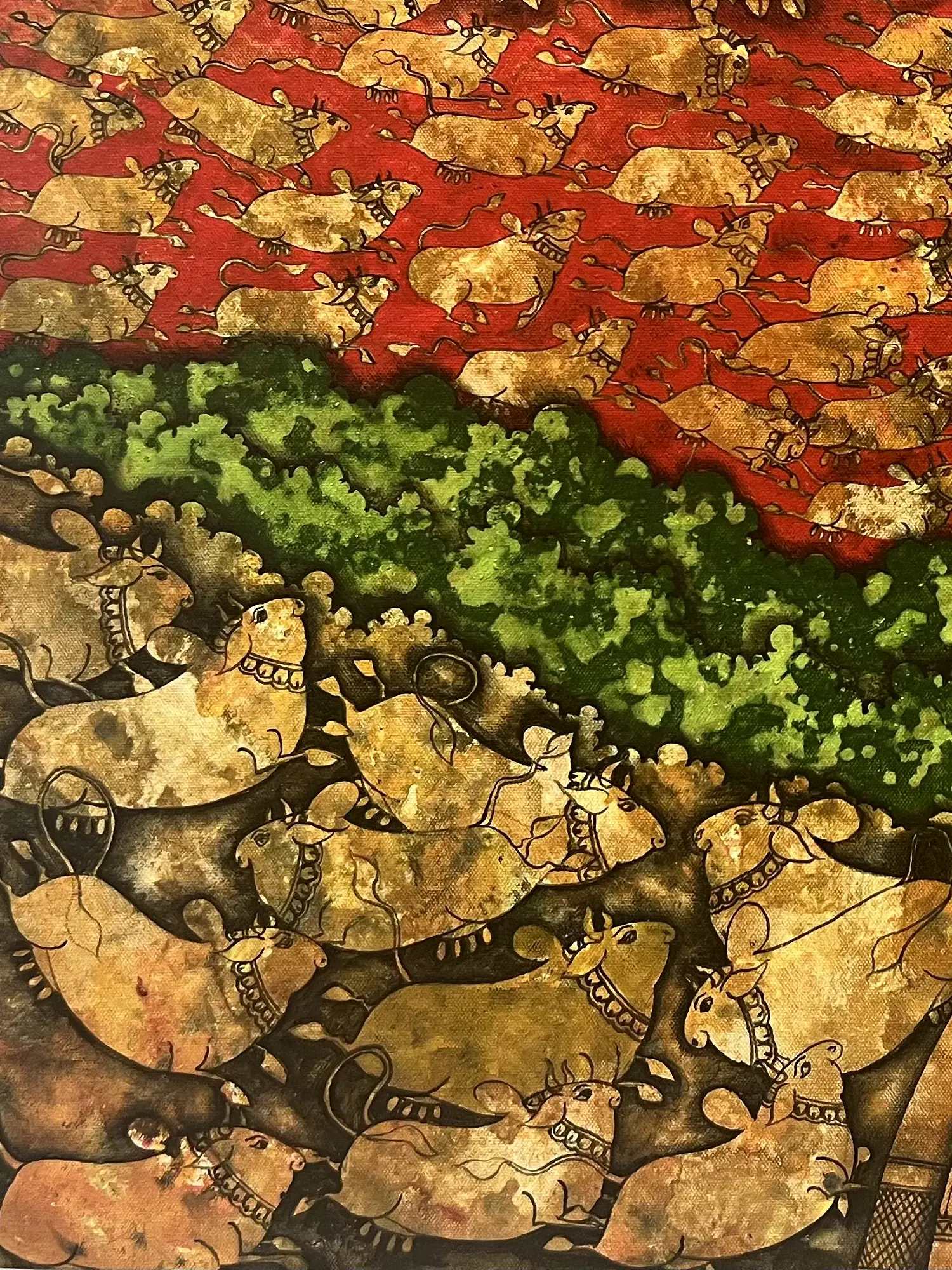 The canvas is divided by the artist using themes and colors into three sections- the topmost populated by Surabhi (fragrant, divine) cows galloping and strolling in the forest, symbolized by the neatly painted trees, followed by lush greenery and ending with groups of cows in the foreground, blissful in the company of Goapala.