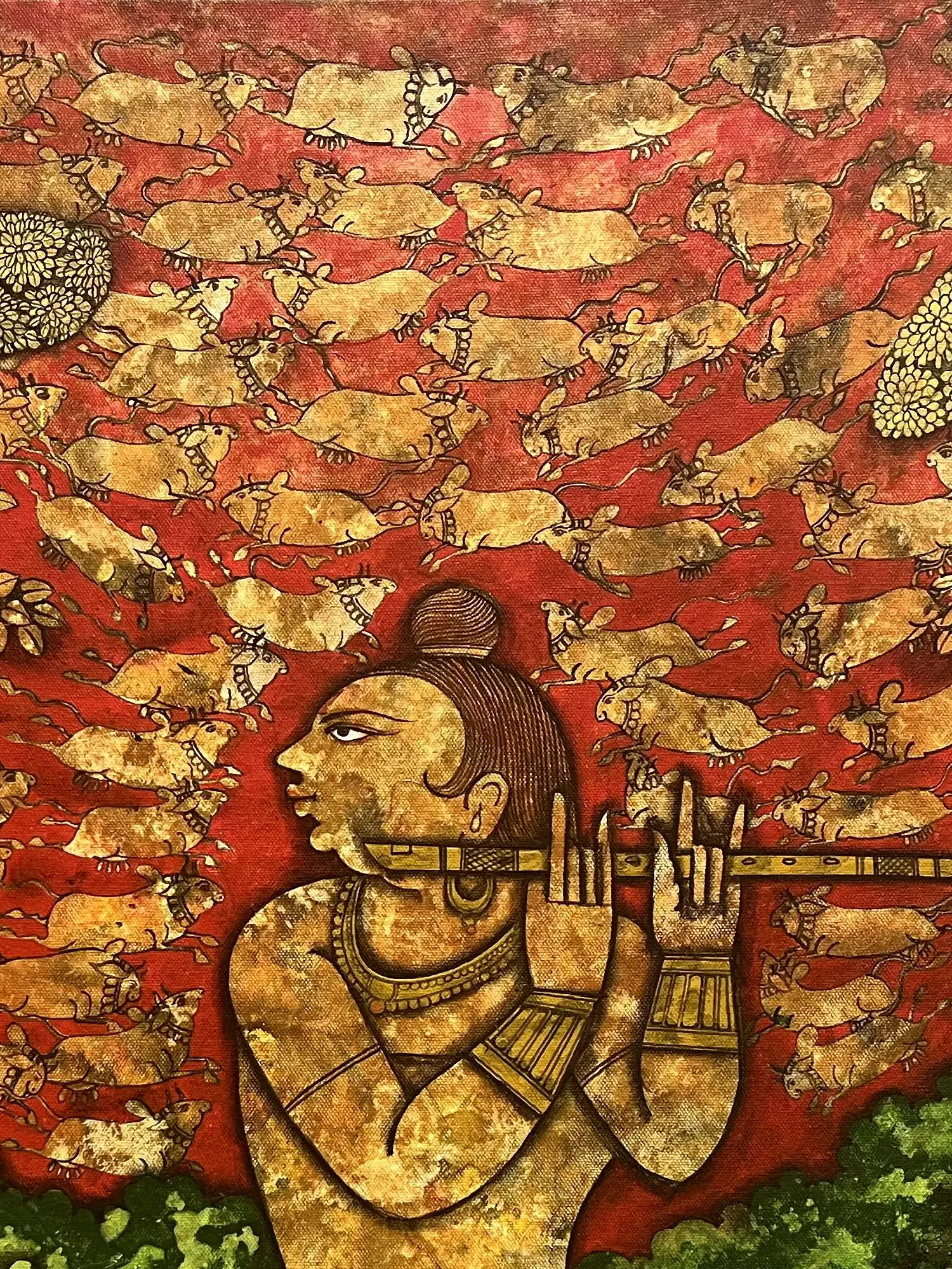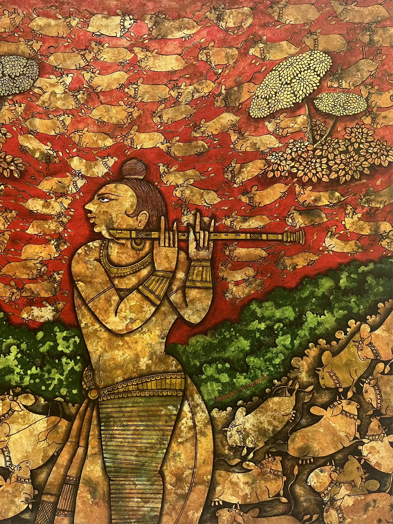 Krishna with his flute on his lips stands in the center of the canvas, adorned marvelously, with his profile reminding one of the details of traditional Pattachitra (folk art of Orissa). The use of meticulously drawn lines with muted and earthy tones has made this artwork a delight for the eyes, with a theme that is at the heart of Hindu devotional culture.