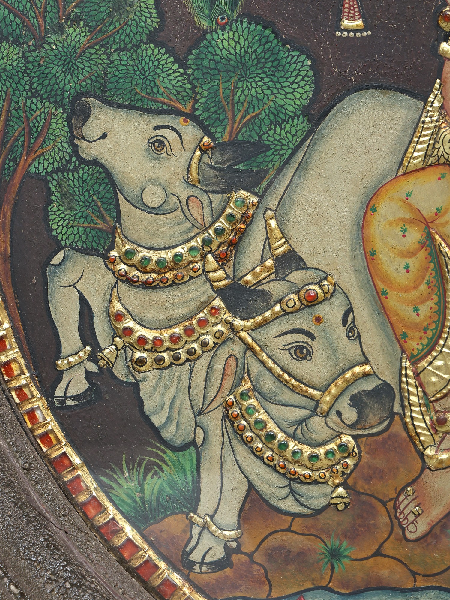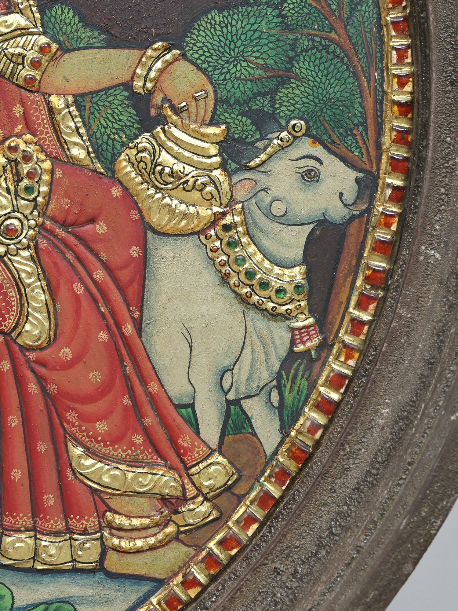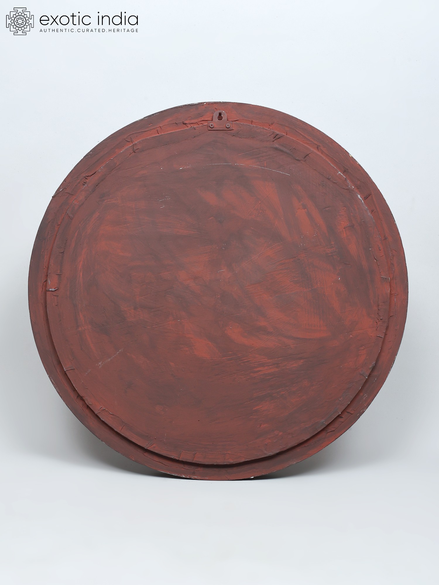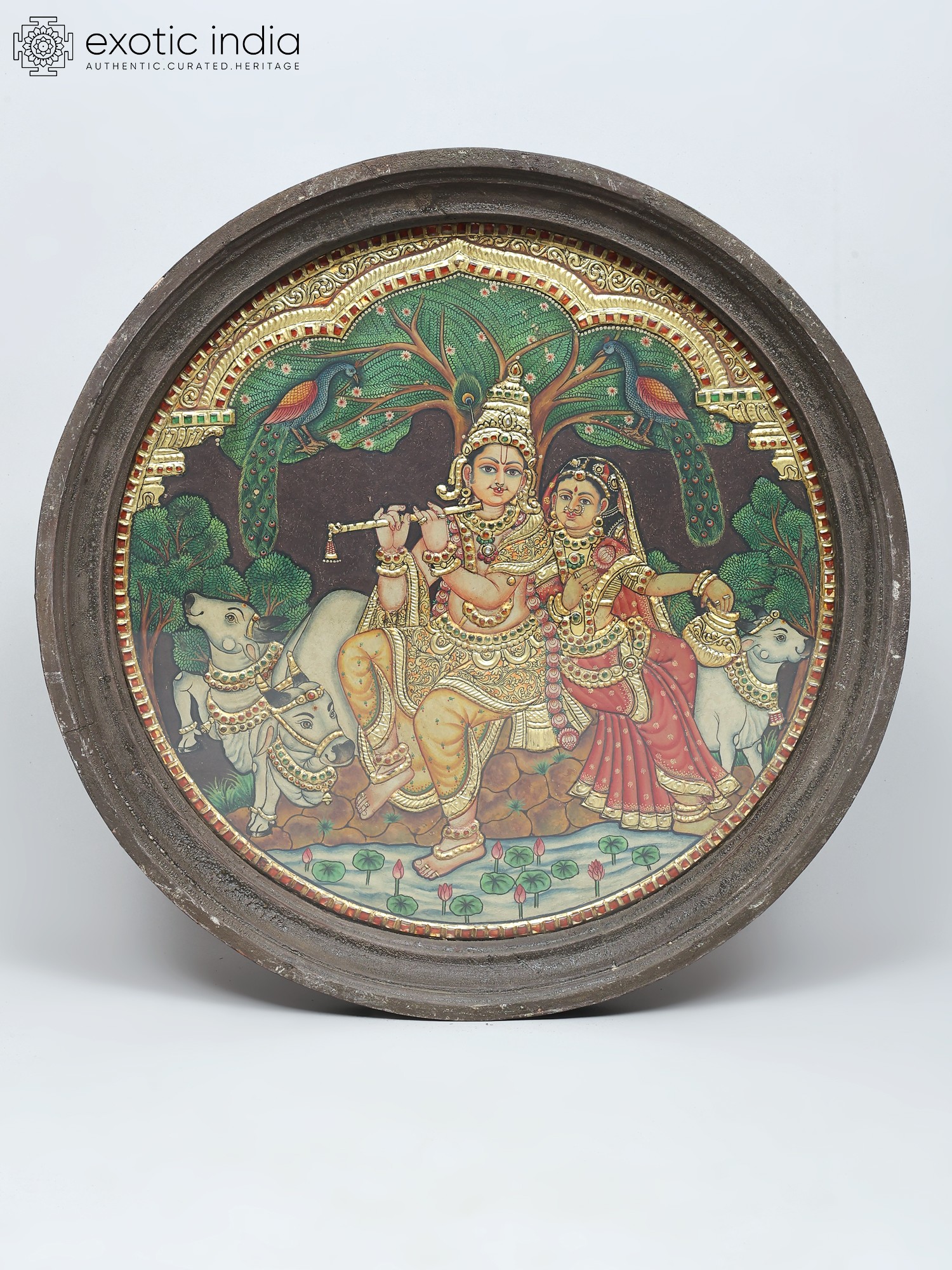 Radha Krishna Rasalila | Round Tanjore Painting | With Vintage Teakwood Frame