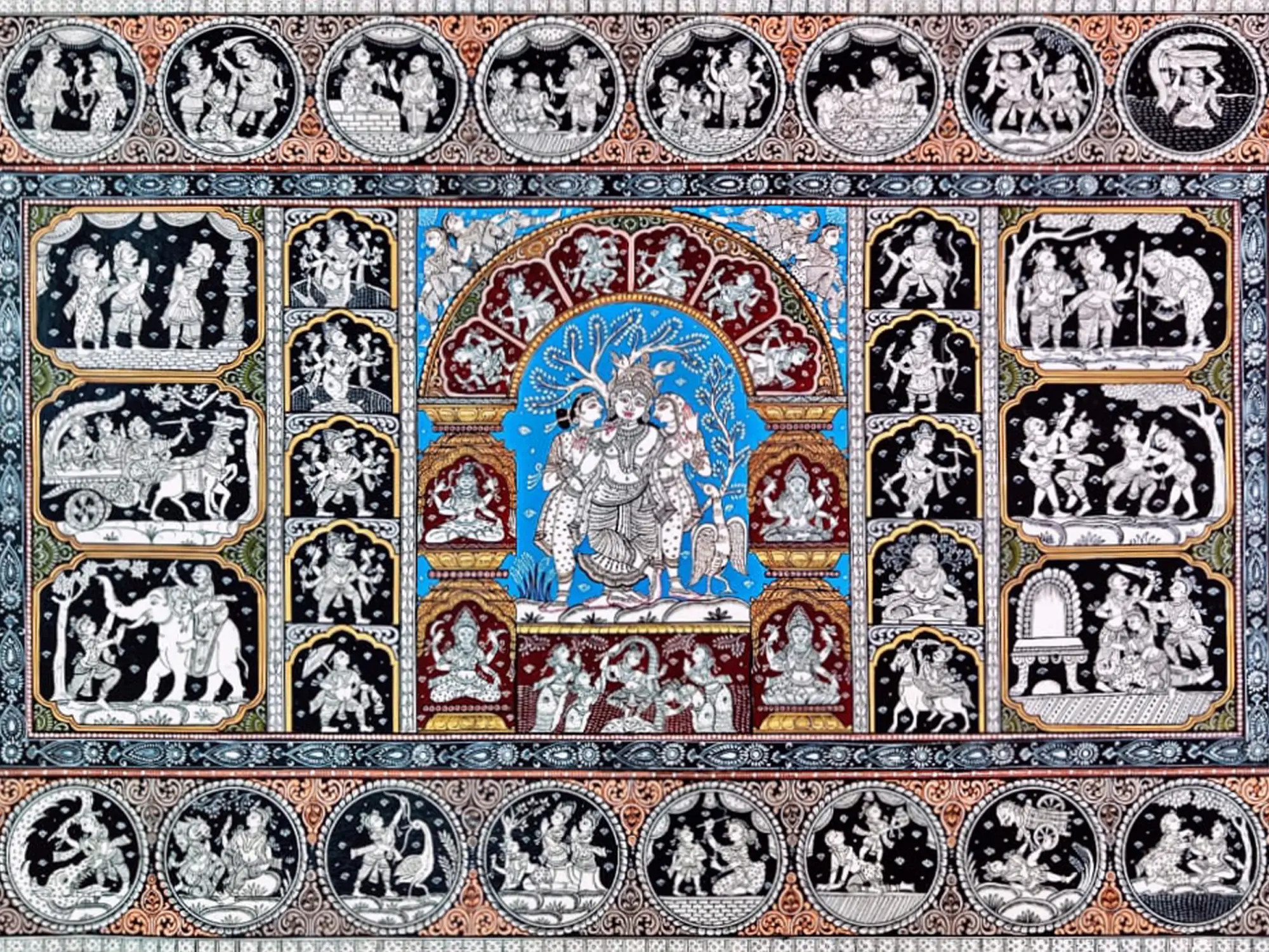 The expansive 30.00-inch height and 48.00-inch width offer a grand stage for this sacred depiction. The central panel, awash in a serene blue sky, showcases Krishna and Radha amidst a flourishing tree, their forms gracefully delineated. Surrounding this serene core, a series of circular vignettes present the Dashavatar, the ten principal avatars of Vishnu, each capturing a pivotal moment from their epic tales. The intricate borders, adorned with detailed patterns, further frame the divine drama, drawing the eye across the entire composition.