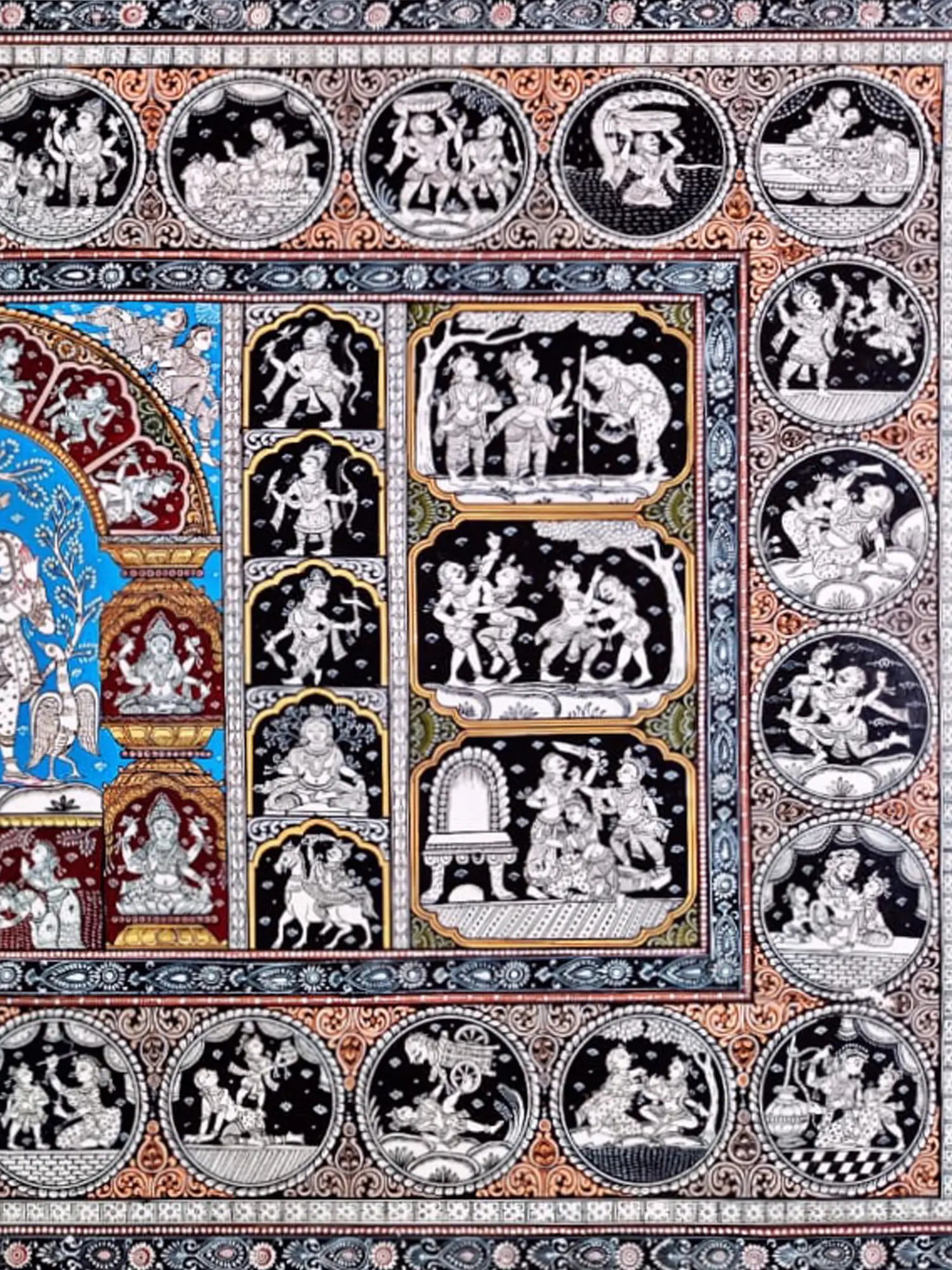Immerse yourself in a visual narrative that unfolds the divine essence of Vishnu's avatars, centered by the playful charm of Krishna. This masterful creation invites contemplation and enriches any space with its profound spiritual depth and exquisite artistry. It is more than a painting; it is a testament to enduring faith and exceptional craftsmanship.