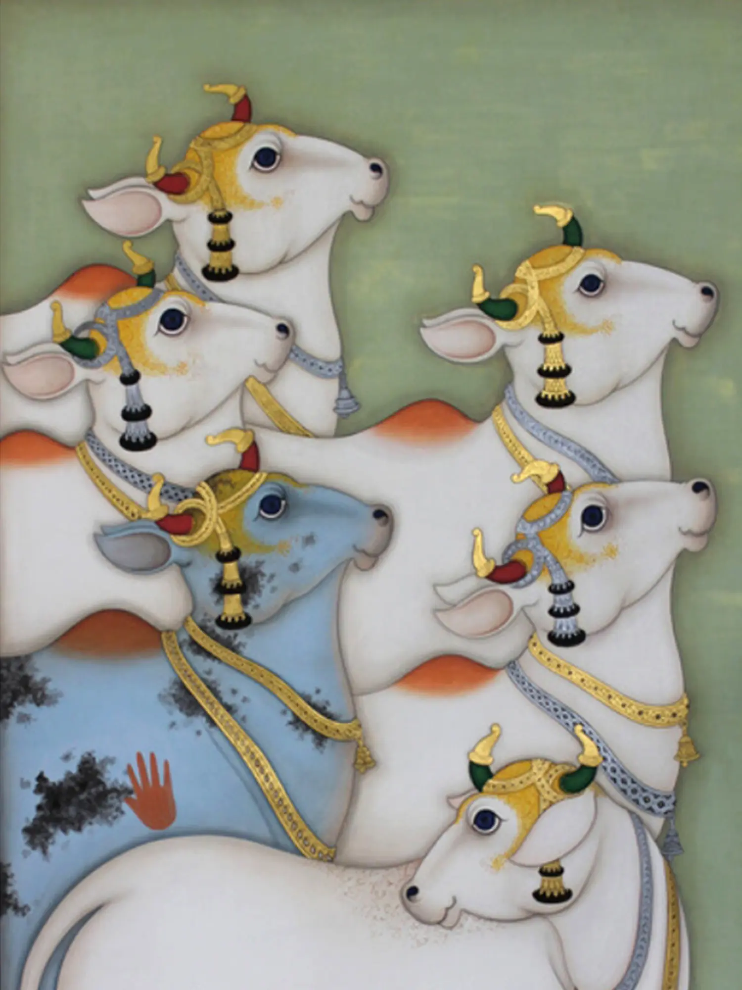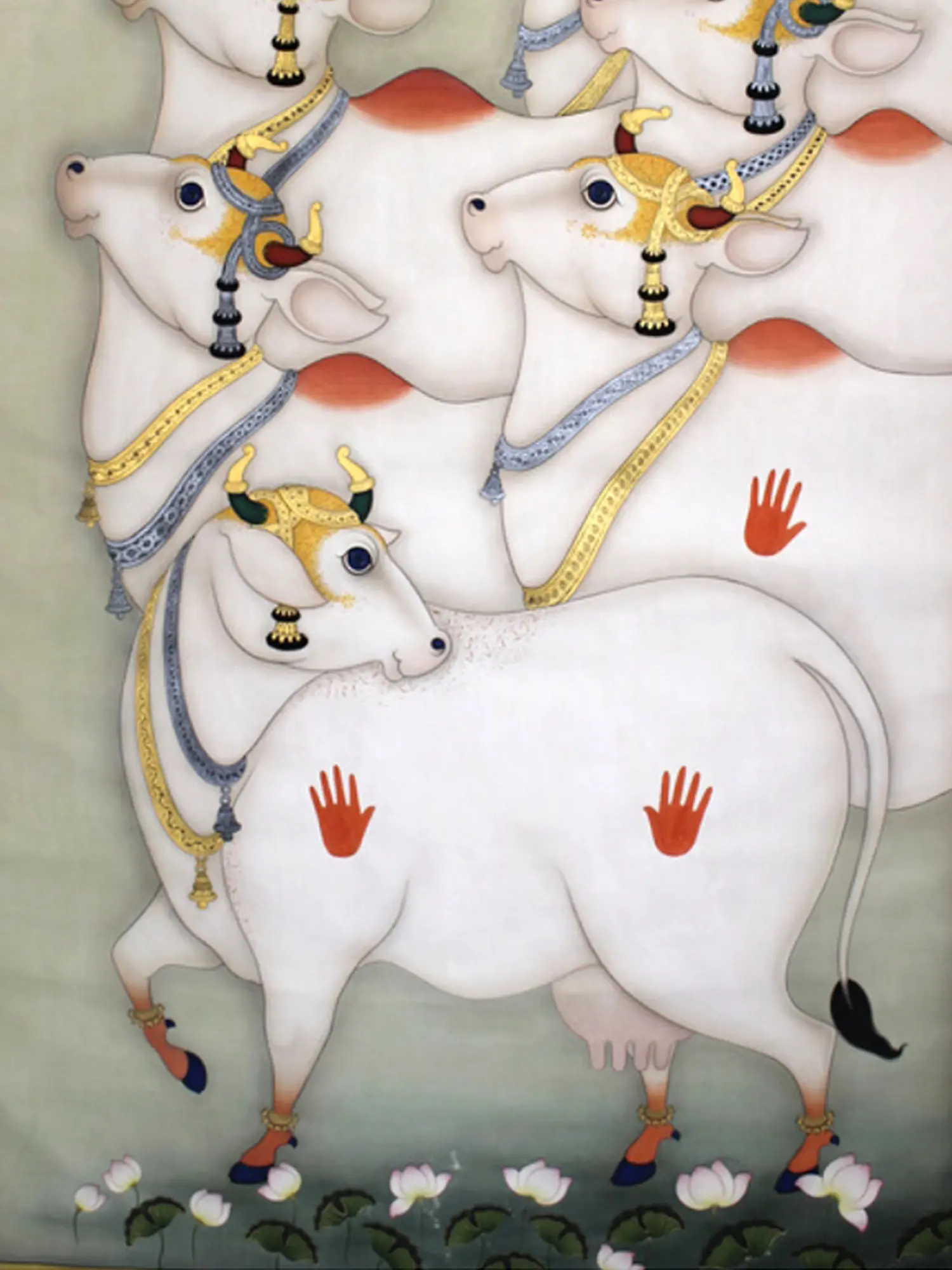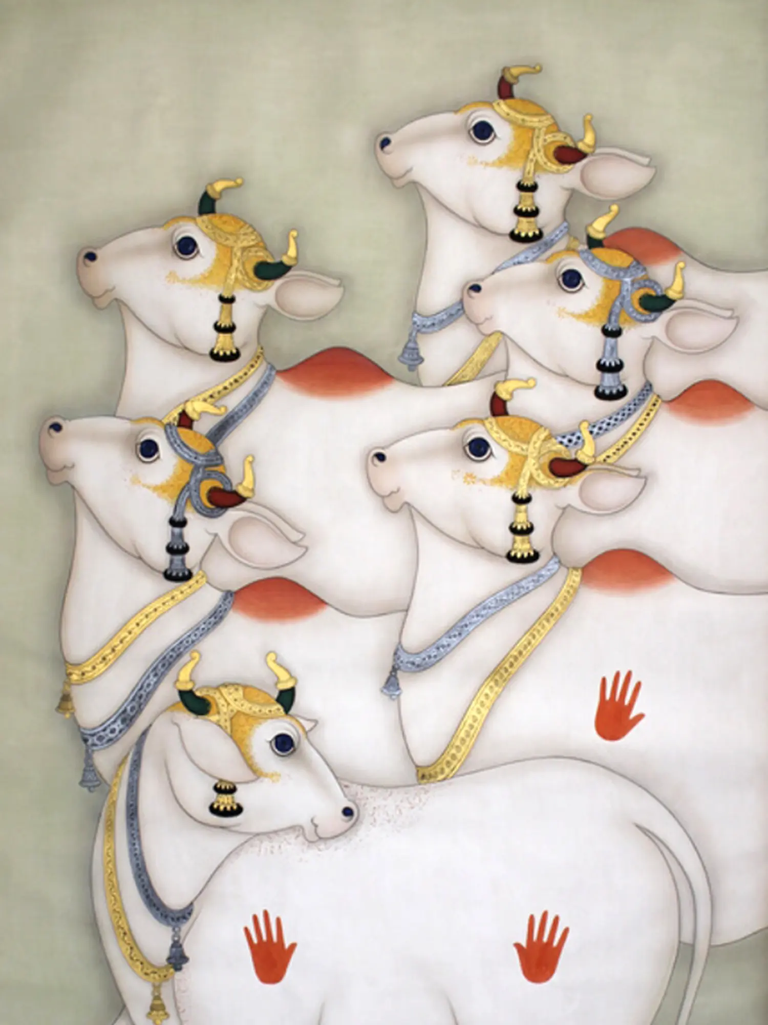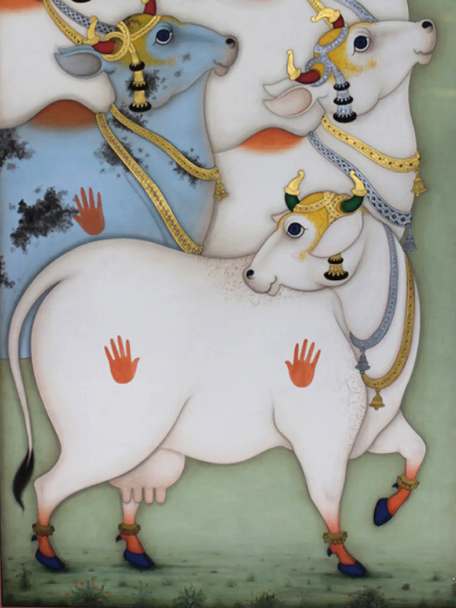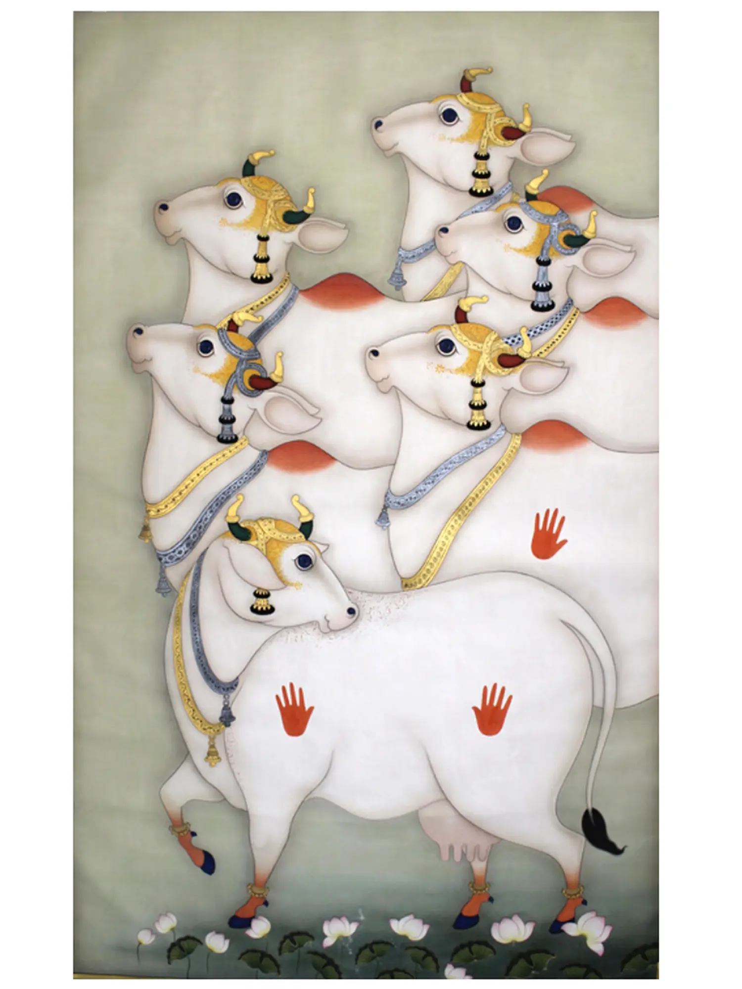 These depictions pay homage to the sacred cows revered in Indian culture, often associated with Kamadhenu, the divine wish-fulfilling cow. They are also intrinsically linked to Lord Krishna, who is famously known for his pastimes with cows in the village of Vrindavan. The art style itself echoes the rich heritage of Indian miniature painting, characterized by its exquisite detail, vibrant palette, and devotional subject matter.