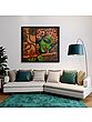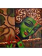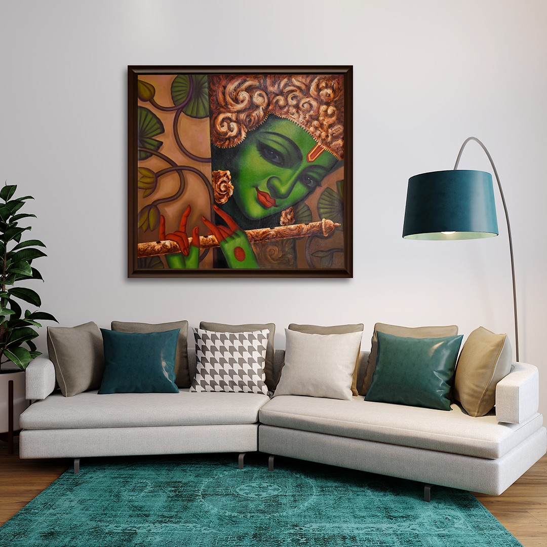 An aesthetic aide memoire to Sri Krishna’s magical flute, this oil painting on a square canvas unites Krishna with the lush green creepers of Vrindavan that are enlivened by his tunes. It seems as if the leaves and the branches have become his ornaments, flute, and even his skin. The tints of red against Krishna’s green-hued skin create a charming image, of Prakriti’s (female element, also Nature and Shakti) unity with Purusha (supreme male aspect).