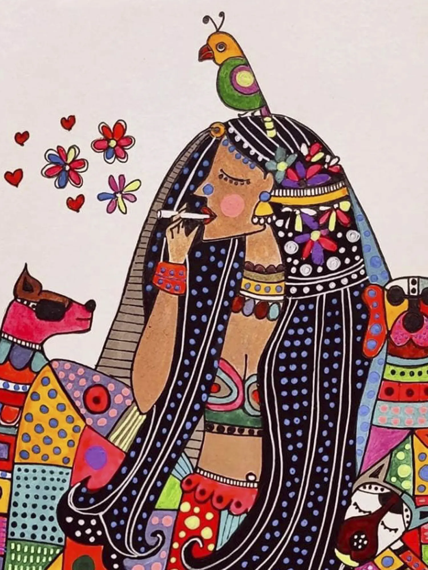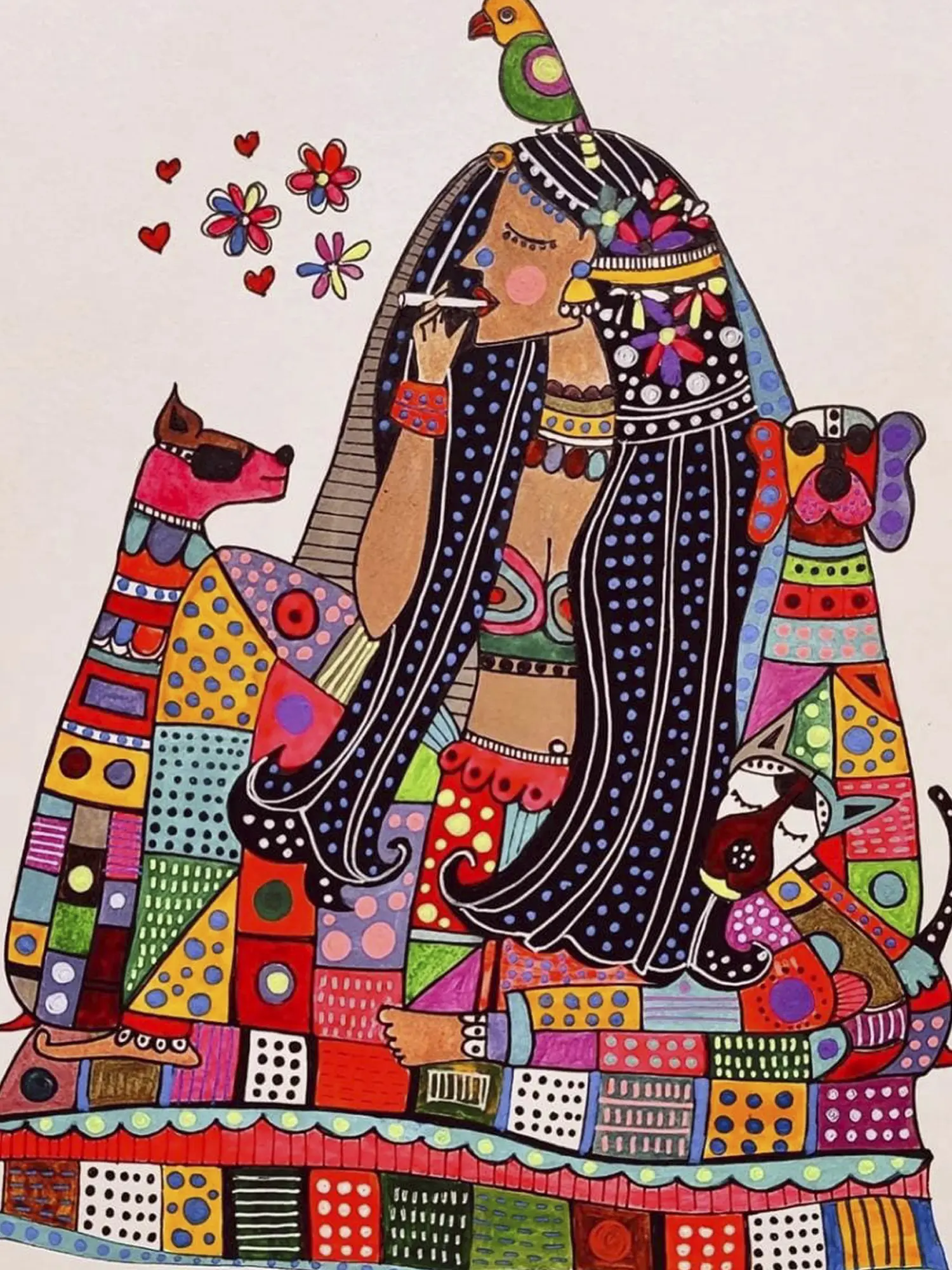 The composition unfolds with a whimsical elegance, presenting a figure embraced by loyal canine companions. Notice the intricate patterns adorning the central figure's attire and the playful, almost mosaic-like rendering of her companions, each element contributing to a lively and engaging visual story. The bright, saturated palette and the charming depiction of floral accents and hearts evoke a sense of lighthearted festivity that resonates deeply.