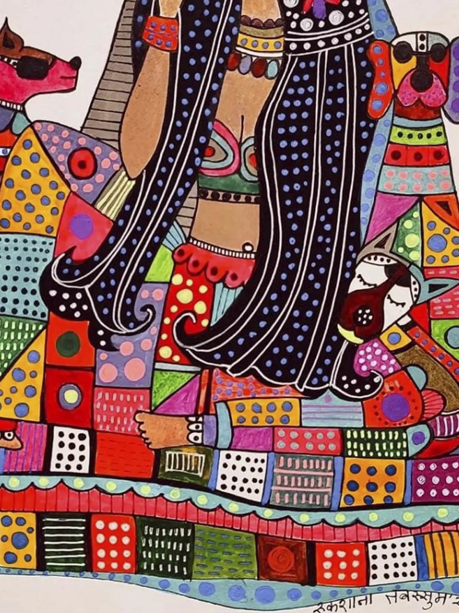 This creation carries the vibrant essence of South Asian folk art traditions, known for their bold use of color and expressive storytelling. The stylistic choices and the subject matter, celebrating the bond between humans and animals, speak to universal themes of love, loyalty, and domestic bliss, offering a connection to a rich cultural heritage. It captures a spirit that transcends borders, resonating with anyone who cherishes these connections.
