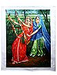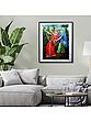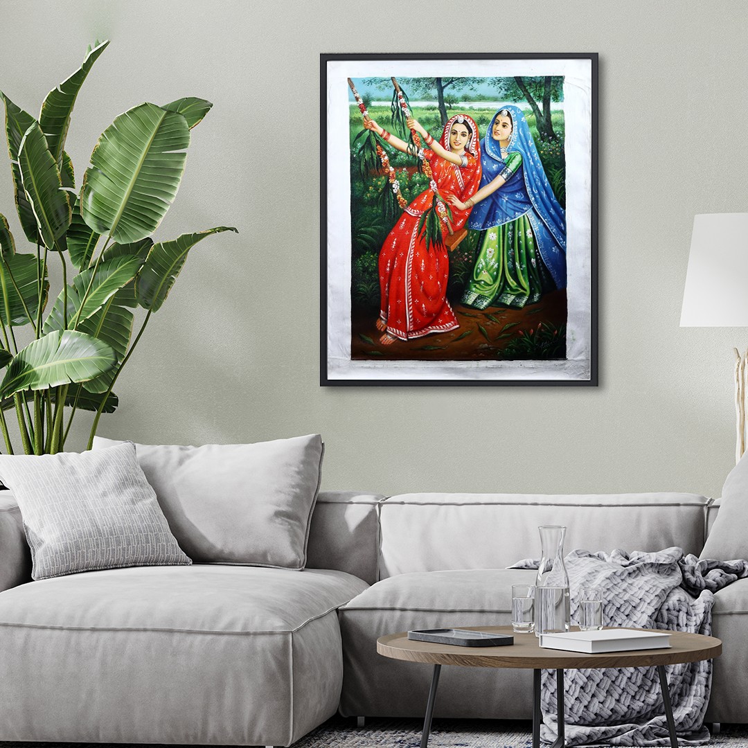 In this vibrant oil painting, two youthful ladies, probably friends, enjoy the swing and each other's company, all decked in colourful garments and traditional jewellery. Both the women are wearing colours (especially red and green) that signify auspiciousness. The lady dressed in a red sari is wearing ornaments such as toe rings highlighting her status as a married woman. The strings of the swing are wrapped in aamr Pallava (leaves of the mango tree) and freshly bloomed flowers. These attributes (married woman, fresh flowers and leaves of mango tree) when combined, create traditional Indian imagery of fecundity and prosperity, promising similar energies for the space this oil painting will decorate.