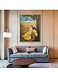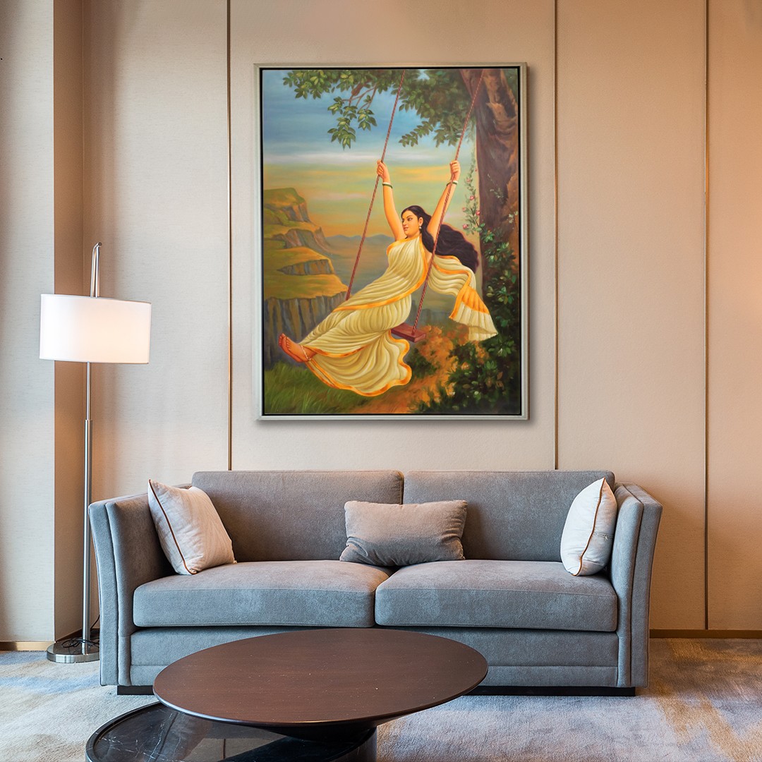 This large size canvas portrays a young damsel, clad just in a sari and minimum ornaments, a chain on her feet, a pair of green and white bangles on each of her wrists, a lace of black beads around her neck, a ring on one of her fingers, and canopied pendants on ears, enjoying a swing : a piece of a wooden sleeper suspending along a rope from the branch of a huge tree. Though twisted with cords of two or more colours, the rope and the wood-piece are quite simple. Except its deep waving folds creating variegating colour-effects and a broad saffron border – shining but plain, her sari, rendered in opaque yellow, light and dark, is a simple length of textile. Most luxuriously floats her hair to her left affording pleasant contrast to her effulgent figure, her gold-like glowing arms, and rose-like radiating face. True to the concept of the lotus feet, as it prevailed in early aesthetics, the figure is endowed with gently conceived feet revealing silken softness of lotus petals. Her dreamy eyes, sharp features, oval face, cute lips and a well defined neck, all reveal exceptional beauty and grace.