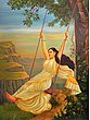 The swing-vocabulary travelled farther into other domains. The metaphysicians, theologists and even the modern psycho-analysts, have been long using it – the imagery of swing, for defining the wanderings of self and a vacillating, wavering or indecisive mind, and aestheticians, poets and painters, for revealing bodily charms for when swinging with her arms raised, legs stretched and hair blowing with the wind the figure of a woman revealed its utmost beauty and grace. The entire medieval feudatory had across centuries in its gardens and palace parts provisions for a swing, and not only the modern elite, a bureaucrat, or a rich trader but even a middle class household takes pride in having a swing in its lawn, veranda or courtyard. A timeless theme of Indian art as also life, the swing did not fail in attracting the fancy even of the modern painters like Raja Ravi Varma, despite working under the influence of European art styles. Portrait painting was more often their choice but the swing-theme which gave them ample scope for combining with the portrait of a young person engaged in an exercise which exposed her to her most bewitching charms and figural grace the magic of a natural surrounding, also gained from them as much favour.