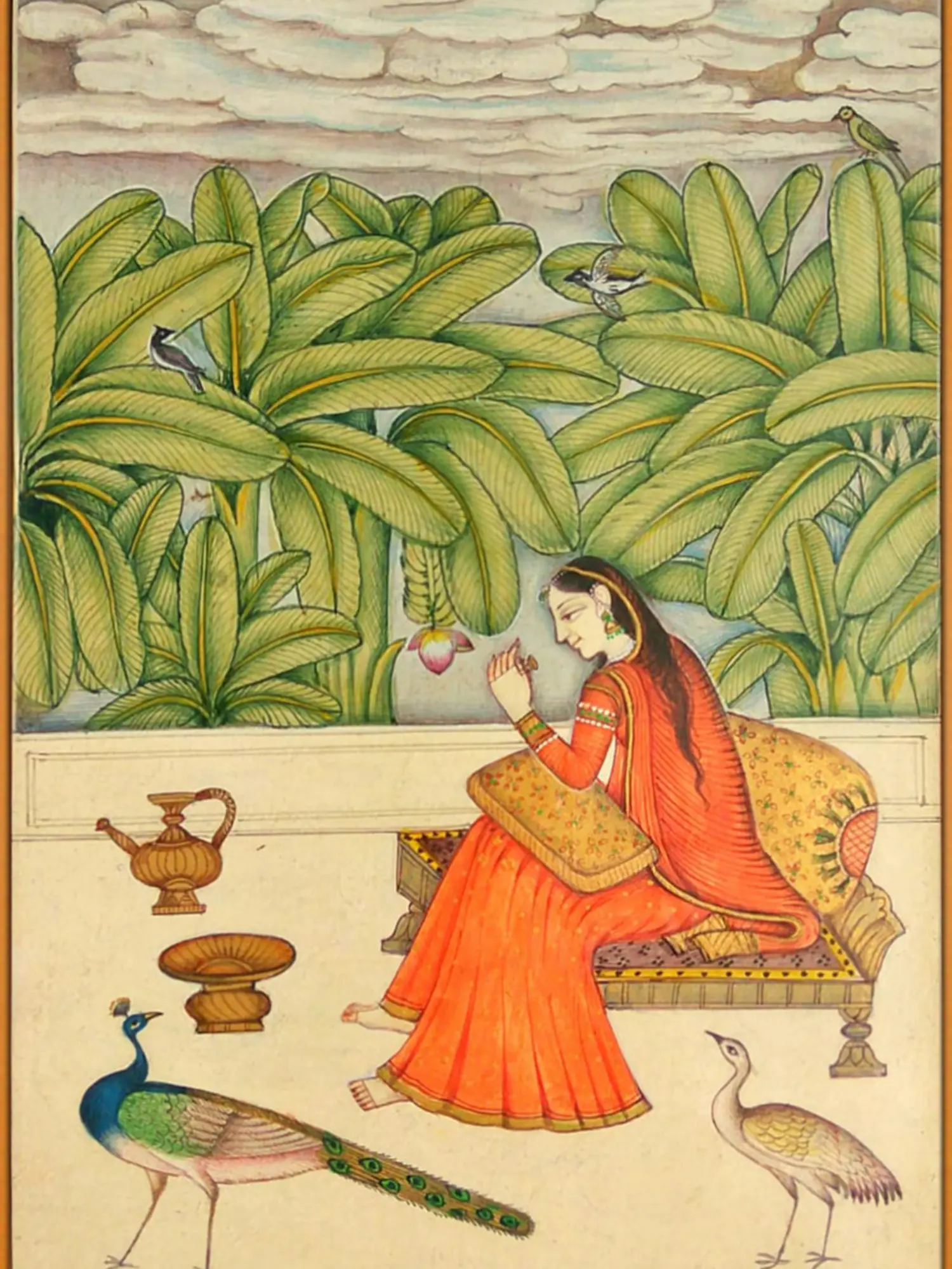 This portrayal resonates with the rich tradition of miniature painting found in Indian art, often depicting courtly life, mythological tales, and scenes of serene contemplation. It evokes the spirit of Mughal and Rajput art, celebrated for their intricate detail, vibrant colors, and narrative depth, offering a window into a world where beauty and personal reflection intertwine. You’ll feel a connection to generations of artistry that have sought to capture such moments of quiet grace.