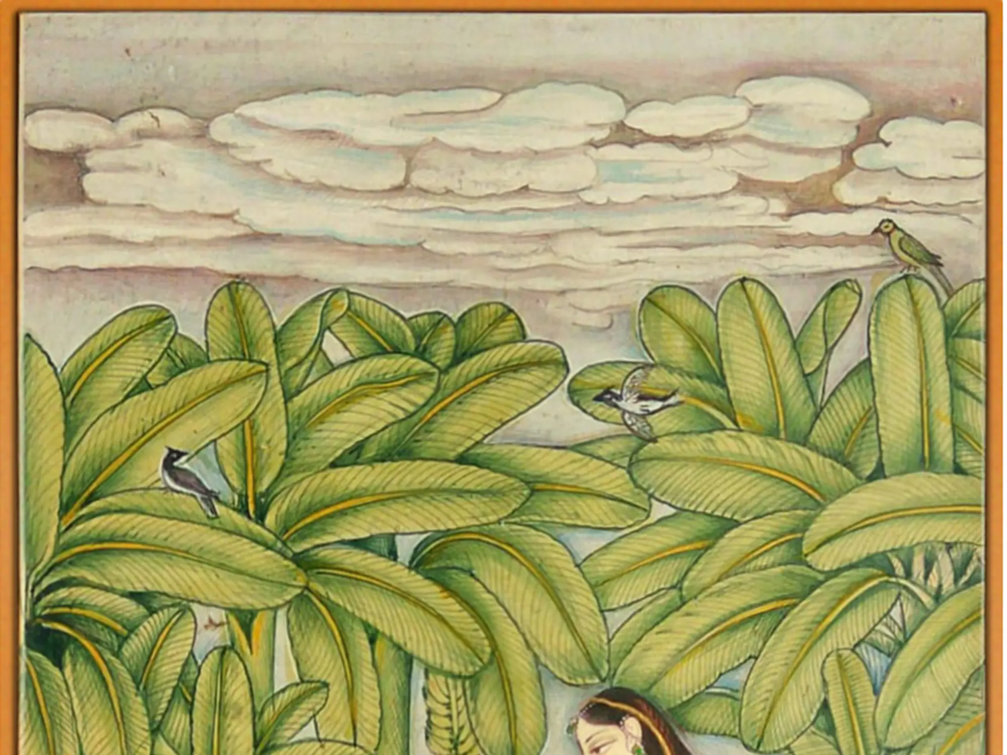 The composition, measuring approximately 9.40 inches in height and 7.00 inches in width, is thoughtfully arranged to draw the viewer's eye. The verdant backdrop of lush banana leaves creates a sense of secluded luxury, contrasting beautifully with the gentle hues of the sky. Observe the graceful posture of the woman as she gazes into her mirror, her hands poised with delicate intent. The presence of a proud peacock and an elegant crane adds a touch of natural grandeur, while the ornate vessels suggest a scene of refined domesticity.