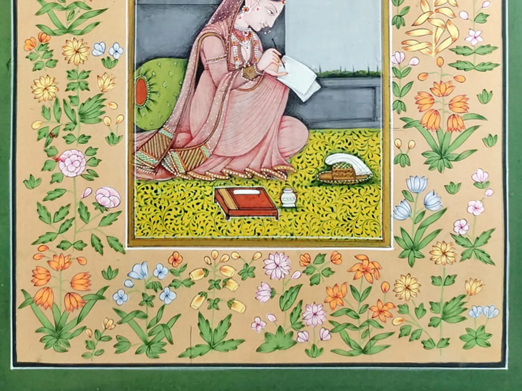 Attired in delicate pink, the color of gentle emotions of love, the Nayika, or heroine in this Kangra style painting by Gaurav Rajput is engrossed in making ink out of her emotions and pouring it on the letter. Bordering the painting with a beautiful floral layout, the artist offers a Jharokha (window) to the onlooker, to immerse themself in the beauty of the heroine. Seated on a lovely patterned rug, against a green bolster, the louts-eyed heroine holds the pen in her delicate hands, placing it on the empty paper, as if pausing to recall the sweet memories of her beloved. Her attire and ornaments are delineated marvelously, with fine folds of the garment and luster of jewelry highlighted by fine details. Collecting her thoughts for a moment, the lovely maiden unveils the secrets of her heart in the letter, and the secrets of enchanting ancient aesthetics on the canvas.
