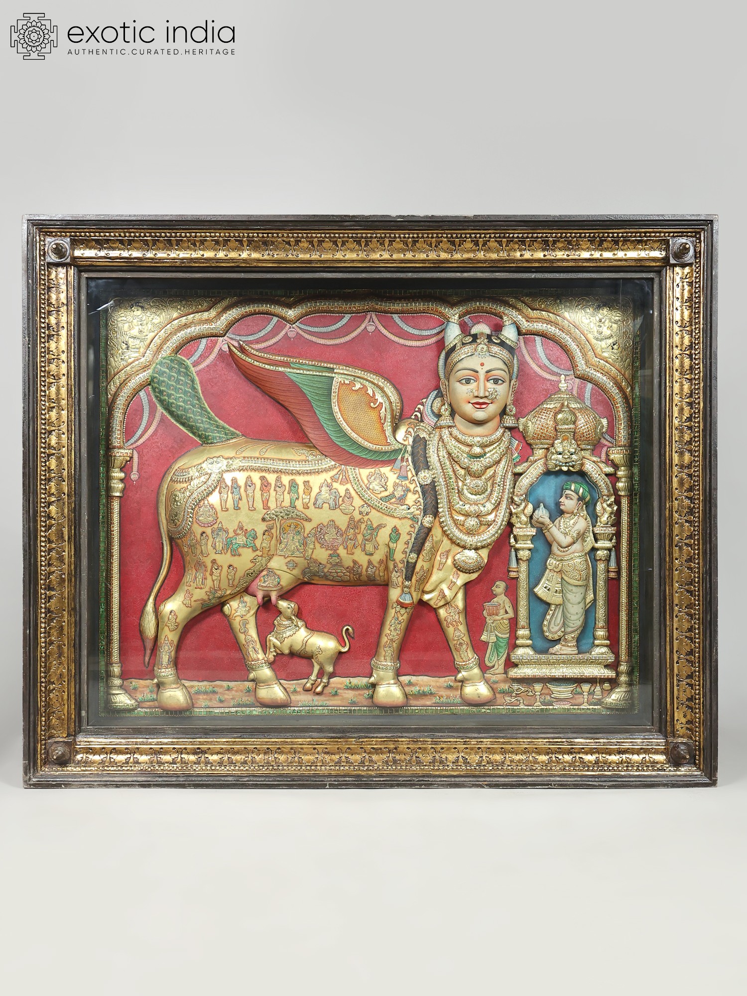 Nandini The Holy Cow Tanjore Painting | Traditional Colors With 24K Gold | Teakwood Frame | Gold & Wood | Handmade | Made In India