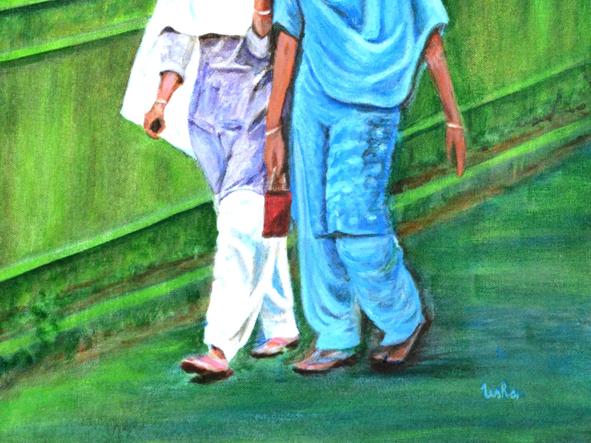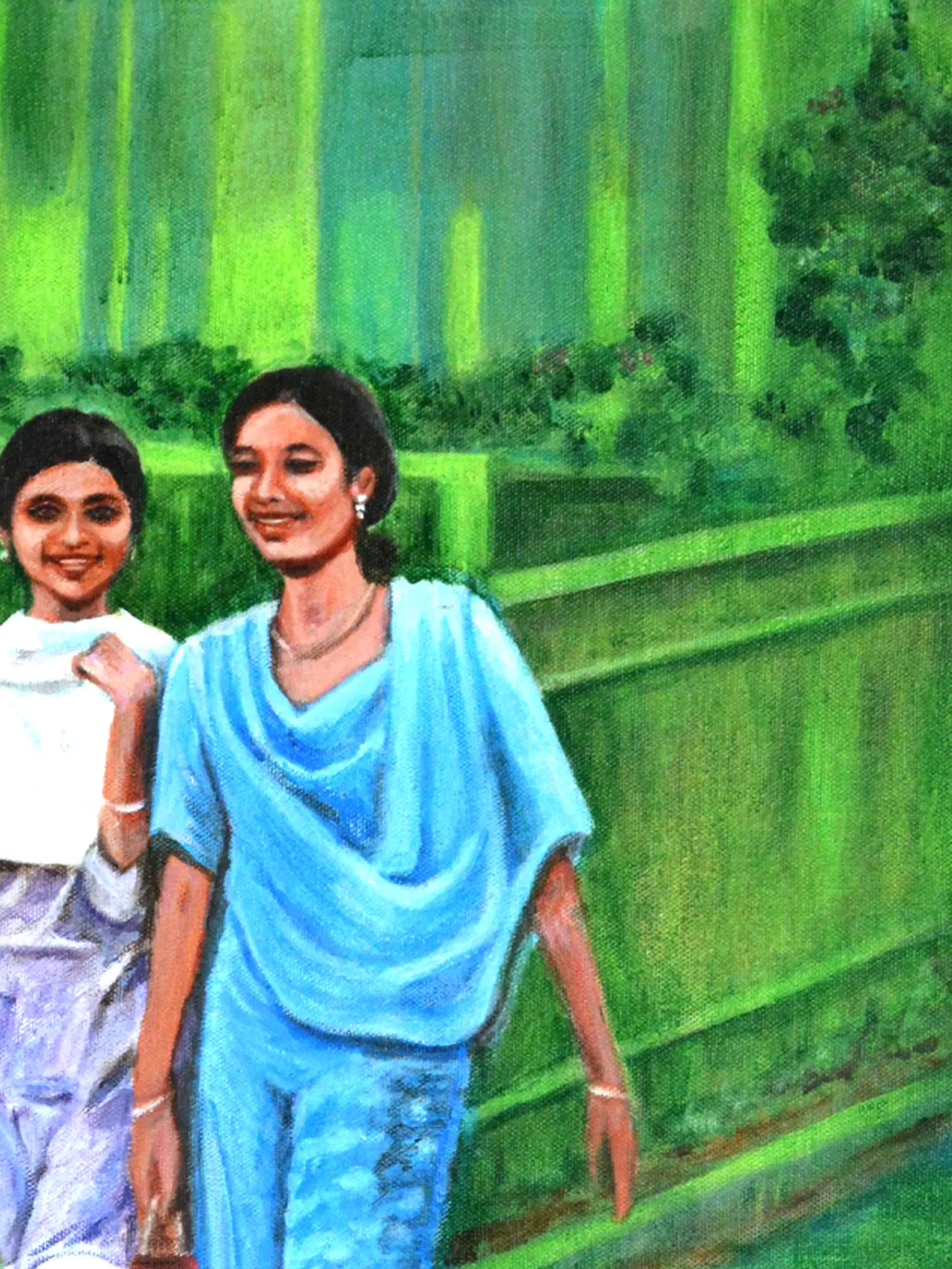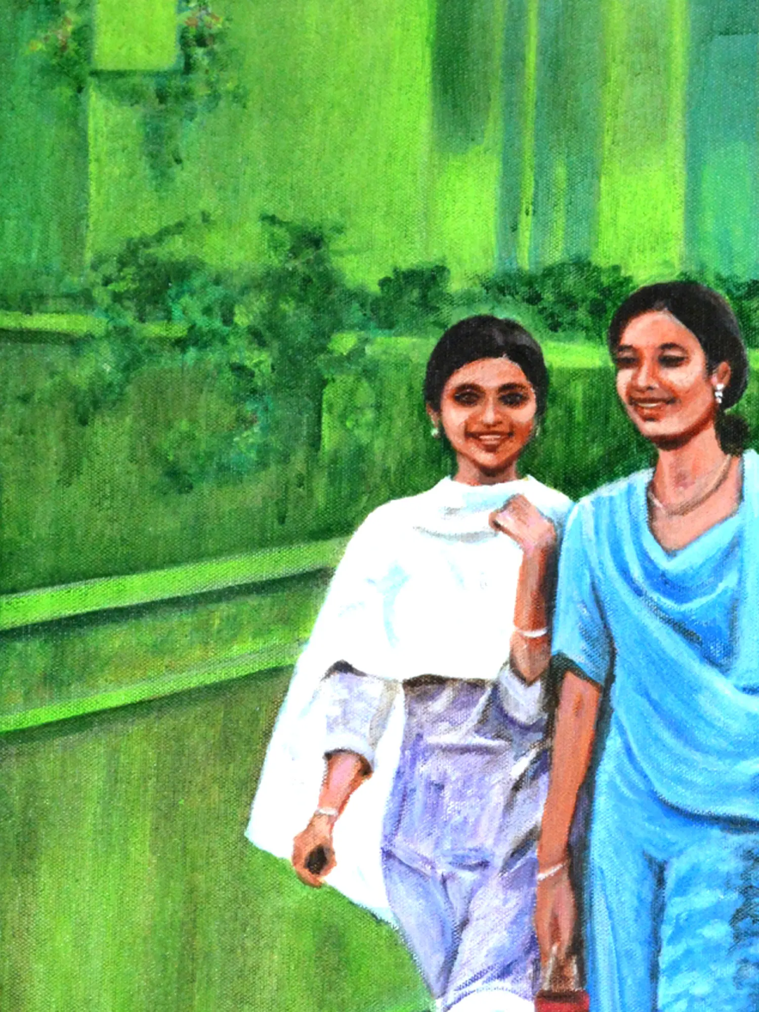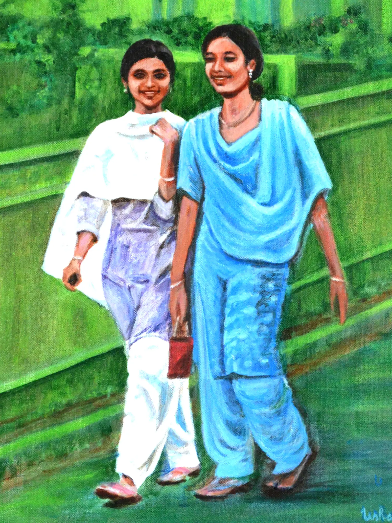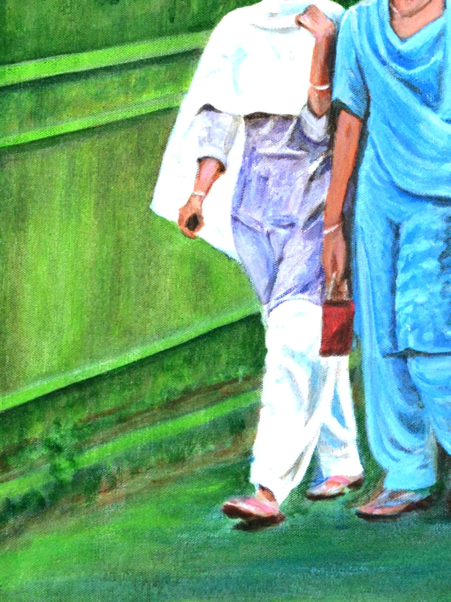 The composition, measuring 20 inches in height and 16 inches in width, is thoughtfully arranged to draw your eye to the radiant expressions of the two figures. You'll appreciate the play of light and shadow across their features, highlighting their joy. The lush green backdrop provides a serene contrast, allowing the figures and their vibrant attire to truly shine, rendered in the expressive medium of acrylic.