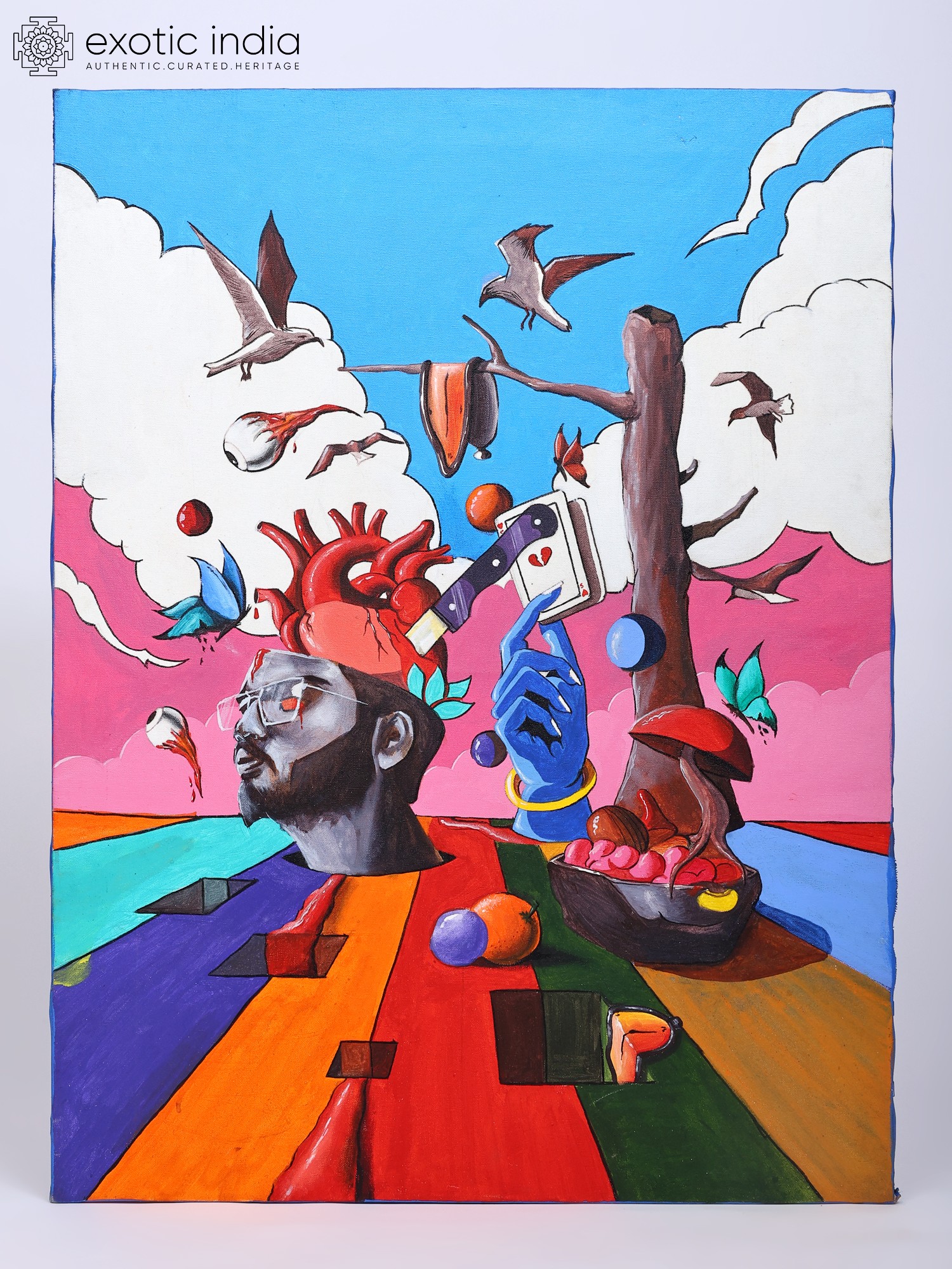This striking acrylic painting, "Life Moving Towards Darkness," invites viewers into a dreamlike landscape where the boundaries between reality and the subconscious blur. The artist masterfully employs a vibrant, yet unsettling palette, with bold strokes of crimson, sapphire, emerald, and orange clashing and merging to create a powerful emotional resonance. This work is not merely a visual spectacle; it is a profound exploration of the human condition, touching upon themes of introspection, emotional fragility, and the ever-present duality of light and shadow that defines our existence.