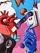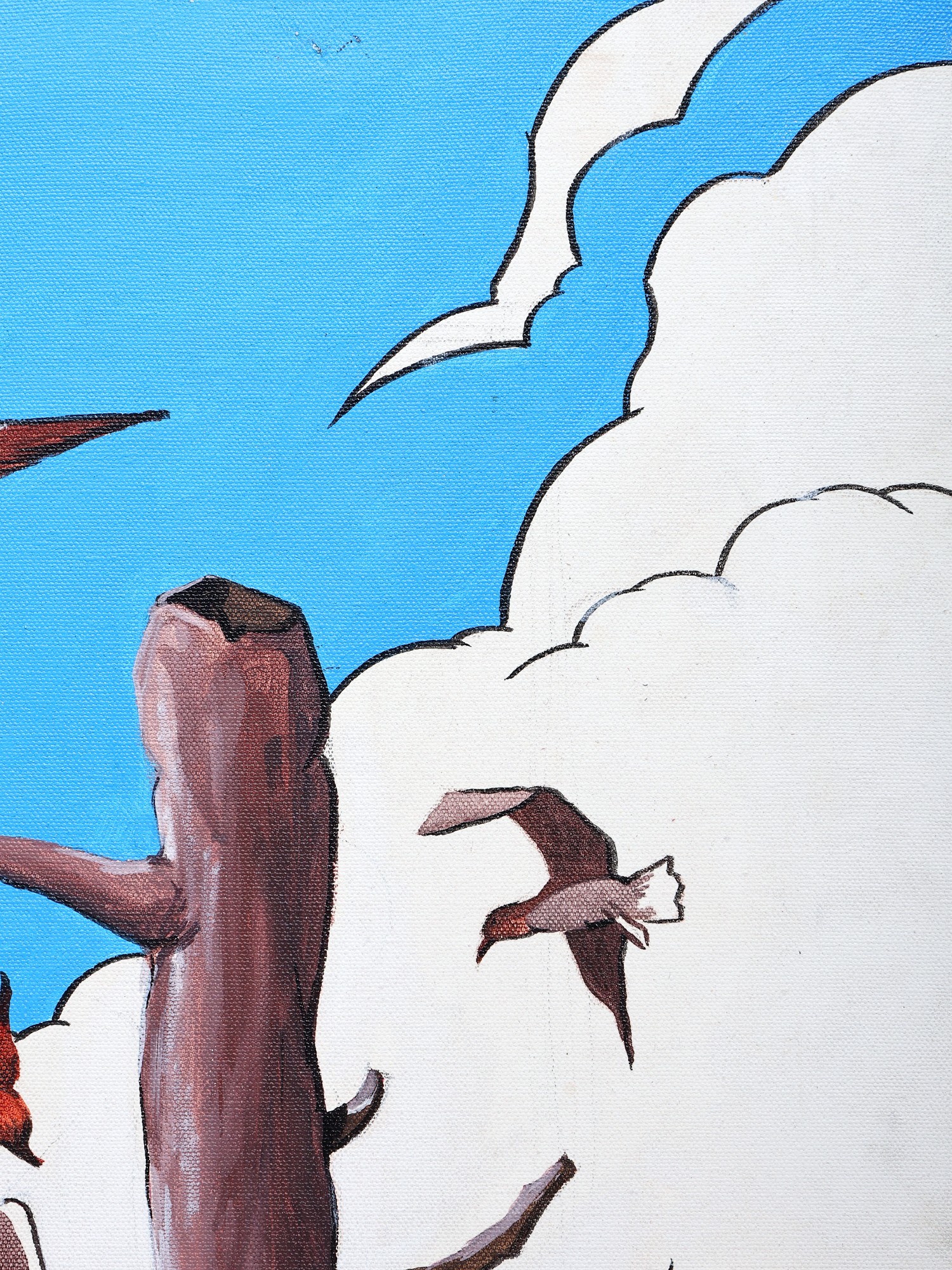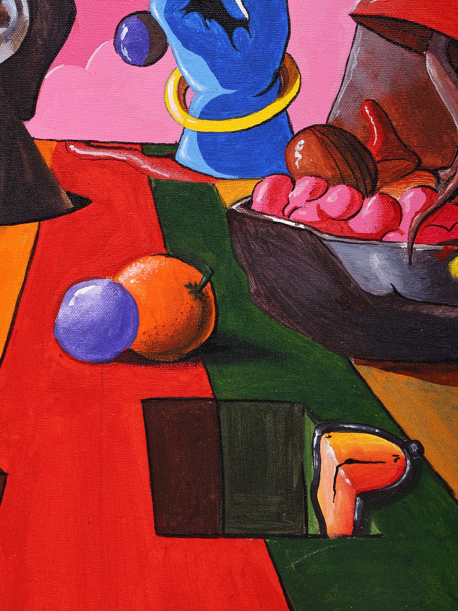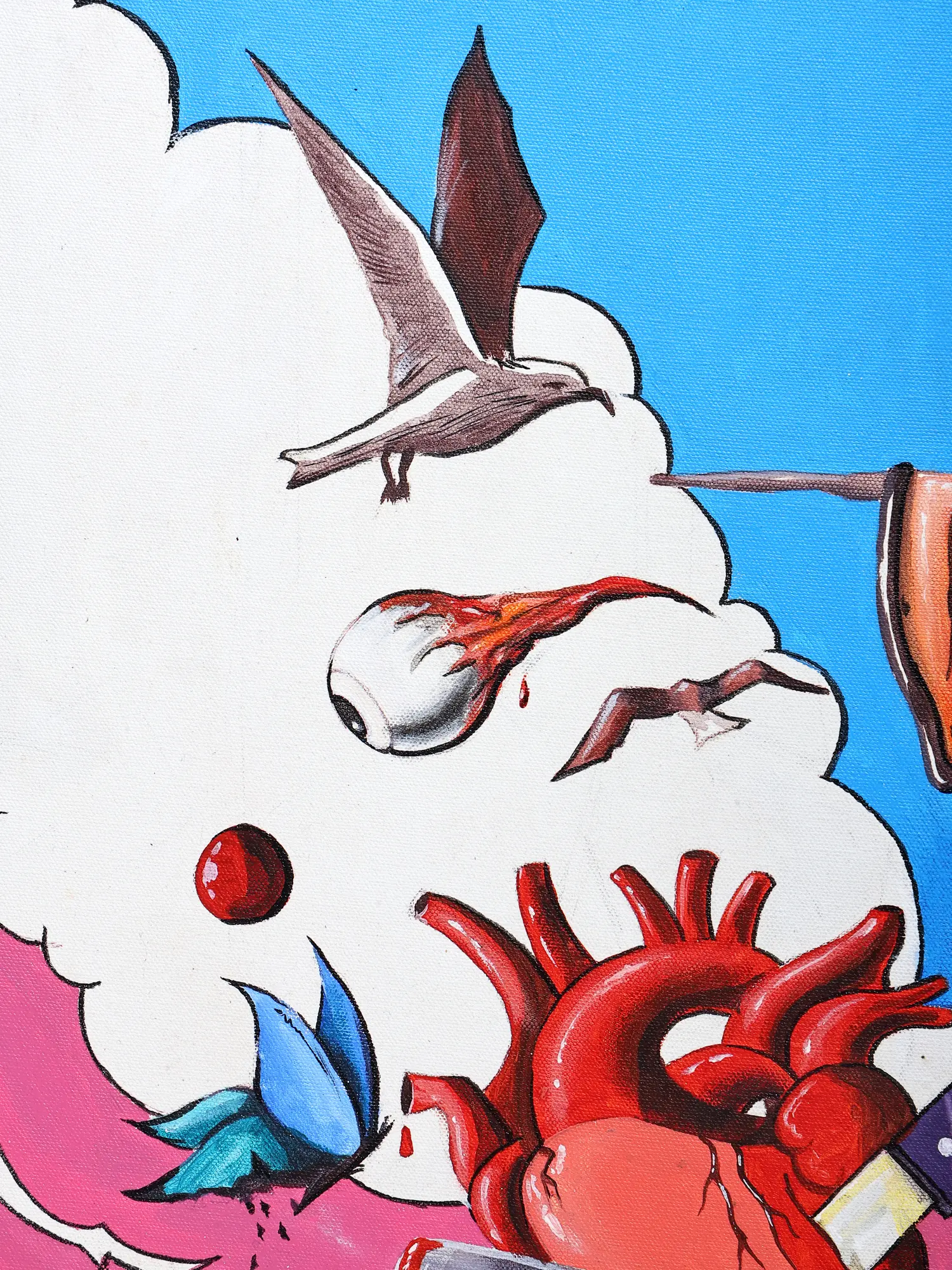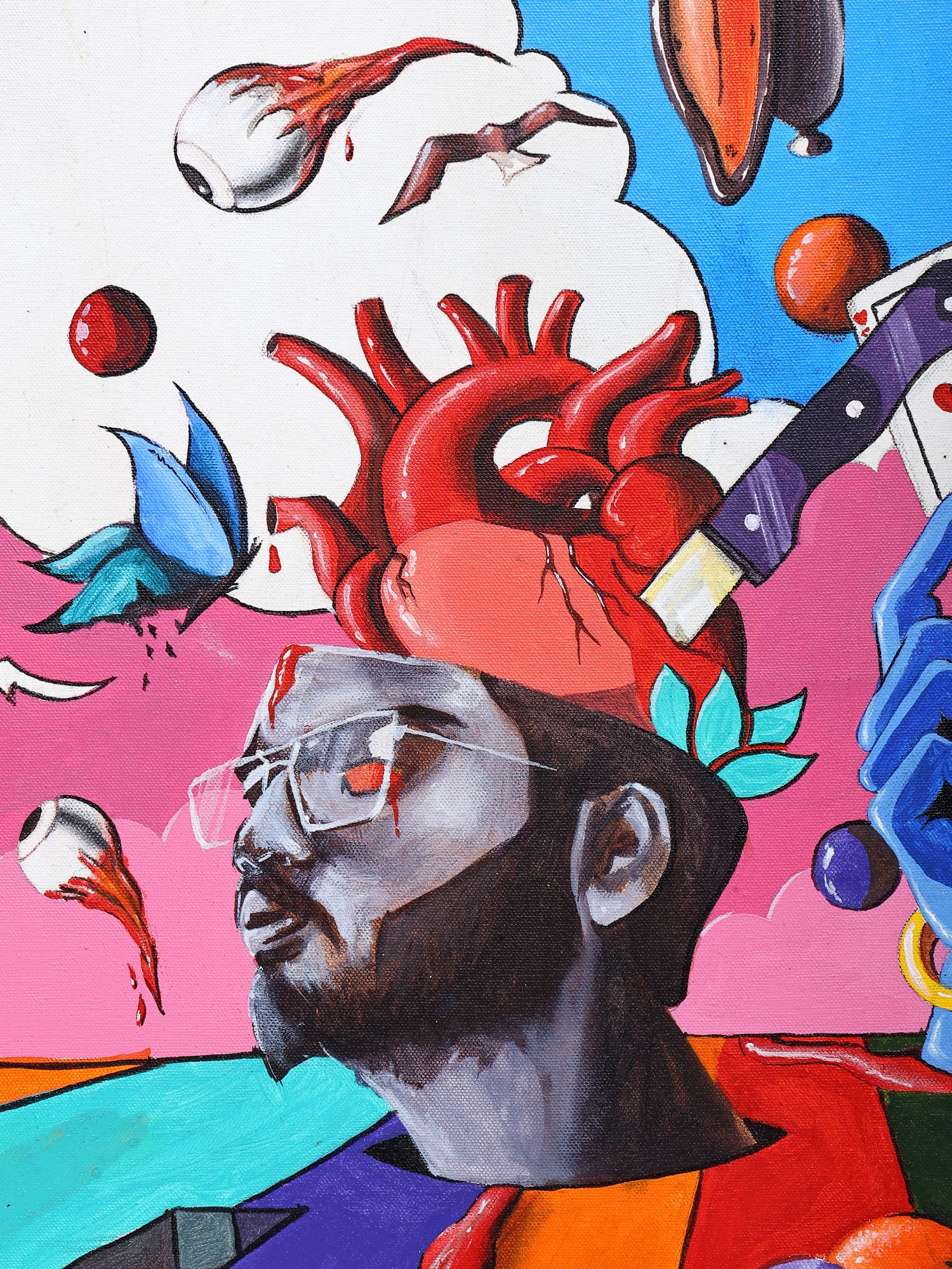 The central figure, a man with introspective gaze and glasses, appears to emerge from this complex visual narrative. His profile suggests deep thought, perhaps a grappling with the symbolic elements surrounding him. The vibrant, geometric pathway beneath him, fractured and leading into what appears to be darkness, mirrors the internal struggles and uncertainties we all face. The torn and peeling ground hints at the instability and impermanence of our perceived reality. The floating eyeballs, detached yet observing, add an unsettling layer, questioning the nature of perception and the unseen forces that influence our lives. This painting doesn't offer easy answers; instead, it poses profound questions about our internal worlds, our emotional landscapes, and the constant, often bewildering, movement of life. It is a testament to the artist's ability to translate complex emotions and philosophical concepts into a visually compelling and thought-provoking piece of art.