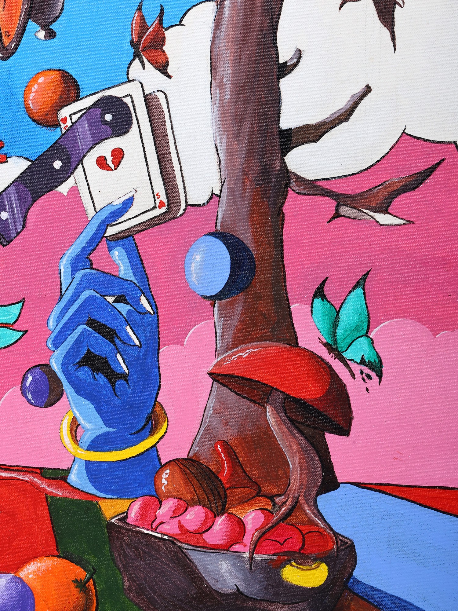The imagery woven into this canvas evokes a sense of timeless allegory. The human heart, exposed and pulsating, speaks to the raw vulnerability of our inner selves, much like the descriptions of divine hearts in various mythologies, offering up their essence or suffering for the world. The falling, melting clock face is a direct nod to Salvador Dalí's surrealist explorations of time's fluidity and our perception of its passage. The solitary tree, stark and bare, could be interpreted as the Tree of Life, Yggdrasil, or the Tree of Knowledge, its branches reaching into an ethereal sky. The birds, often symbols of freedom or messengers in folklore, here seem to circle and perhaps represent fleeting thoughts or anxieties. The broken heart on the playing card, held by an ethereal blue hand, directly confronts themes of love, loss, and the precariousness of fortune, reminiscent of ancient divination practices where symbols held immense predictive power. The various fruits and symbolic objects scattered across the fractured ground allude to the offerings and temptations that punctuate life's journey, from the abundance of the Garden of Eden to the arduous trials faced by heroes in epic tales.