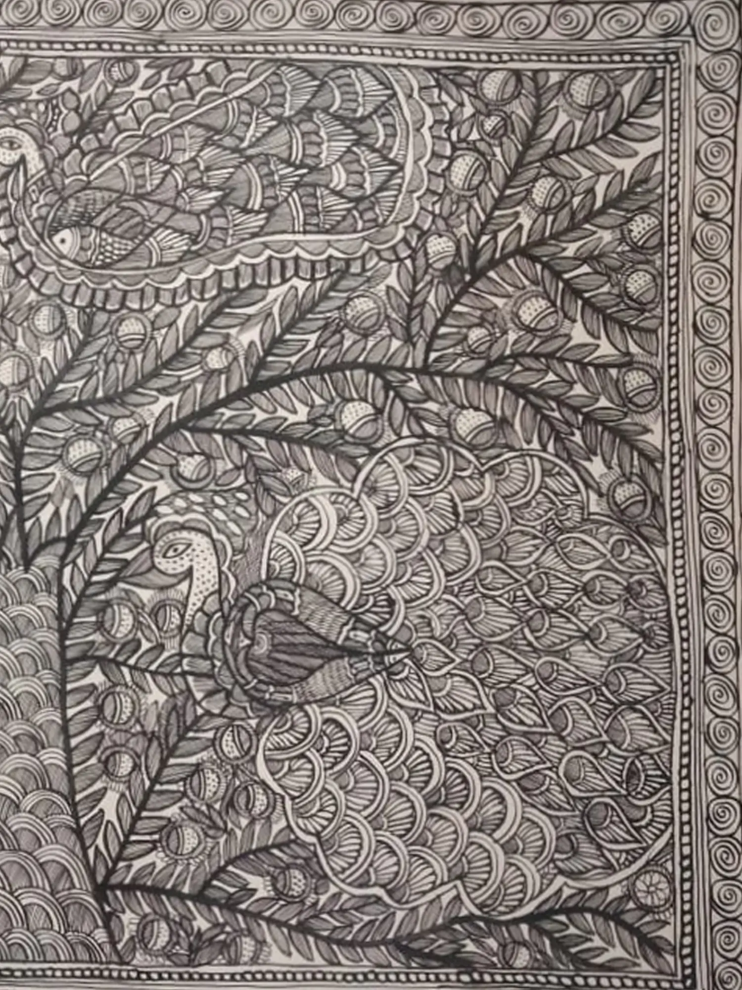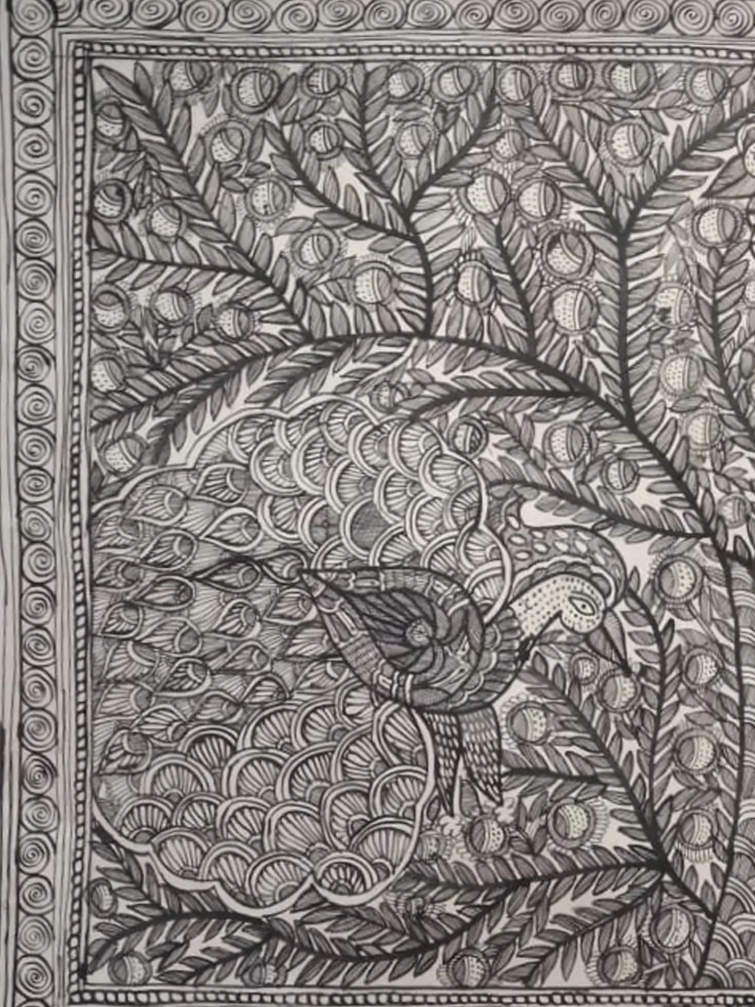 Each element of this artwork is a deliberate stroke of genius, meticulously brought to life by Archana Jha. Created using natural colors derived from the earth, the pigments possess a unique depth and character that synthetic dyes can never replicate. The foundation of this masterpiece is handmade paper, selected for its beautiful texture and ability to absorb and enhance the subtle nuances of the natural hues, ensuring a truly artisanal creation.