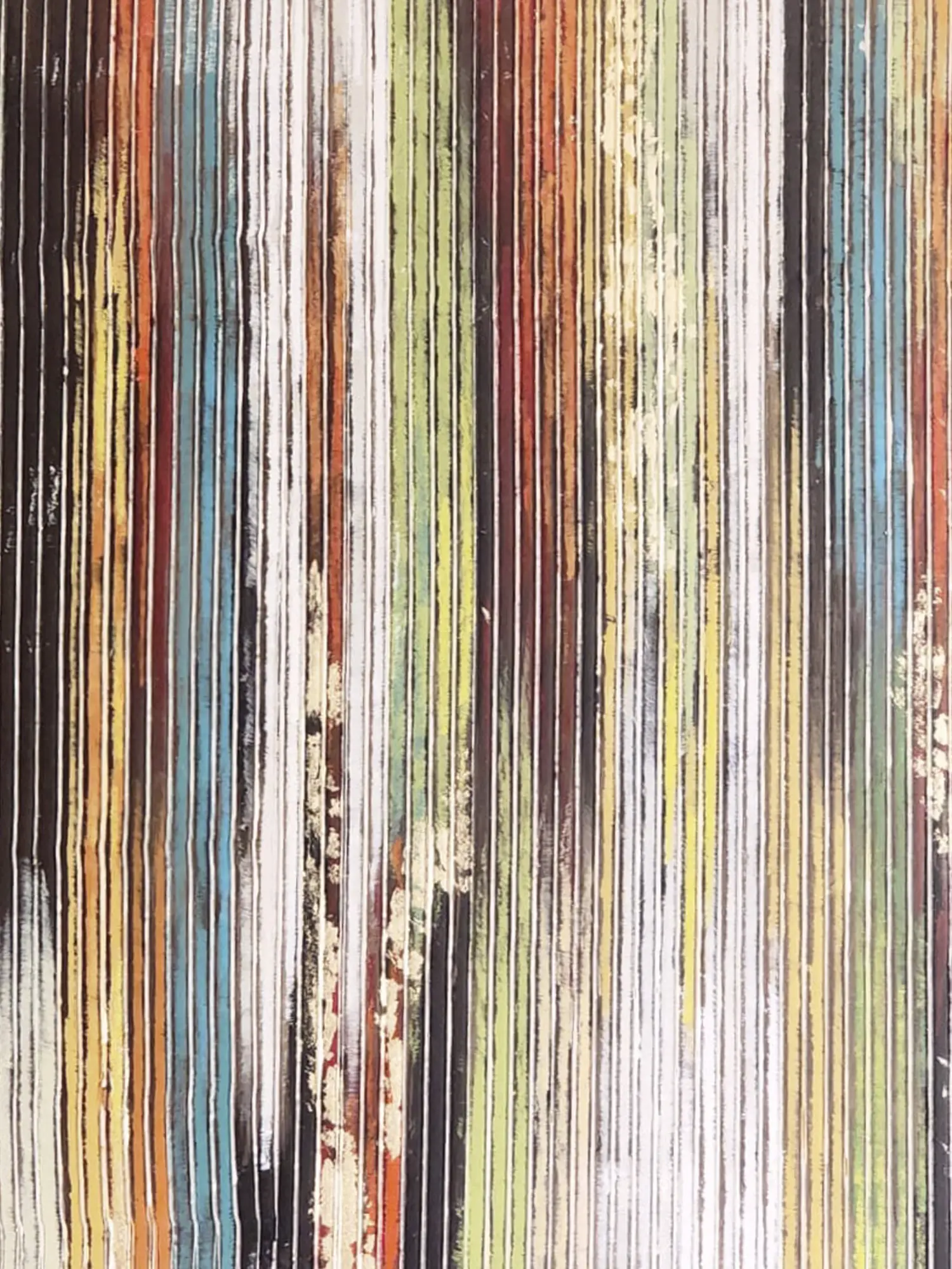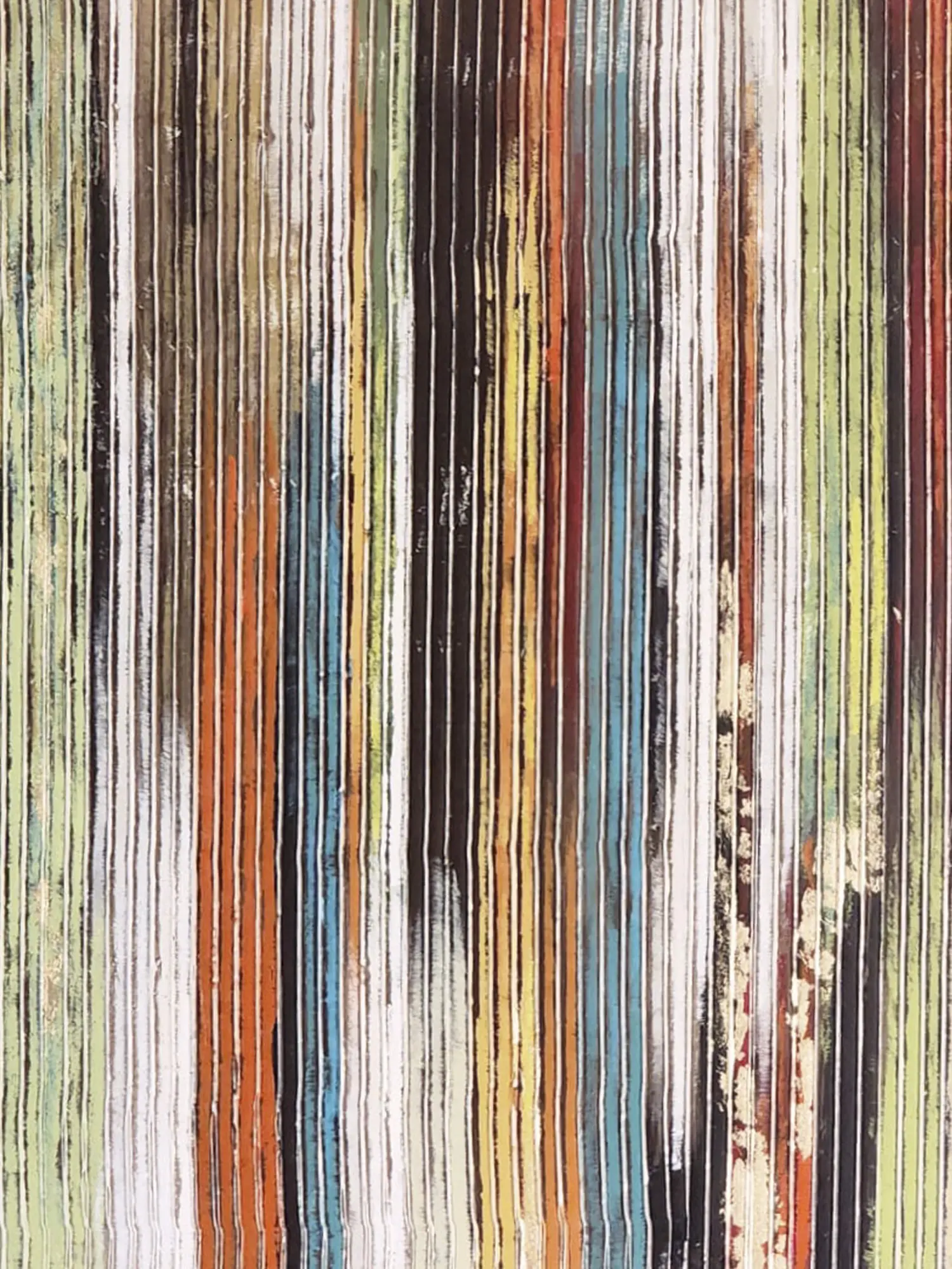 The dynamic composition, measuring twenty-four by twenty-four inches, is defined by its striking vertical linear elements. These bold yet fluid lines, rendered in a palette of earthy tones, vibrant oranges, calming blues, and sunny yellows, create a sense of rhythm and movement. The inherent texture of the paint, enhanced by the delicate application of gold foil, provides a captivating dimensionality. Each viewing reveals new nuances and an interplay of light that shifts and evolves with your perspective.