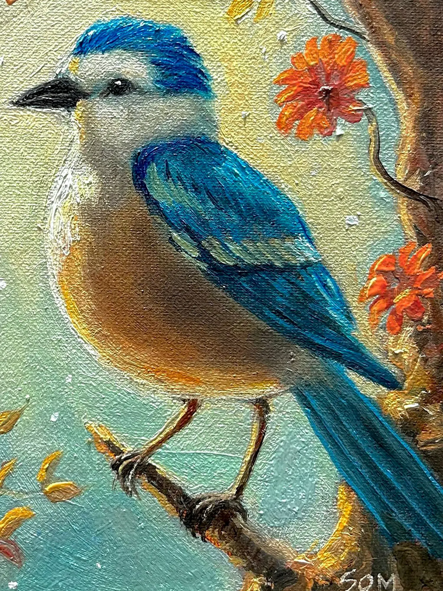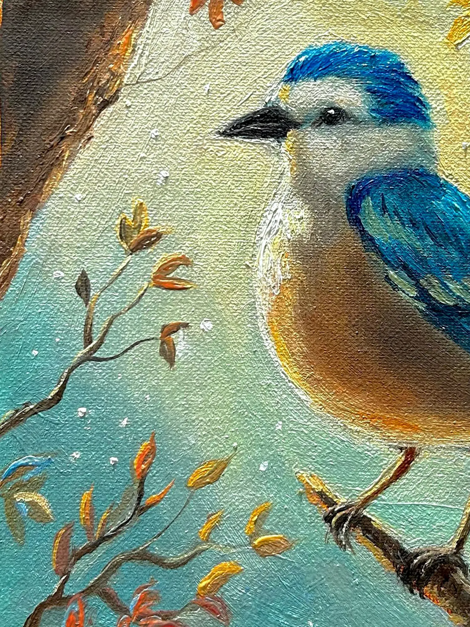 In Somnath Harne's oil on canvas painting, the scumbling technique brings the bird to life with a soft and ethereal quality. Harne skillfully applies thin, translucent layers of paint over a darker base, allowing subtle details to emerge. The feathers, illuminated by the scumbled highlights, create a luminous and textured effect, enhancing the bird's presence.