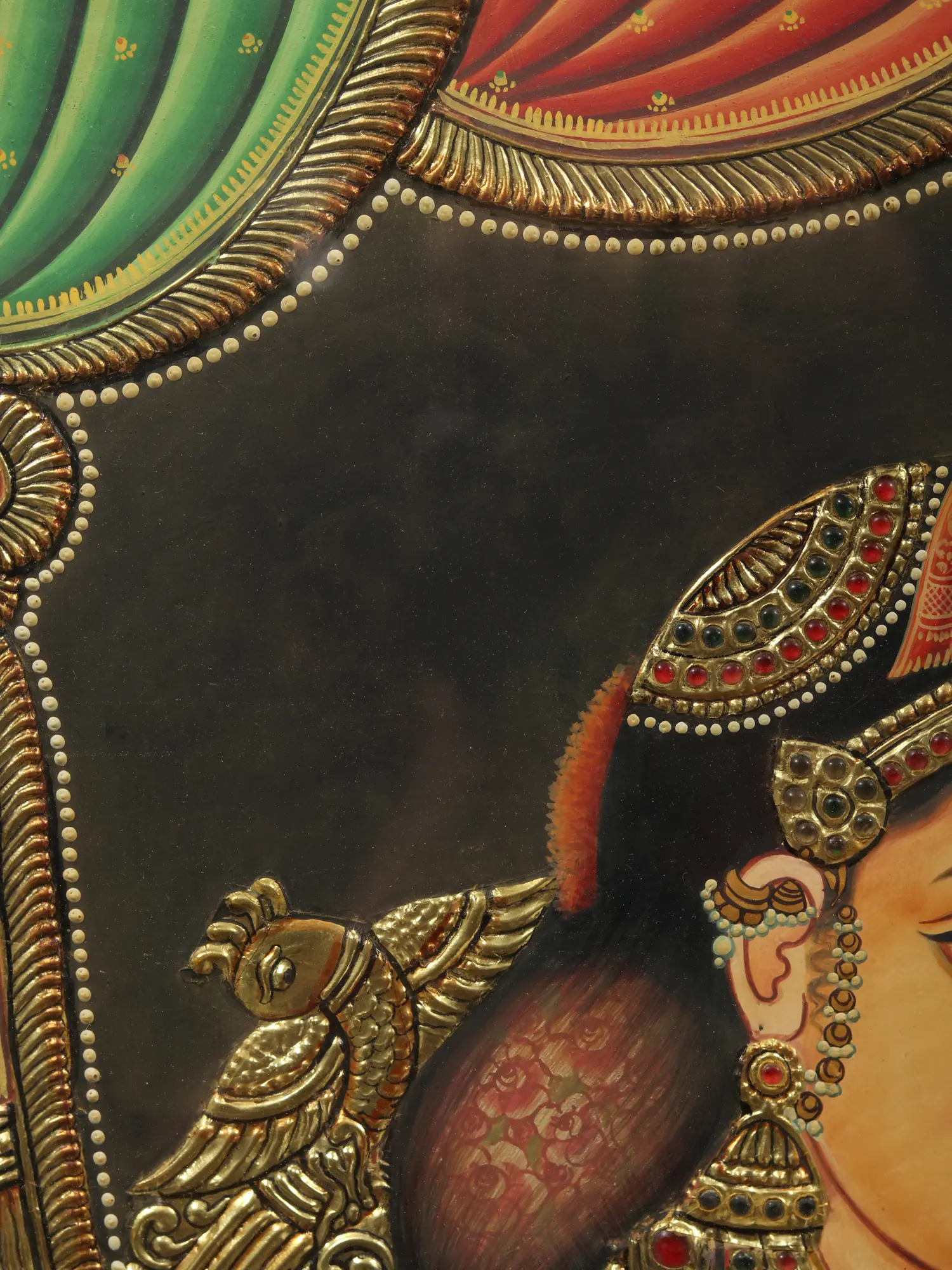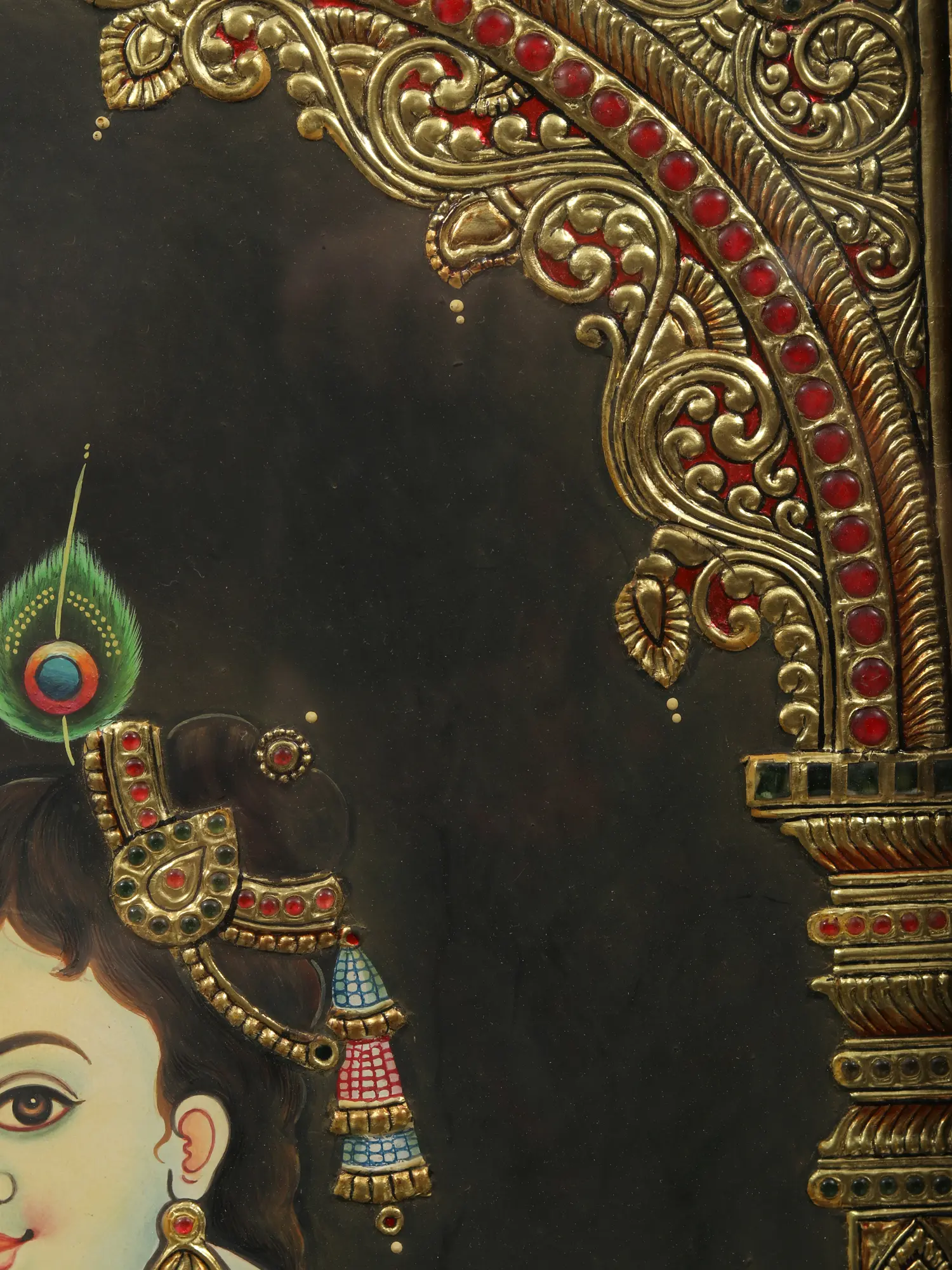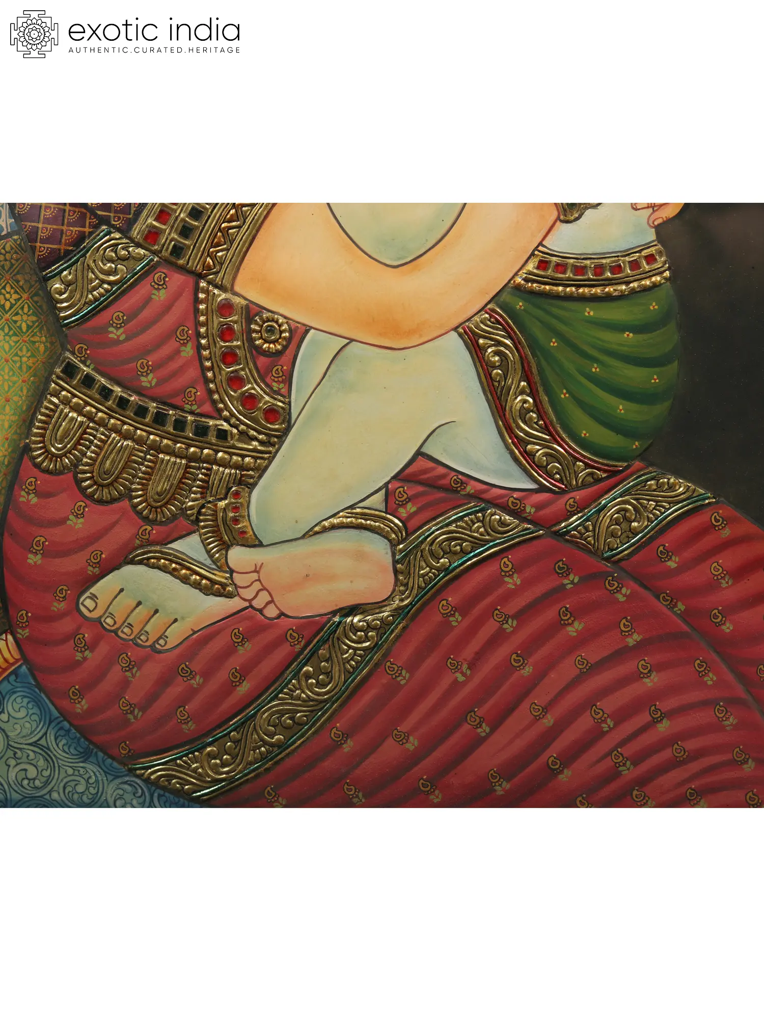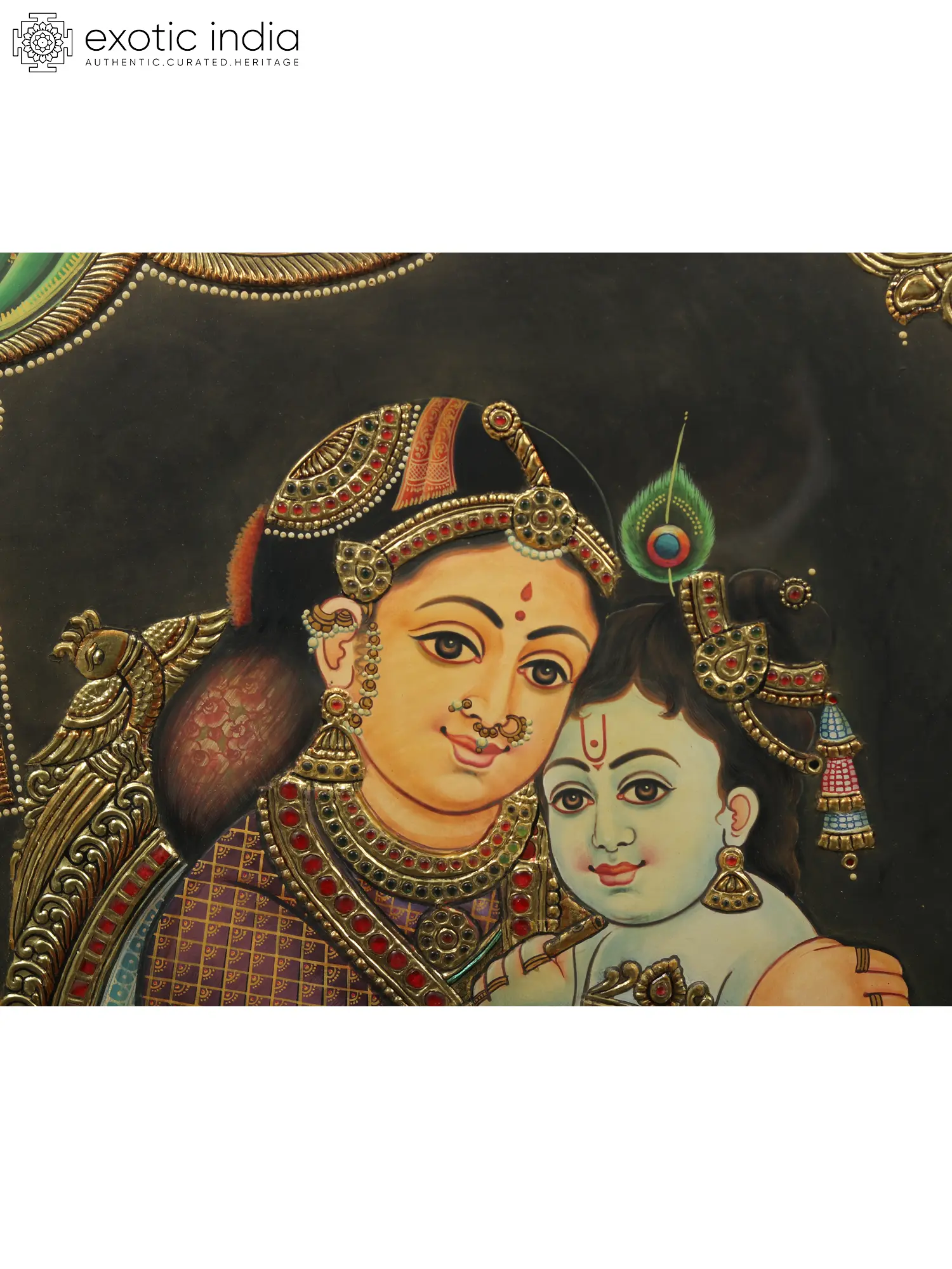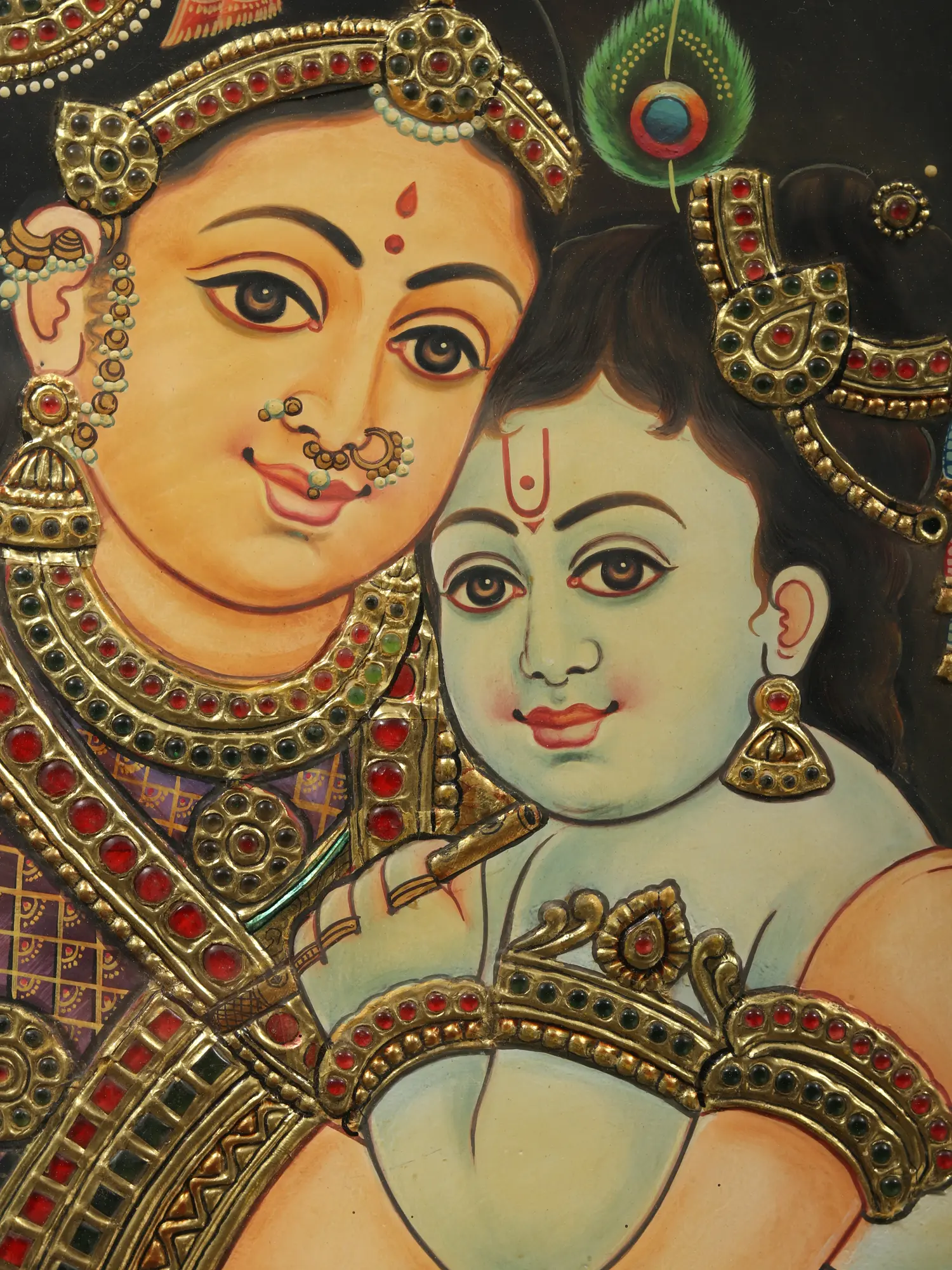 With soft hues and traditional iconography that recreates the aura of vintage Tanjore paintings, the artwork is infused with a gentle life through the loving gaze of Yashoda and Krishna, both adorned in traditional ornaments.