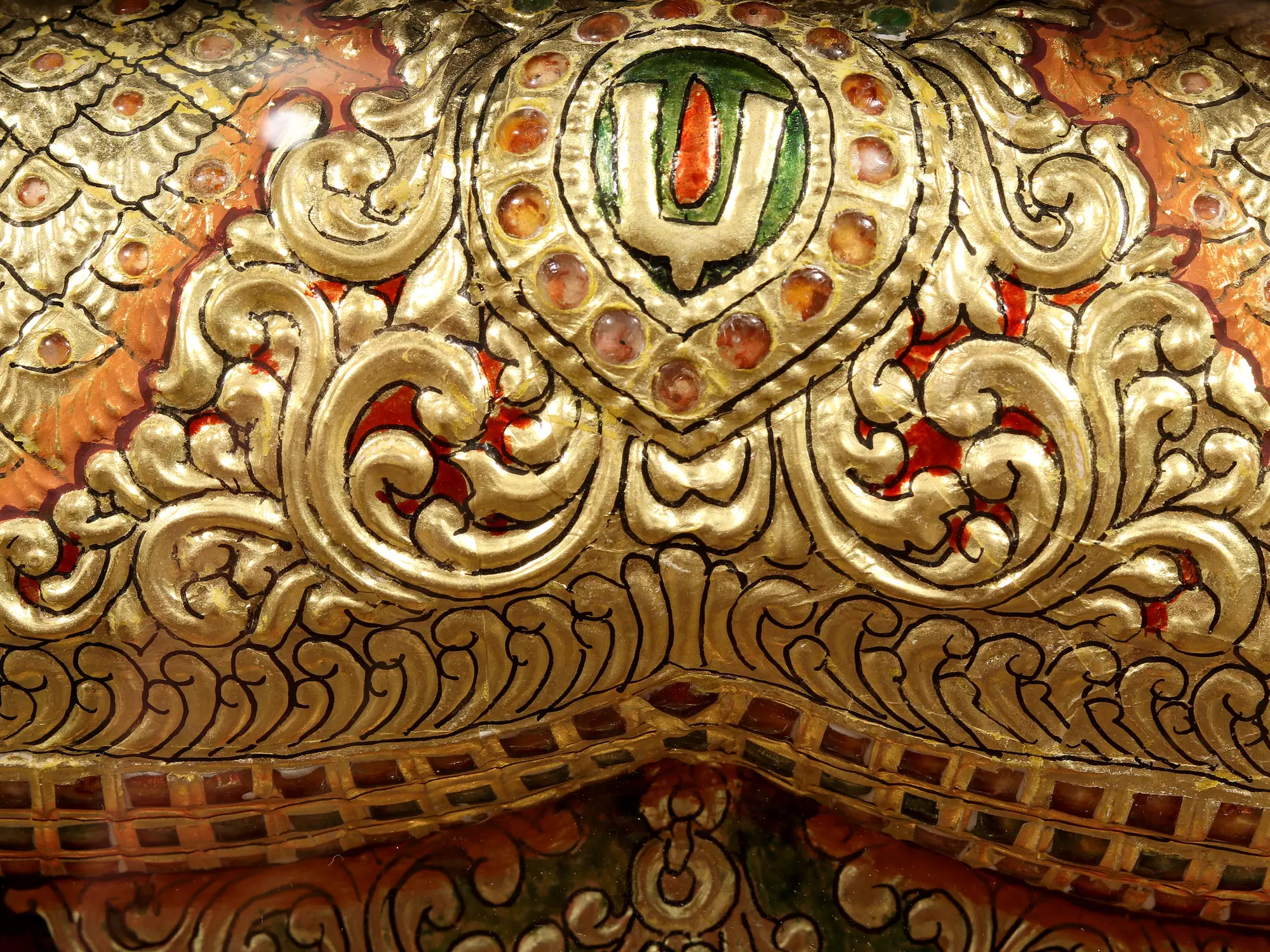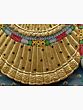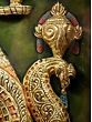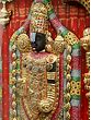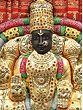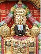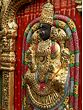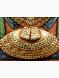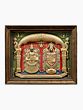 Sri Tirupati Balaji is the supreme manifestation of the divine power in the Tamil Bhakti tradition where he is revered as the cosmic guardian deity, who with Devi Padmavathi nourishes Brahma’s creation. Presented in this exquisite Tanjore painting in the forms of heavenly and sacred icons- Puja murti, Balaji, and Padmavati radiate energy, grandeur, and bliss with their presence. Both icons are ornately covered in jewelry, and dressed regally. A charming red drapery behind them has been painted artistically, giving the whole scene a three-dimensional appearance due to the variation in the shades of red.