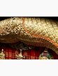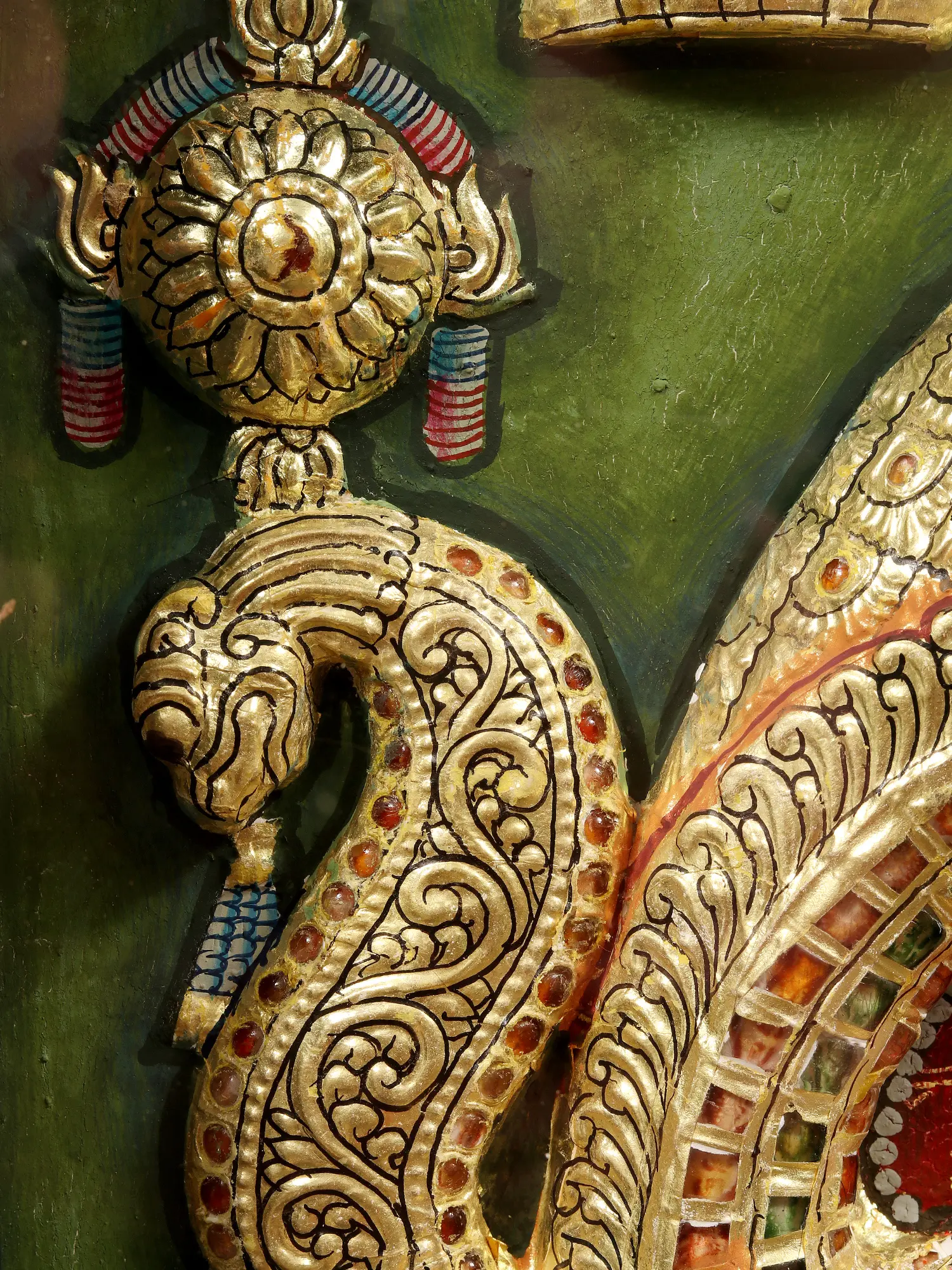 The icons are installed inside a splendid golden Puja-sthala, created with the technique of embossing that enhances the three-dimensional effect of the painting. A faint green surrounds this image, with four lamps- two in the foreground and two in the upper section, beautifully throwing hints of light on the space. Encased within an antiquated teakwood frame, this Tanjore painting brings the potency of Tirumala with the rich aesthetics of India, to your home.