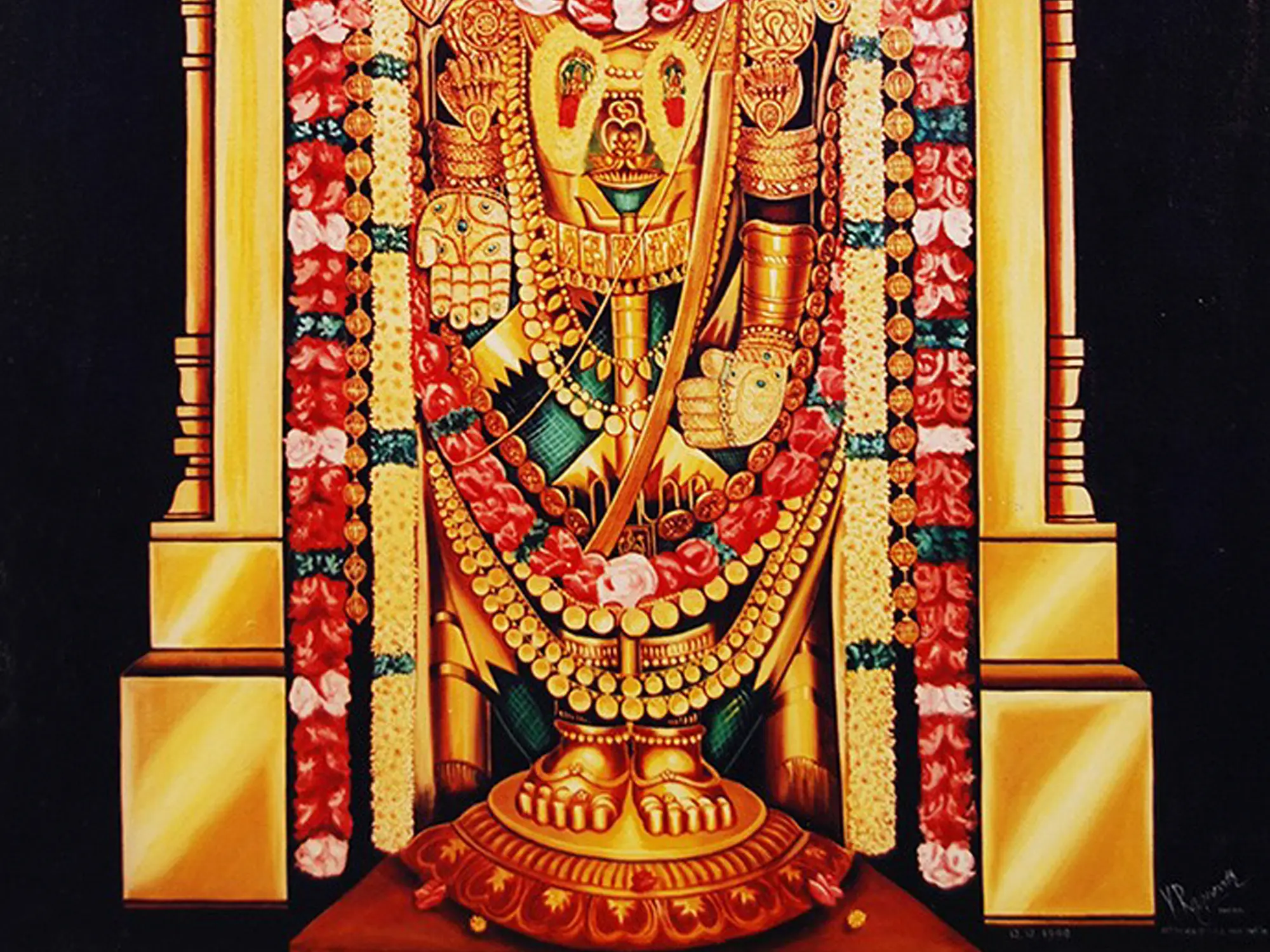 Just like Lord Balaji takes people from darkness to enlightenment, V. Ragunath's Lord Balaji Oil on Canvas painting depicts the glorious picture of Lord Balaji against a black background, as if he is shielding his devotees from the darkness.