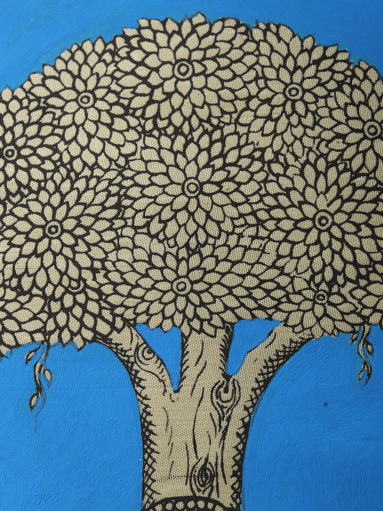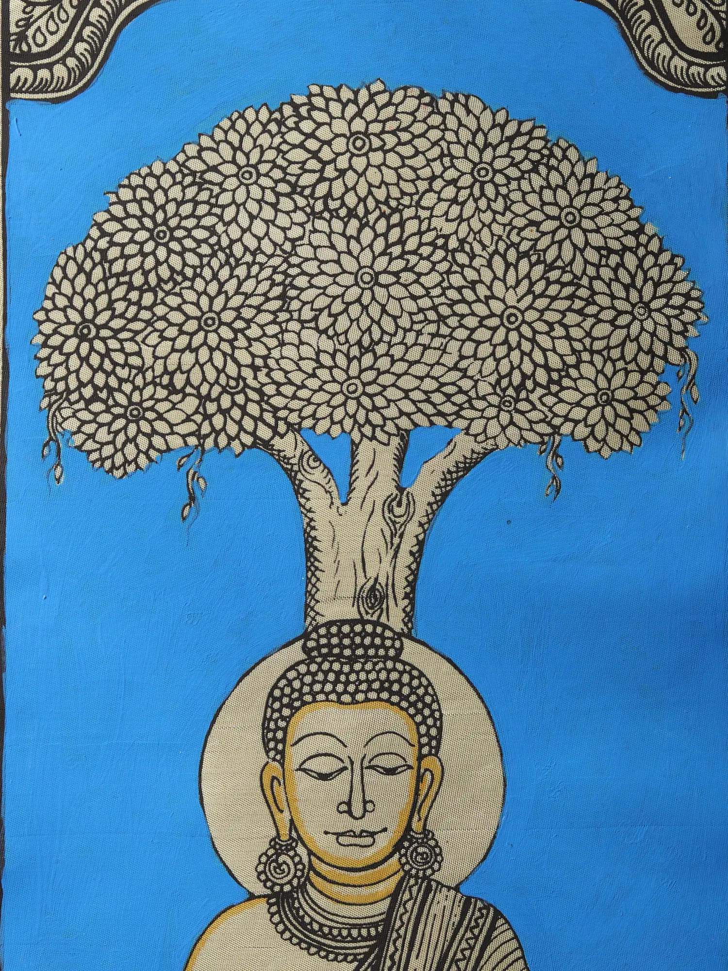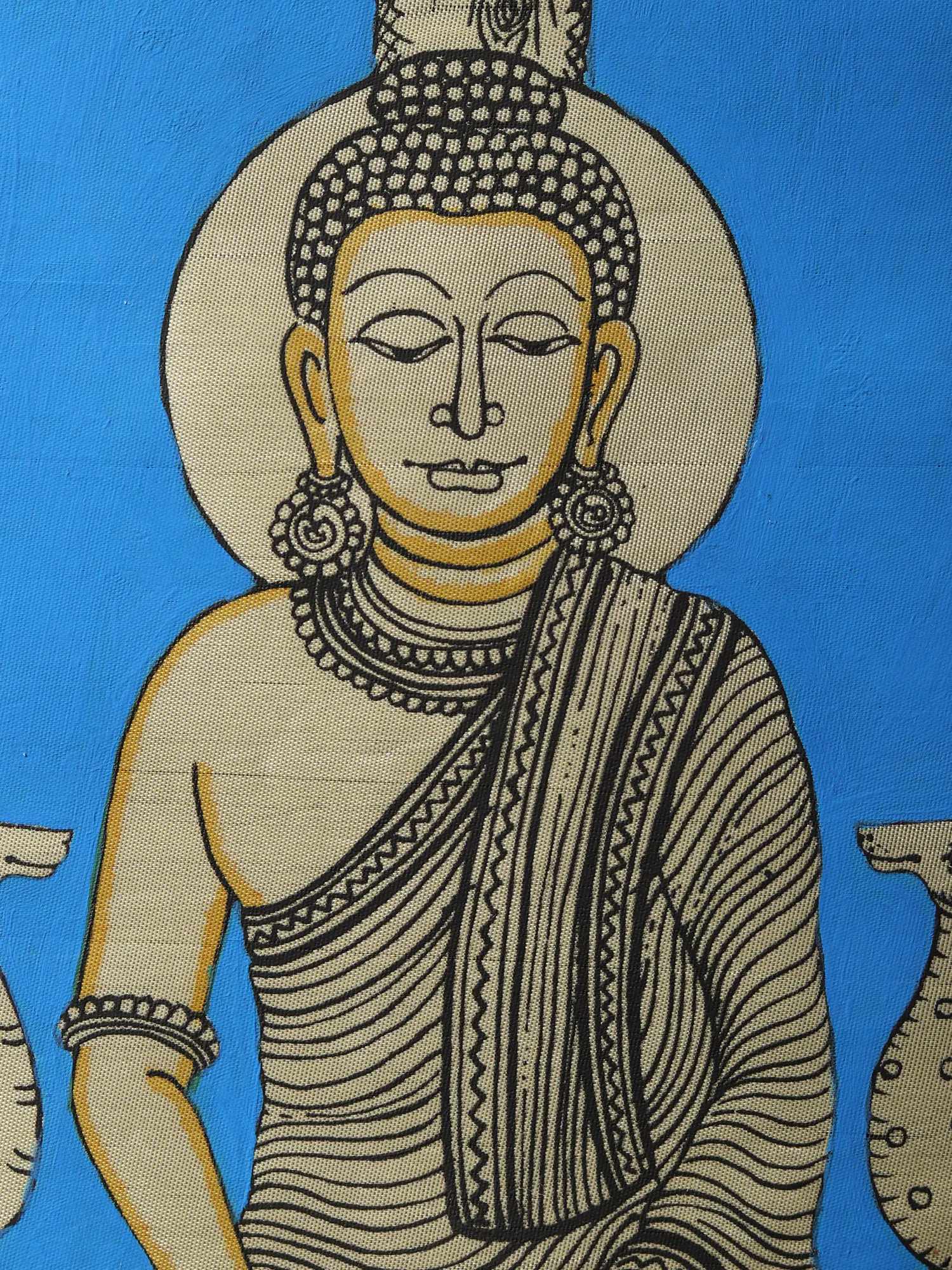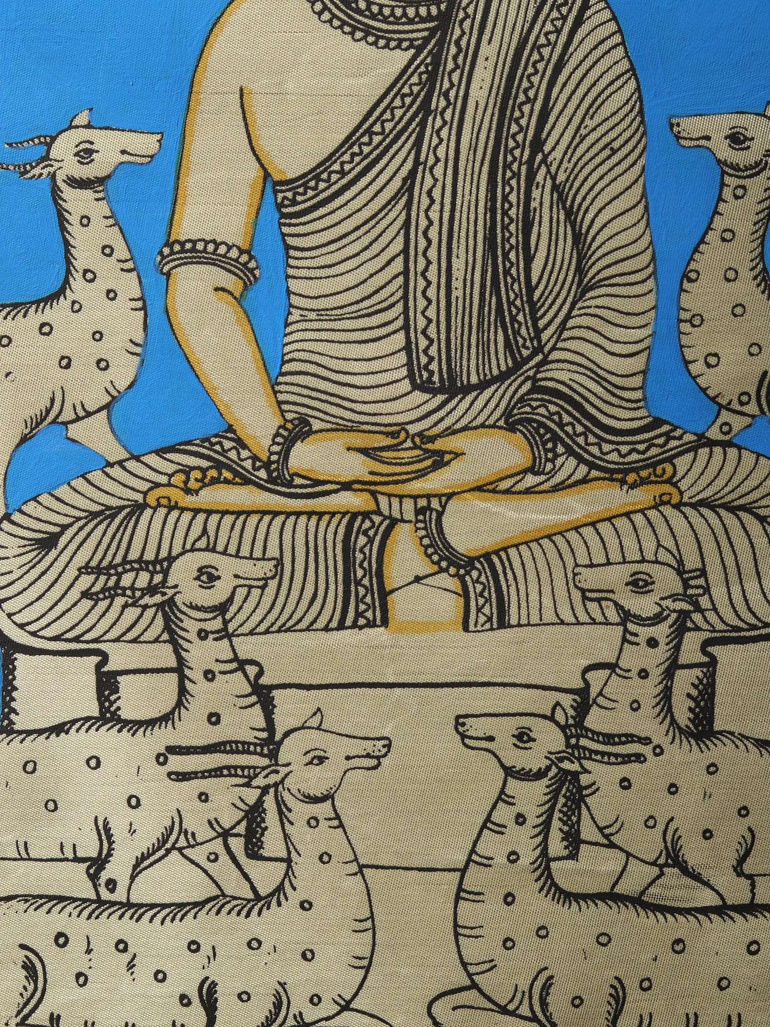 This Lord Buddha Seated Under the Bodhi Tree Pattachitra Painting masterfully captures this narrative. The watercolor on silk technique enhances the ethereal quality, while the blue background accentuates the divine atmosphere. The use of black lines skillfully outlines the figures, drawing attention to the tranquil Buddha beneath the intricately crafted Bodhi Tree. The stylized and graceful depiction of deer adds a touch of grace to the scene.