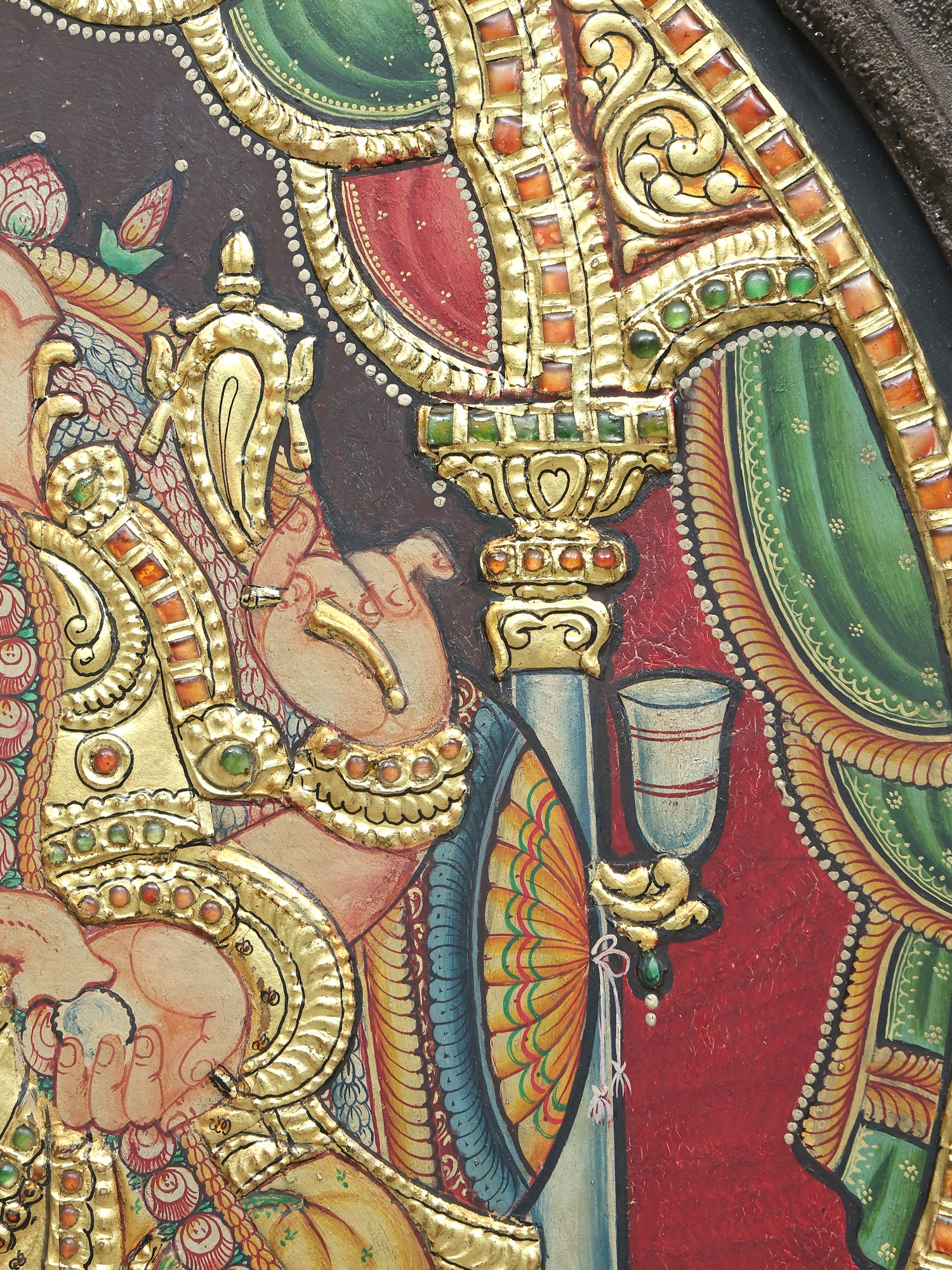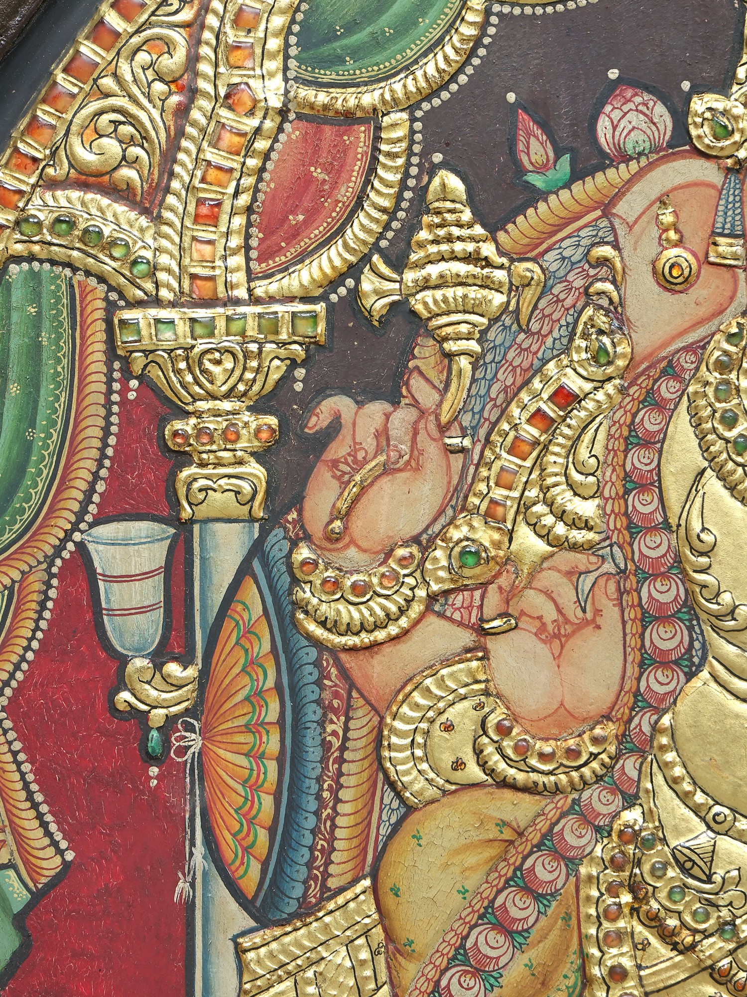 Lord Ganesha Seated on Throne | 24 Karat Gold Work | Framed Tanjore Painting