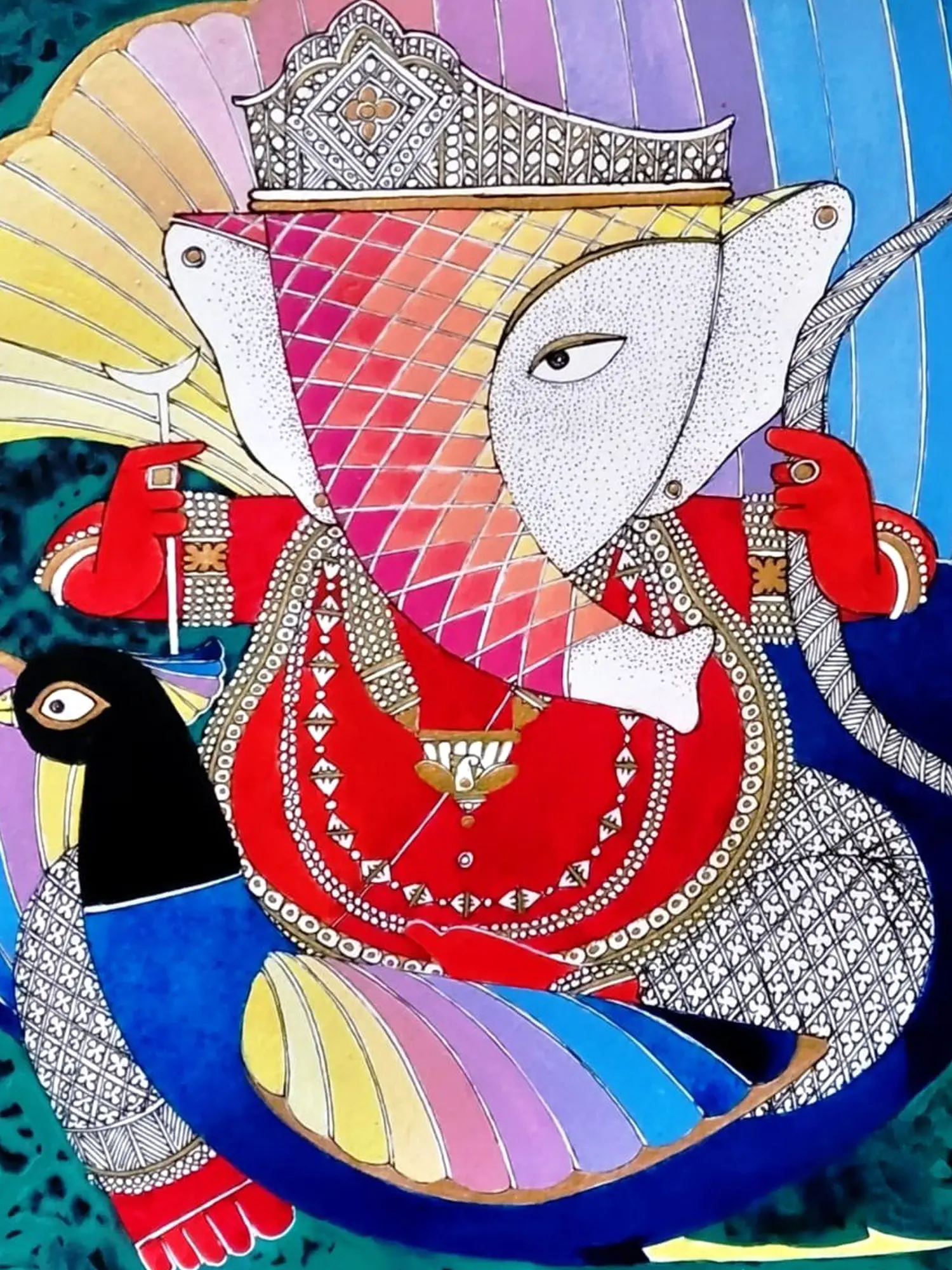This depiction draws inspiration from the rich tapestry of Hindu mythology, specifically representing Lord Ganesha, the Remover of Obstacles and the patron of arts and sciences. The artist imbues the form with a sense of ancient wisdom and divine grace, connecting you to centuries of cultural heritage and spiritual devotion. The inclusion of the peacock, often associated with divine beauty and royalty, further enhances its auspicious symbolism.
