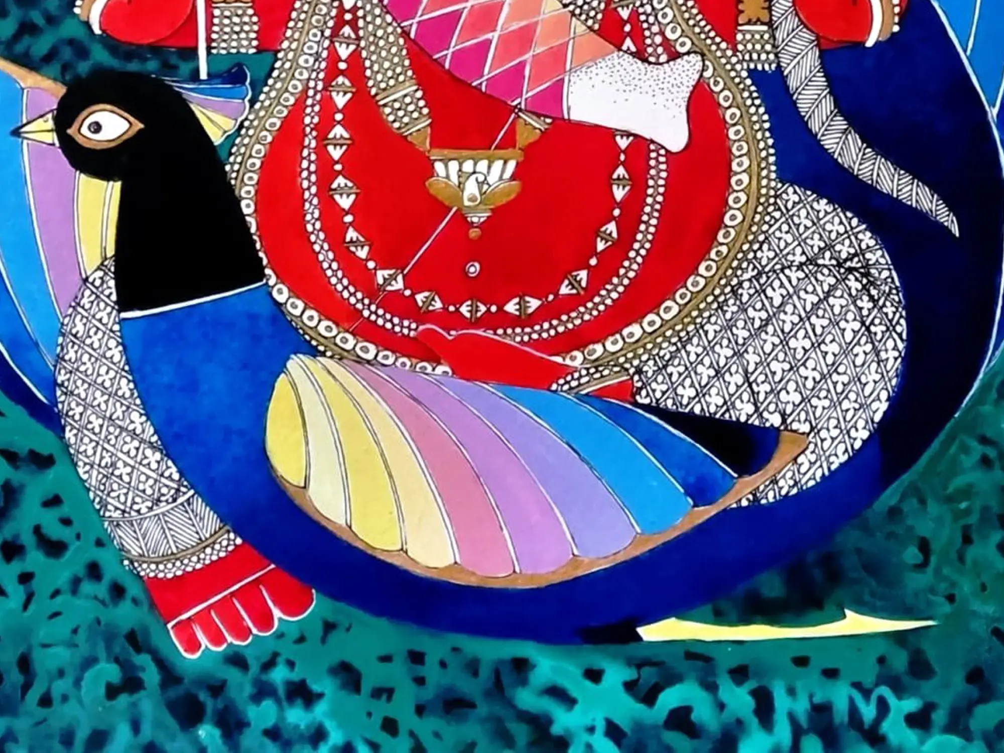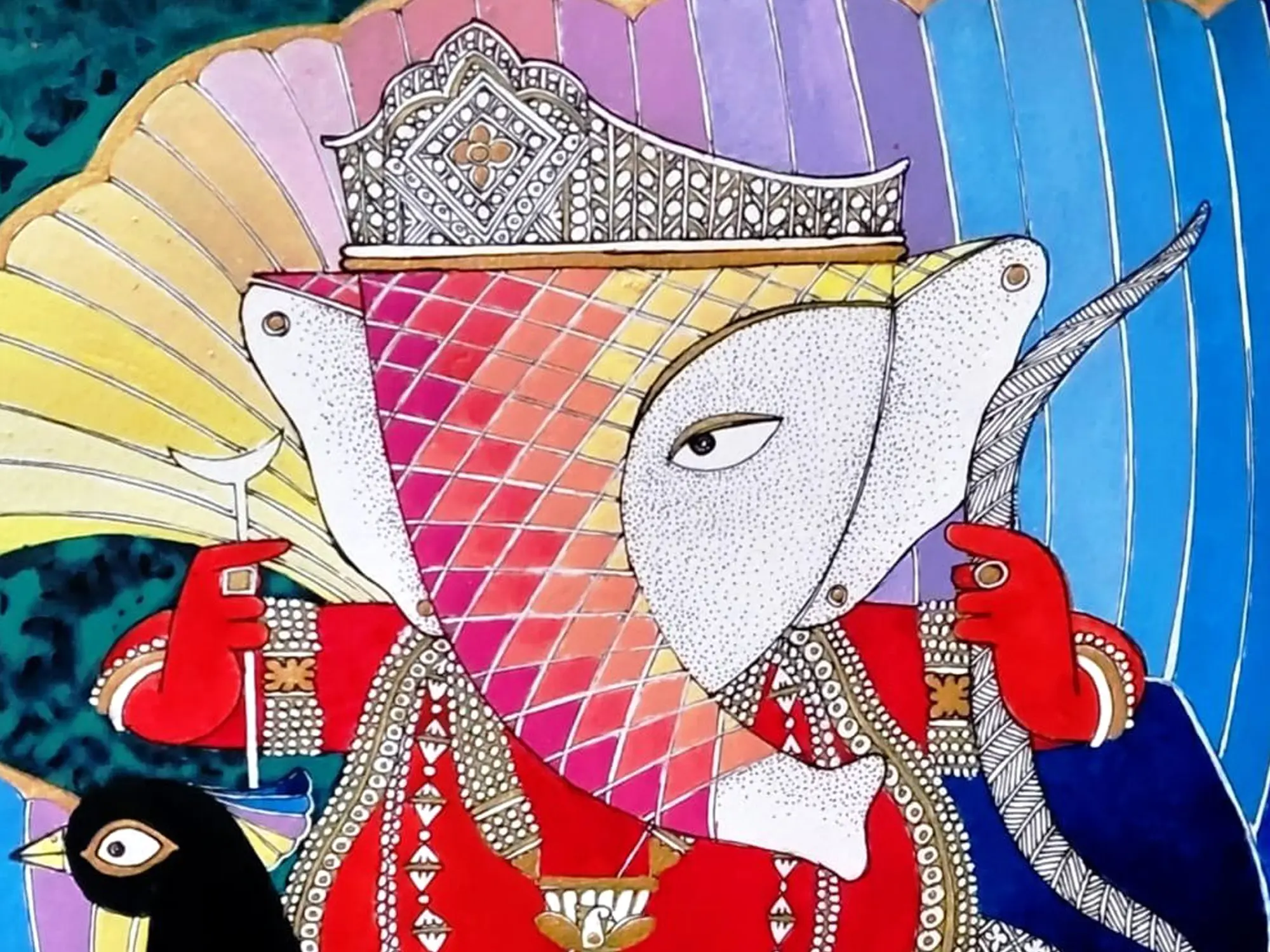 The vibrant hues, from the jewel-toned red robes to the rainbow gradient of the fan-like backdrop, create a striking visual narrative. You'll notice the delicate ornamentation adorning the deity, each detail rendered with precision. The serene yet powerful gaze draws you in, while the presence of the intricately depicted peacock adds a layer of symbolic grace.