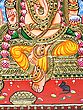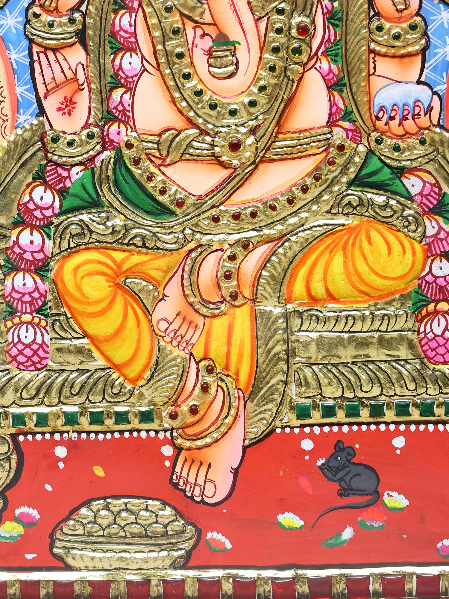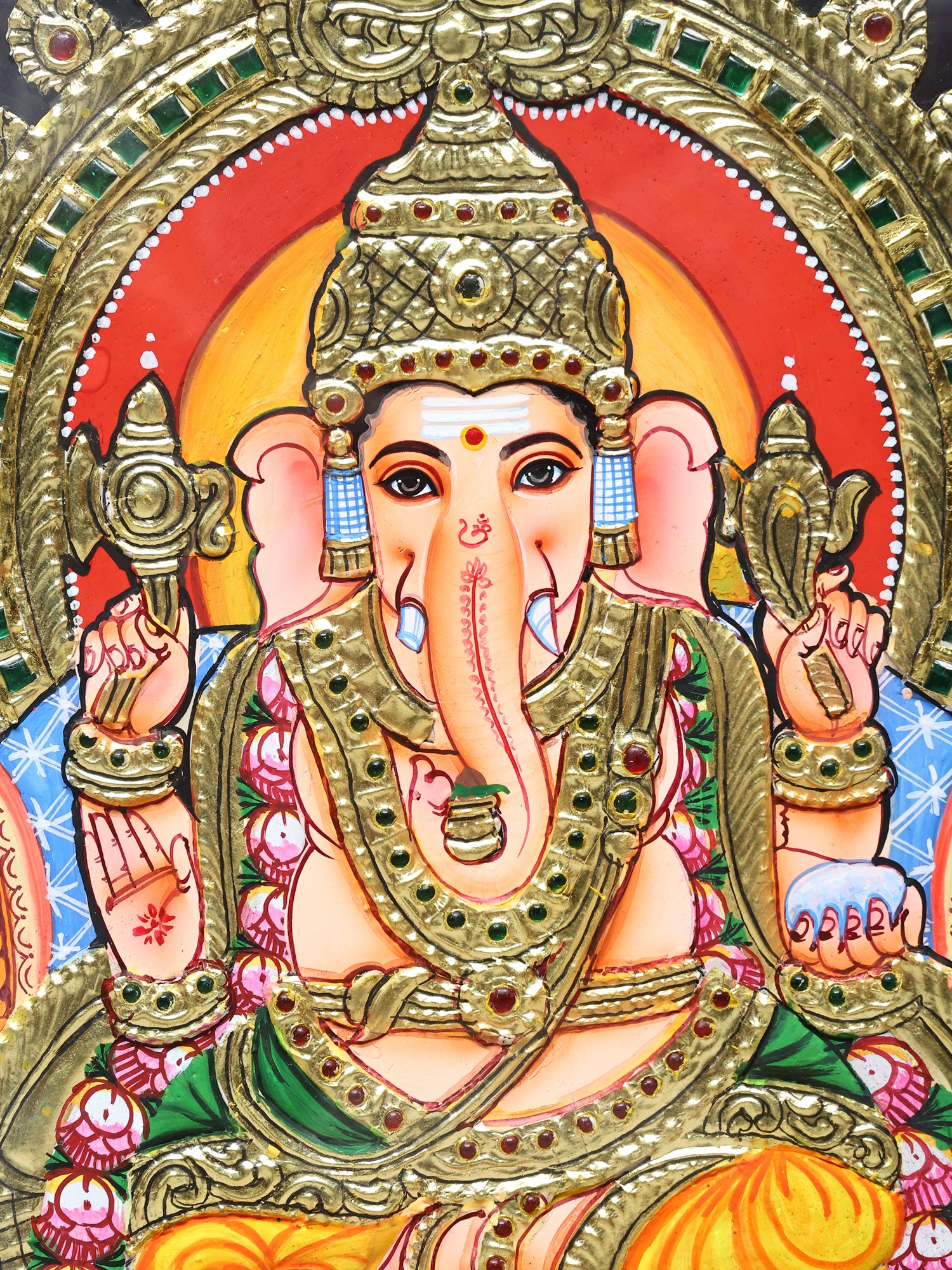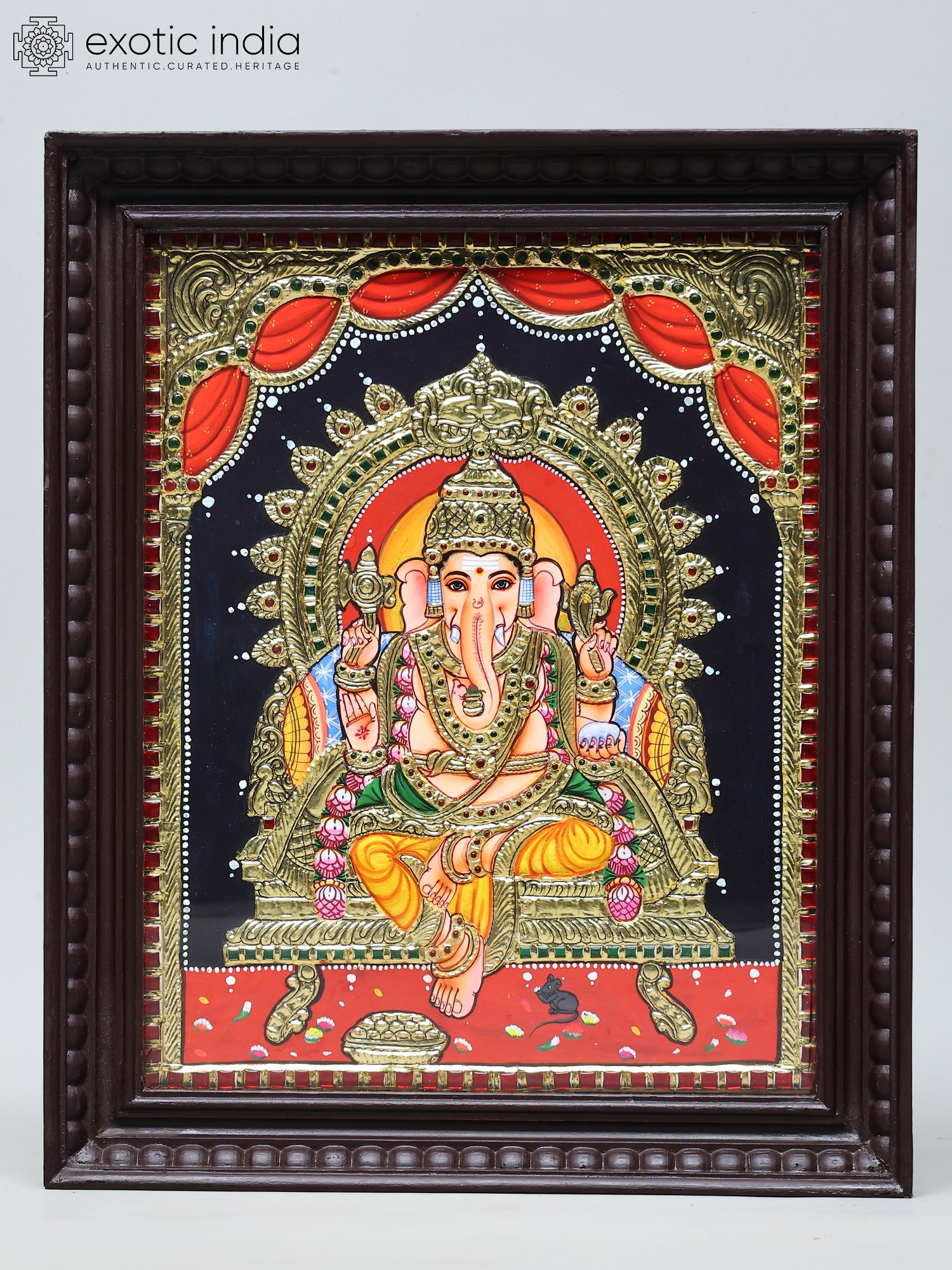 Lord Ganesha is seated upon a magnificent throne, a Kirtimukha throne, no less. In Hindu iconography, the Kirtimukha, or "Face of Glory," is a fearsome, often mask-like face with a gaping mouth, from which foliage or other decorative elements appear to stream. It is a symbol of protection, warding off evil spirits and negative energies, and is often seen as representing the cosmic power of the divine. Its inclusion here signifies that Lord Ganesha is seated on a throne not only of power and majesty but also of supreme protection and auspiciousness. The throne itself is richly embellished, reflecting the grandeur befitting a deity. Surrounding Lord Ganesha is a radiant halo, further emphasizing his divine essence and the sacred energy he embodies. The meticulous layering of colors and the application of gold create a three-dimensional effect, making the deity appear almost alive, poised to bestow blessings upon all who behold him. ––––––––––