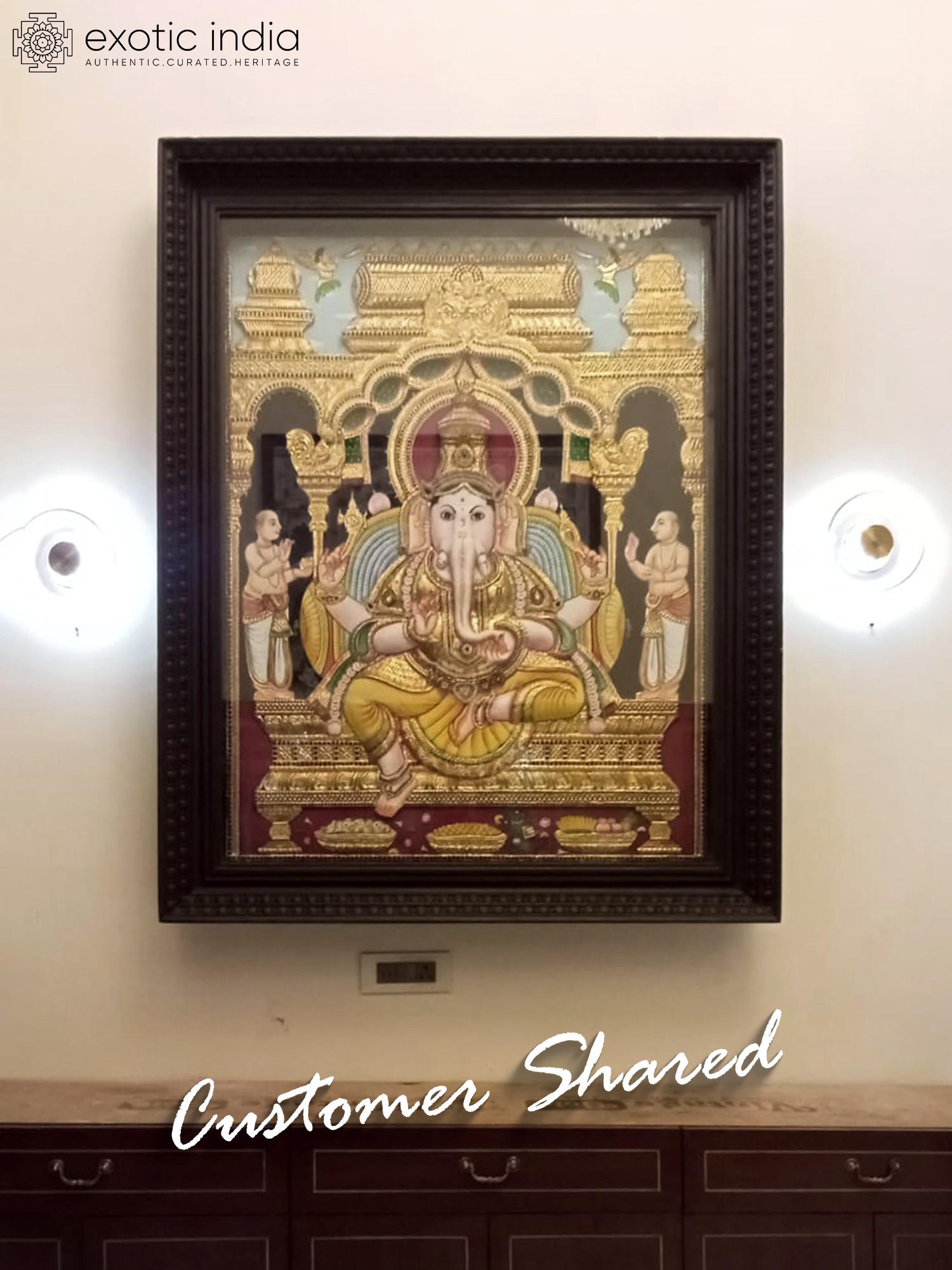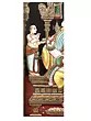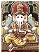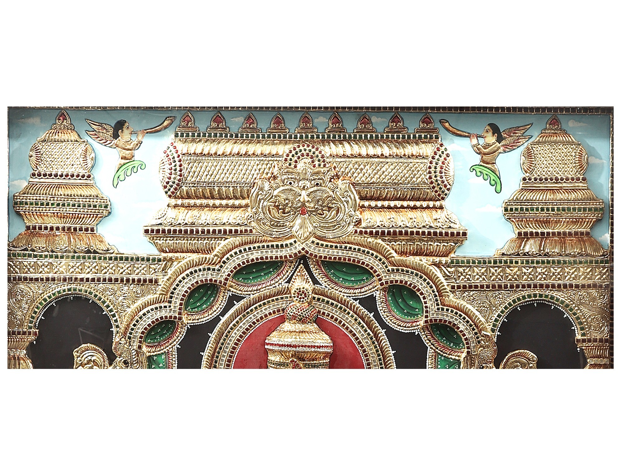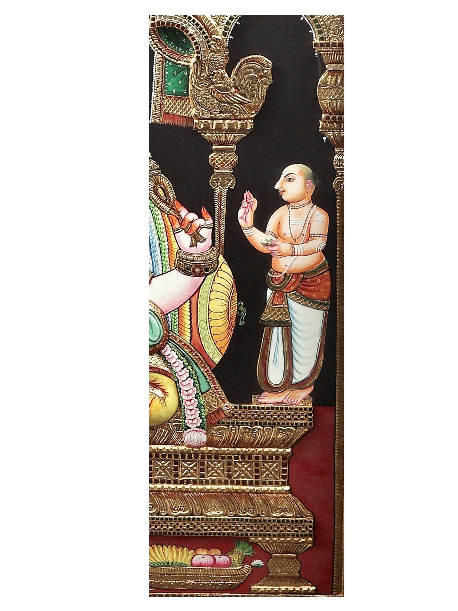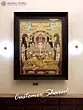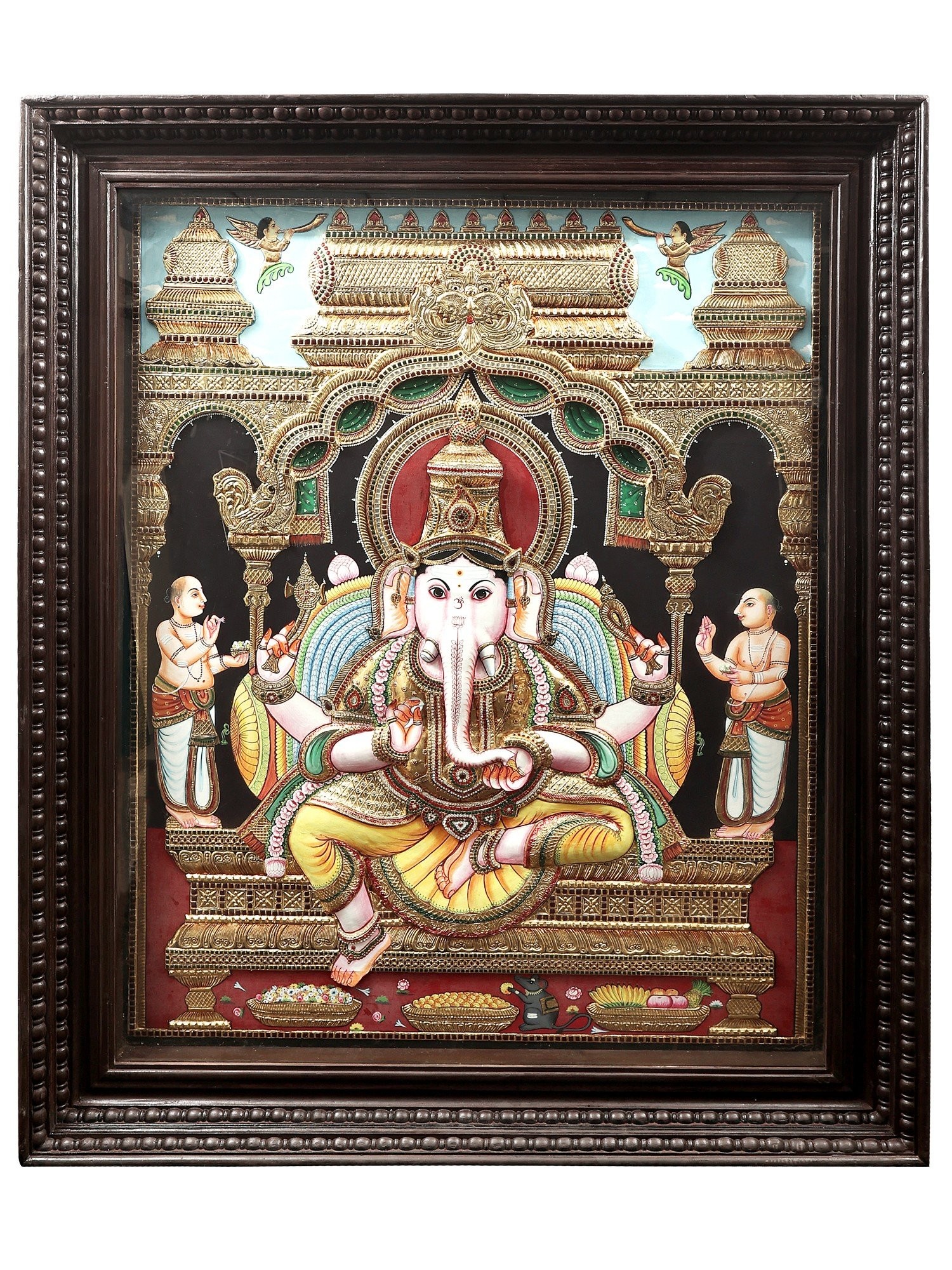 This is a real jaw-dropping Tanjore painting that gloriously portrays Ganapati, the leader of all the Ganas (attendants of Lord Shiva) seated on a huge throne. He has a head of an elephant and the body of a human and sits in Ardhapadmasana having four arms (chaturbhuja). Clad in a pitambar (yellow) dhoti down to his ankles, he is bedecked with several gold ornaments and adorned with a flower garland around his shoulders and a huge crown on his head. With his two upper arms, he holds an elephant goad and the noose. The lower right hand holds his broken tusk for which he is also known as “Ekadanta” (having one whole tusk). His trunk is turned towards left which is held by the lower left hand. Two of his servants are worshiping the lord and offering him flowers. Ganesha’s mount “Mooshak” can be seen sitting near his master’s lotus feet eating a laddoo. Up in the sky, two apsaras blow bugles to honor the Lord. The entire painting evokes a feeling of a grand celebration. Also, the way it has been decorated with 24 Karat gold and shining stones enhances the beauty of the artwork.