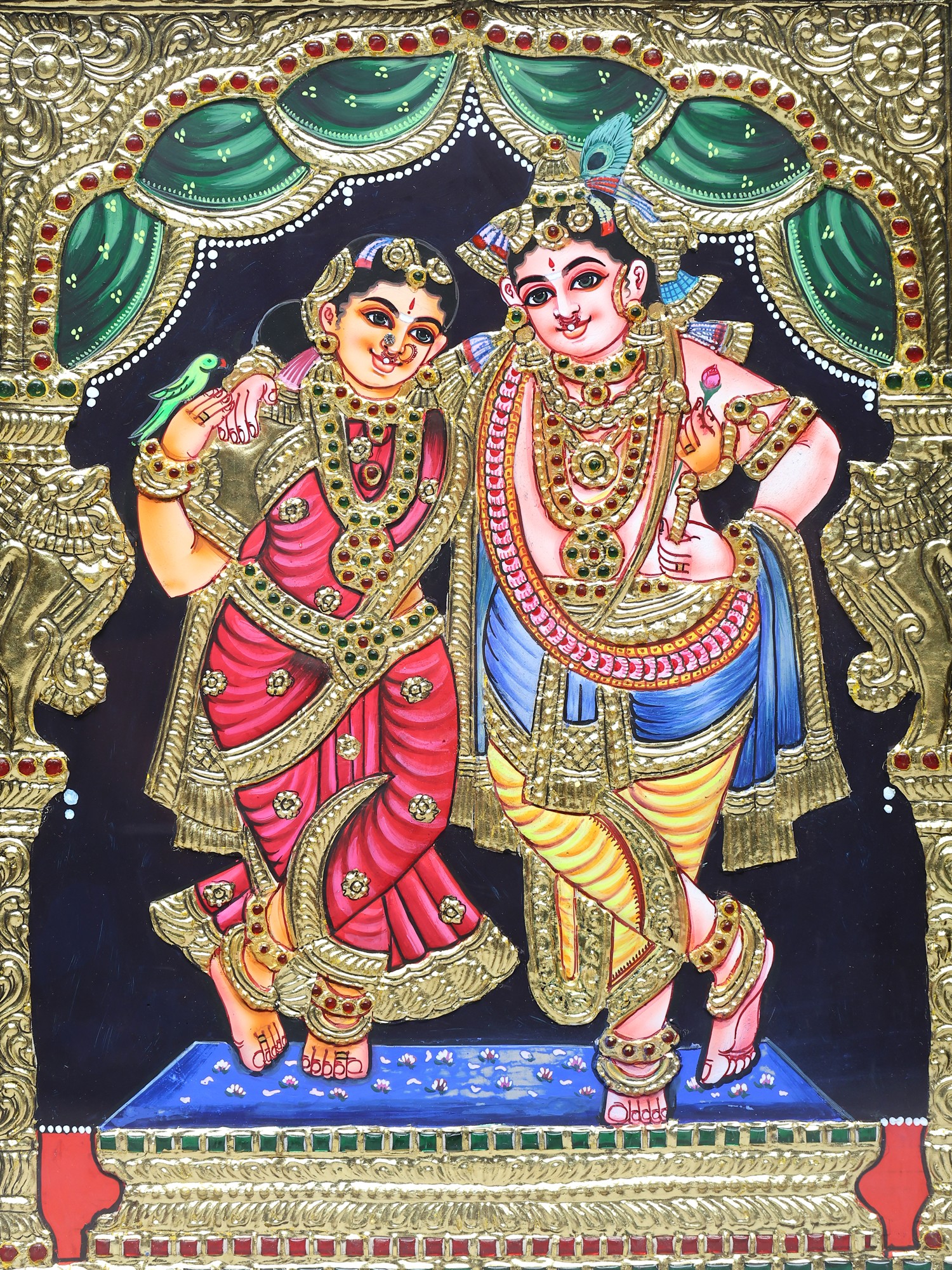 Standing Lord Krishna with Rukmini | 24 Karat Gold Work | Embossed Tanjore Painting with Vintage Frame
