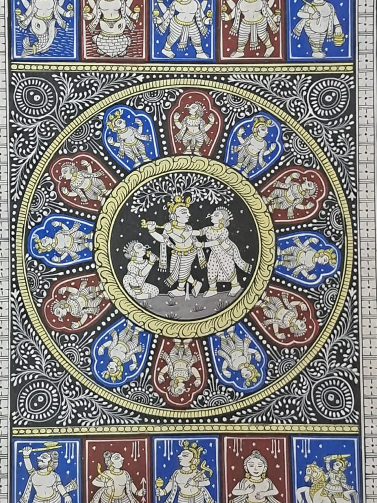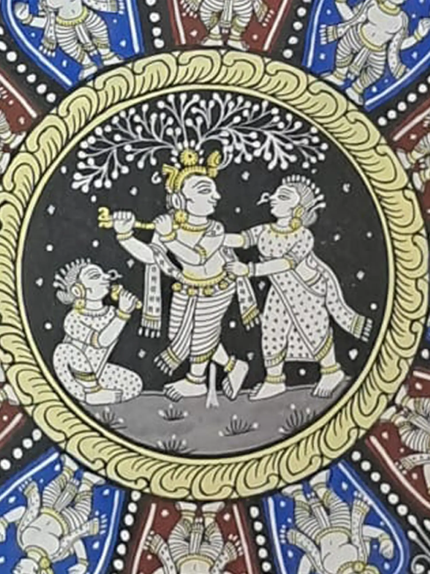 In this exquisite portrayal of Lord Krishna as Dashavatar, the divine incarnations of Vishnu come to life in a captivating tableau of colour and form. Crafted from natural stone colours, each avatar is rendered with meticulous detail and reverence, embodying the timeless wisdom and compassion of the divine. From the playful charm of Krishna to the solemn majesty of Rama, each aspect of Vishnu's incarnations offers profound insights into the nature of existence and the eternal quest for righteousness. This artwork serves as a reminder of the enduring presence of the divine within and around us, inspiring devotion and awe in equal measure.