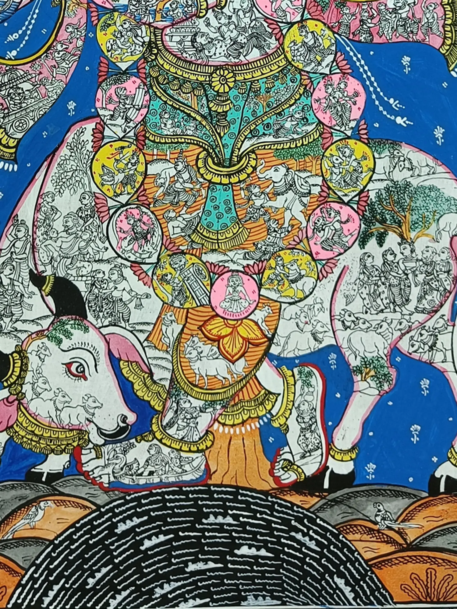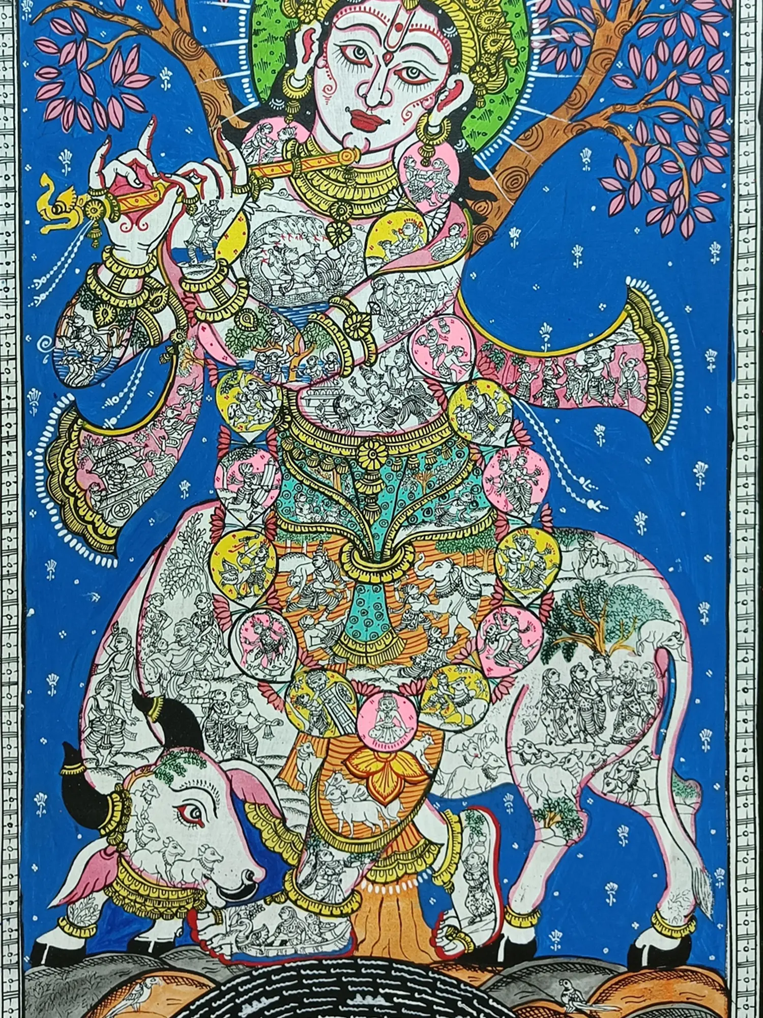 Sachikant's skillful use of natural colors enhances the vibrancy, making every detail come alive. The amalgamation of Krishna's various leelas on this canvas creates a visual symphony, where art transcends into a divine storytelling medium. This unique piece becomes a timeless and unparalleled expression of devotion, encapsulating the essence of Lord Krishna's enchanting leelas in a way that is unparalleled and one-of-a-kind.